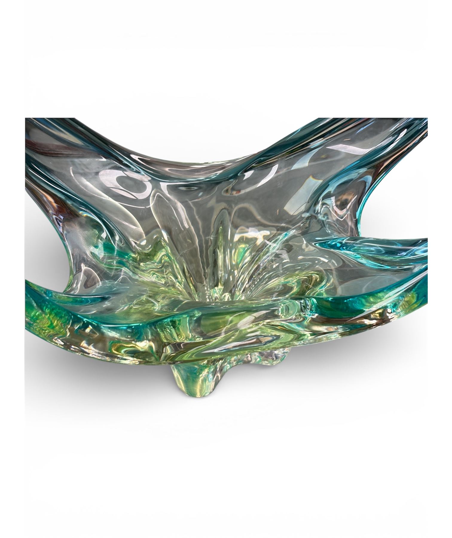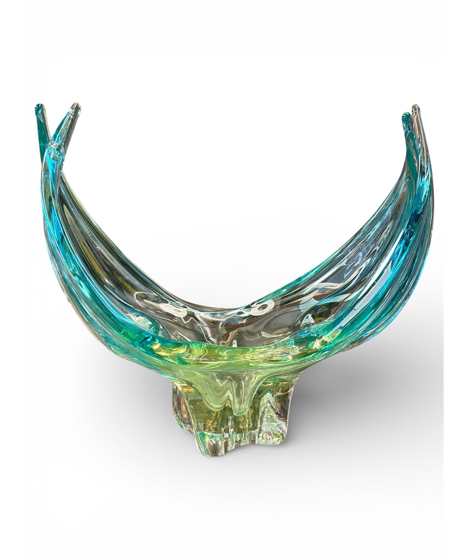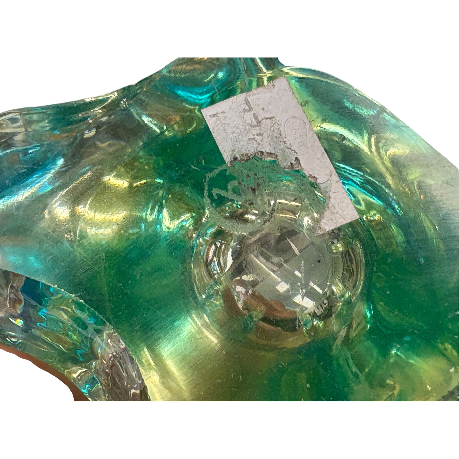 Chalet-style splash centerpiece art glass featuring a striking intricate design in vibrant green and blue tones. Stands 9.5 inches tall. Known for its flowing, dynamic form, characteristic of mid-20th-century Canadian artisan glassworks, including Chalet Artistic Glass.
