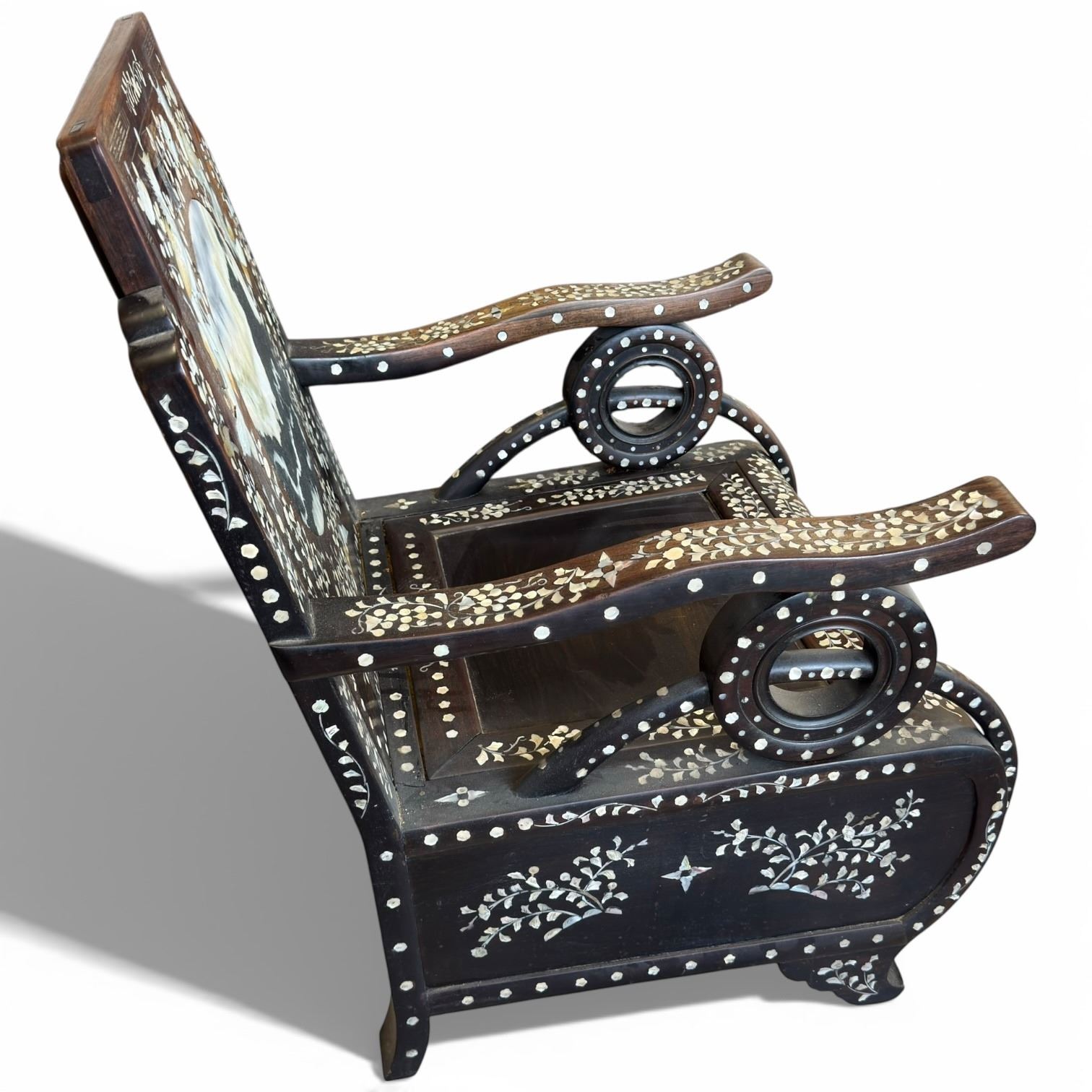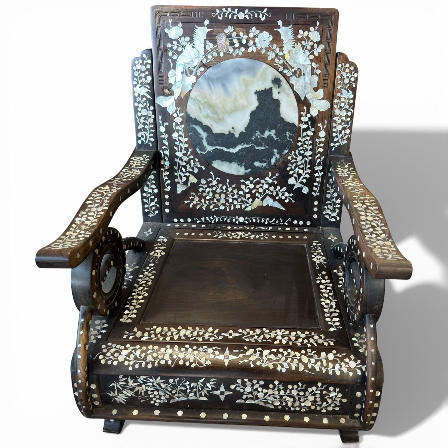 Chinese Arm Chair with Phoenix & Floral Mother-of-Pearl Inlay and Round Marble Inlay