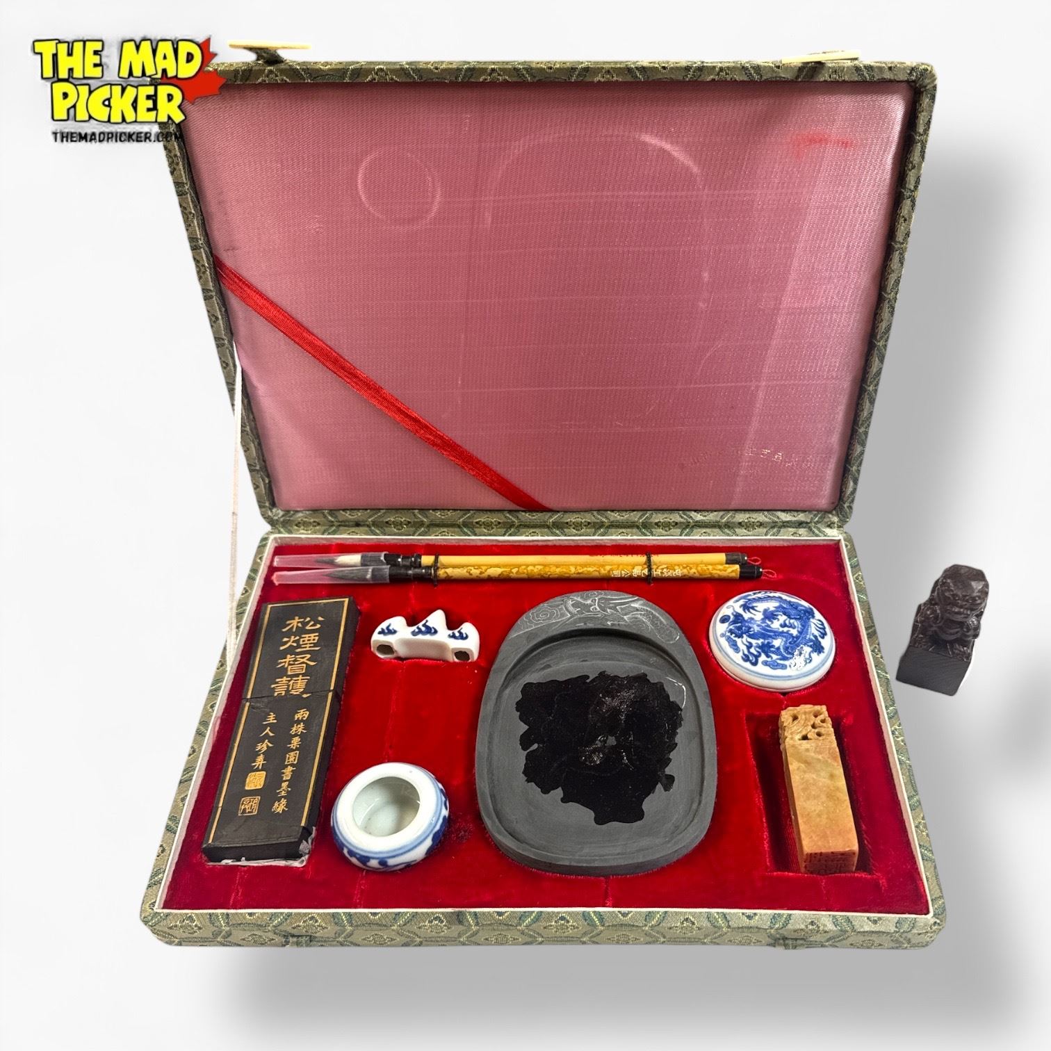 Chinese Calligraphy Set Four Treasures Ink Stone Brushes Ink Stick Brocade Box