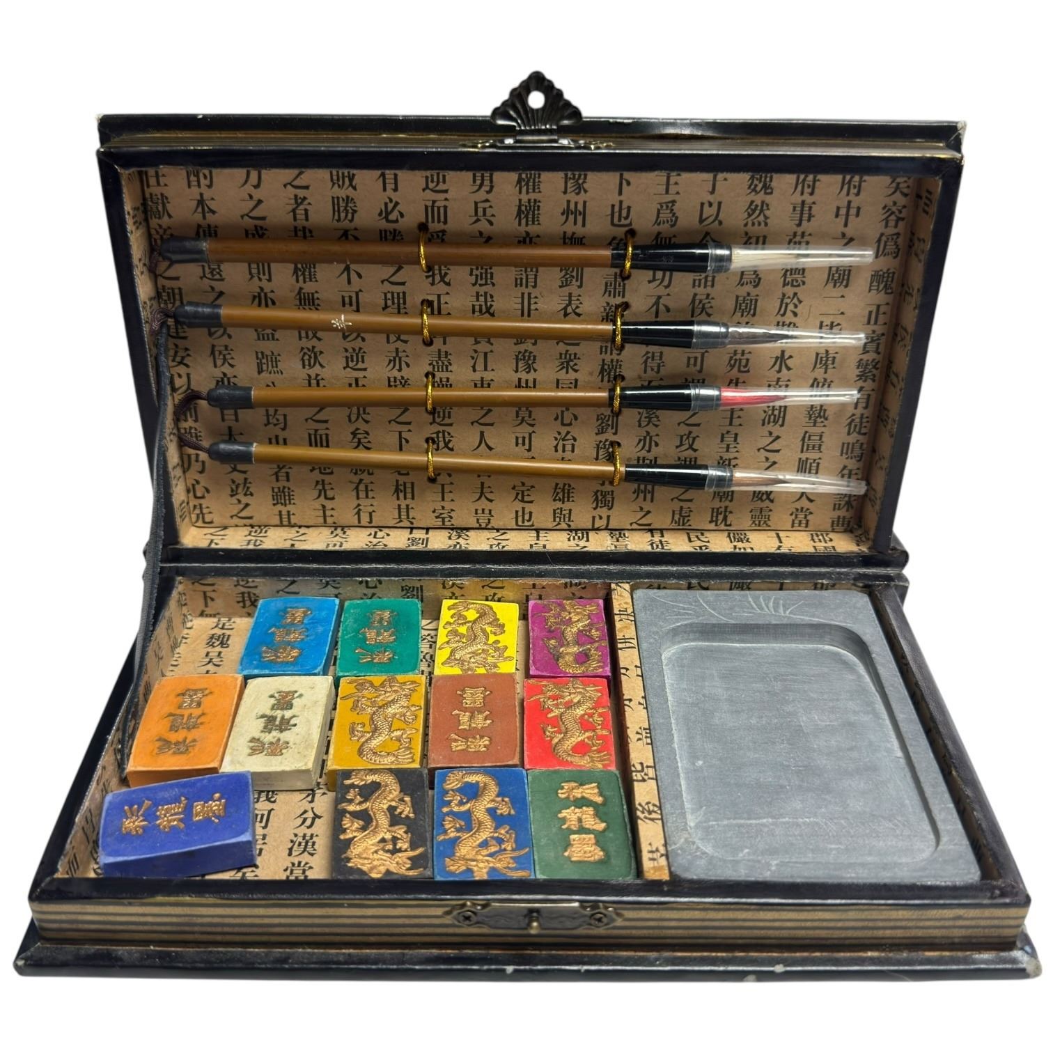 Chinese Calligraphy Set with 4 Brushes, Ink Stone and 13 Coloured Ink Sticks
