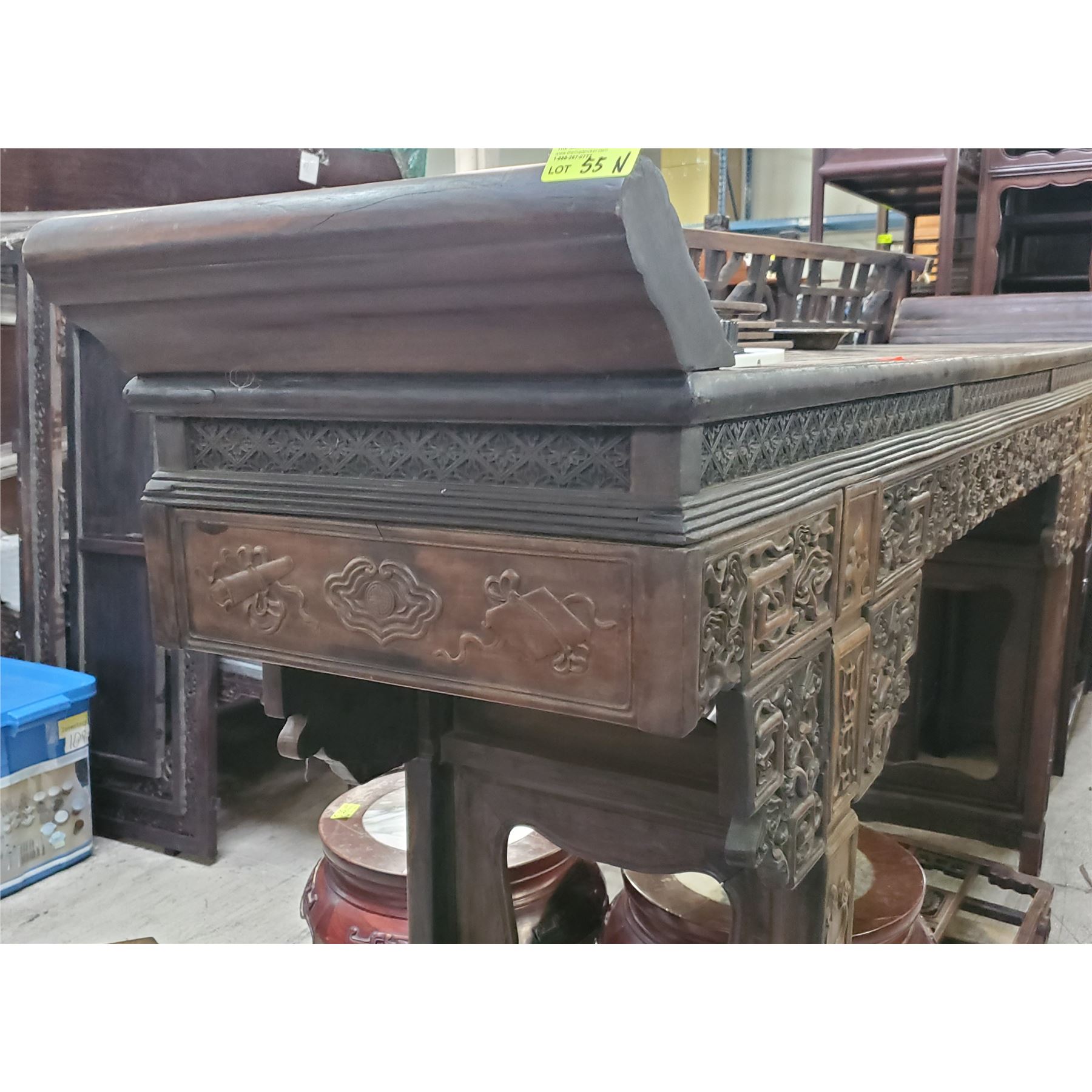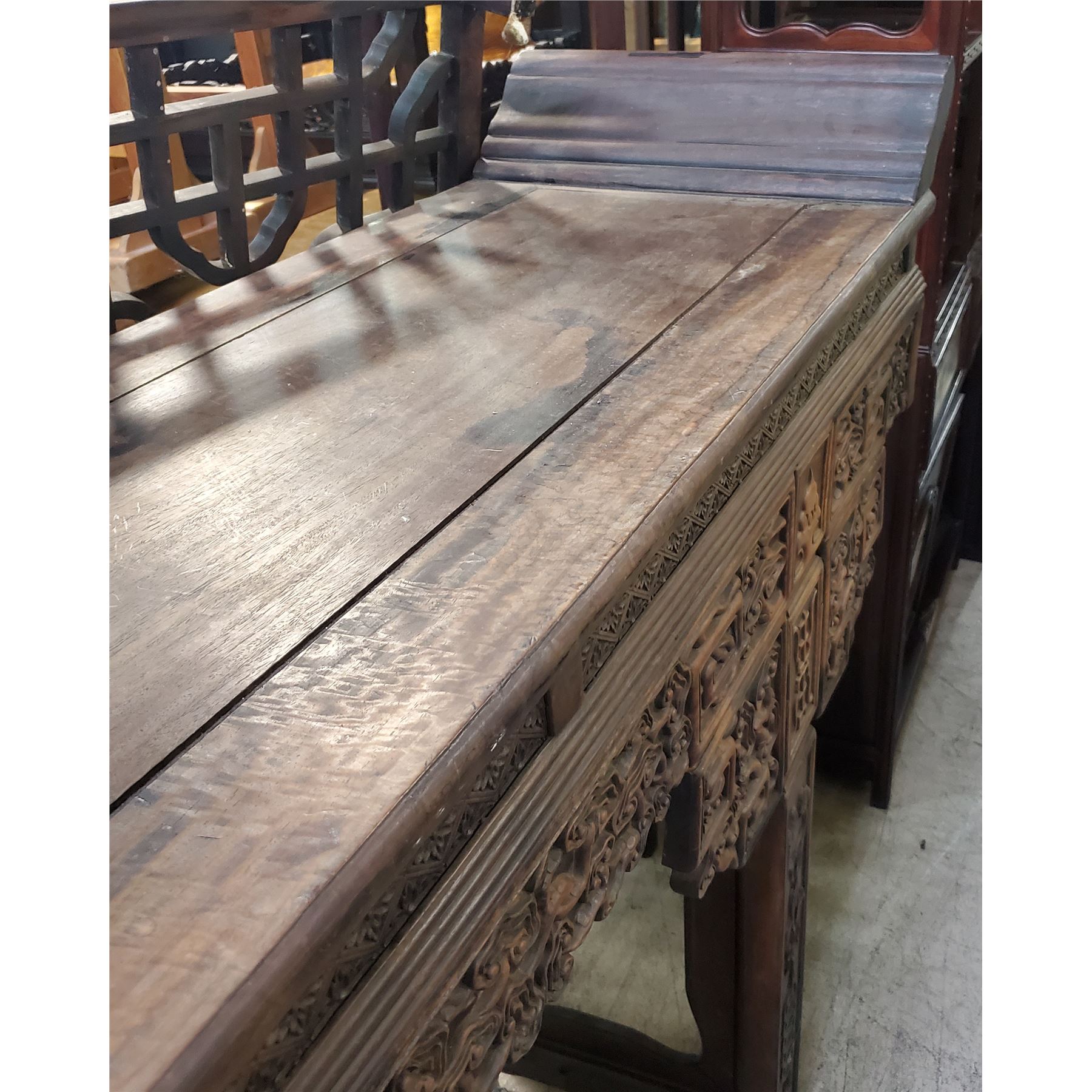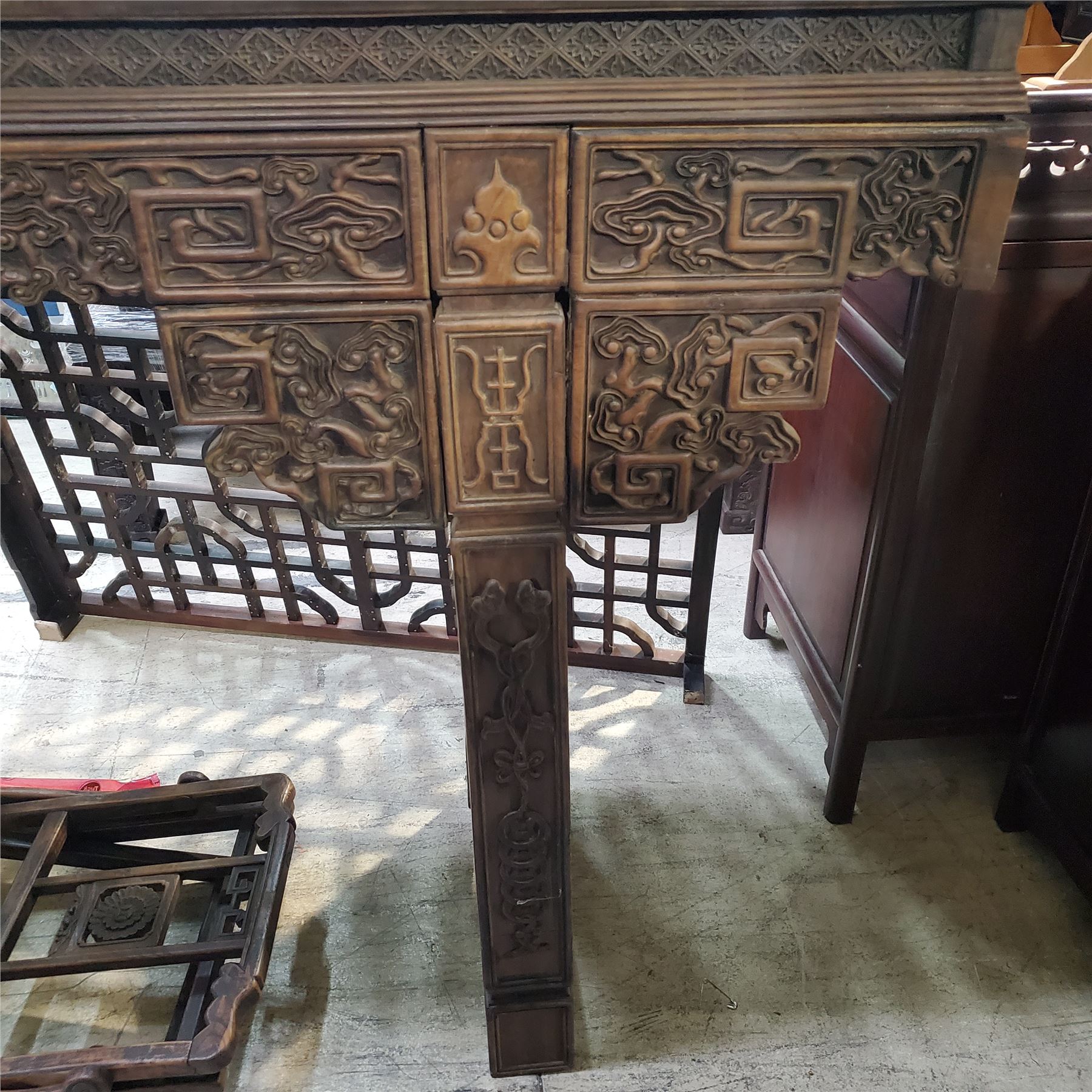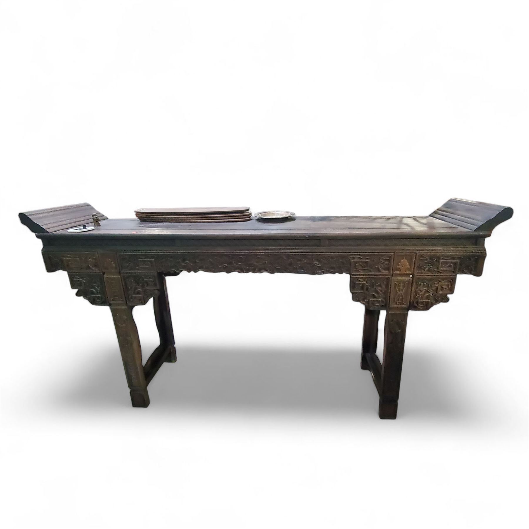 Chinese Hardwood Altar Table - with Upturned Ends and Shou & Cloud Motifs - Approx. H48.5" x W92" x D18"