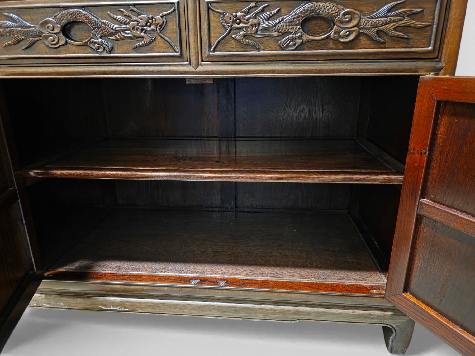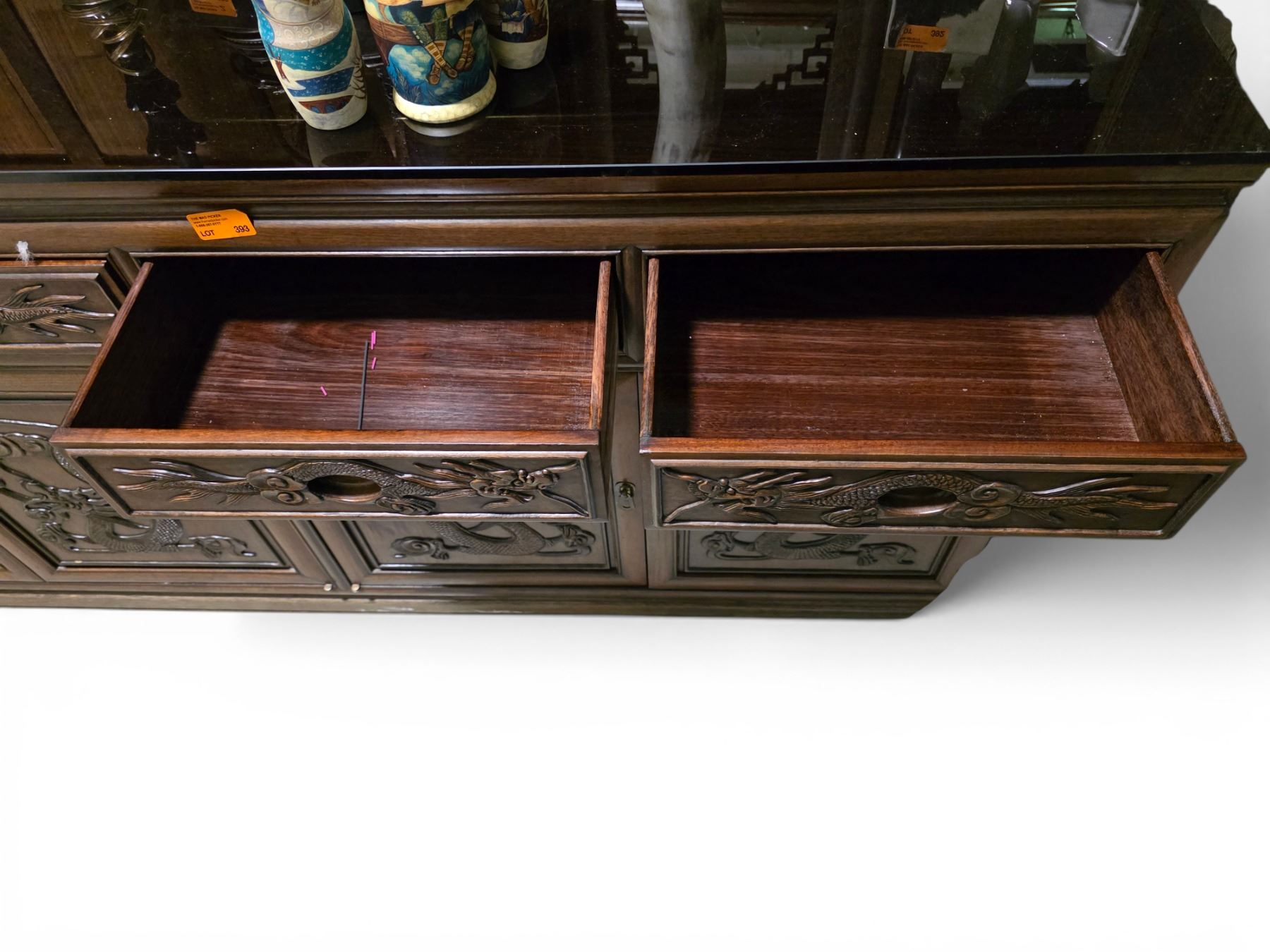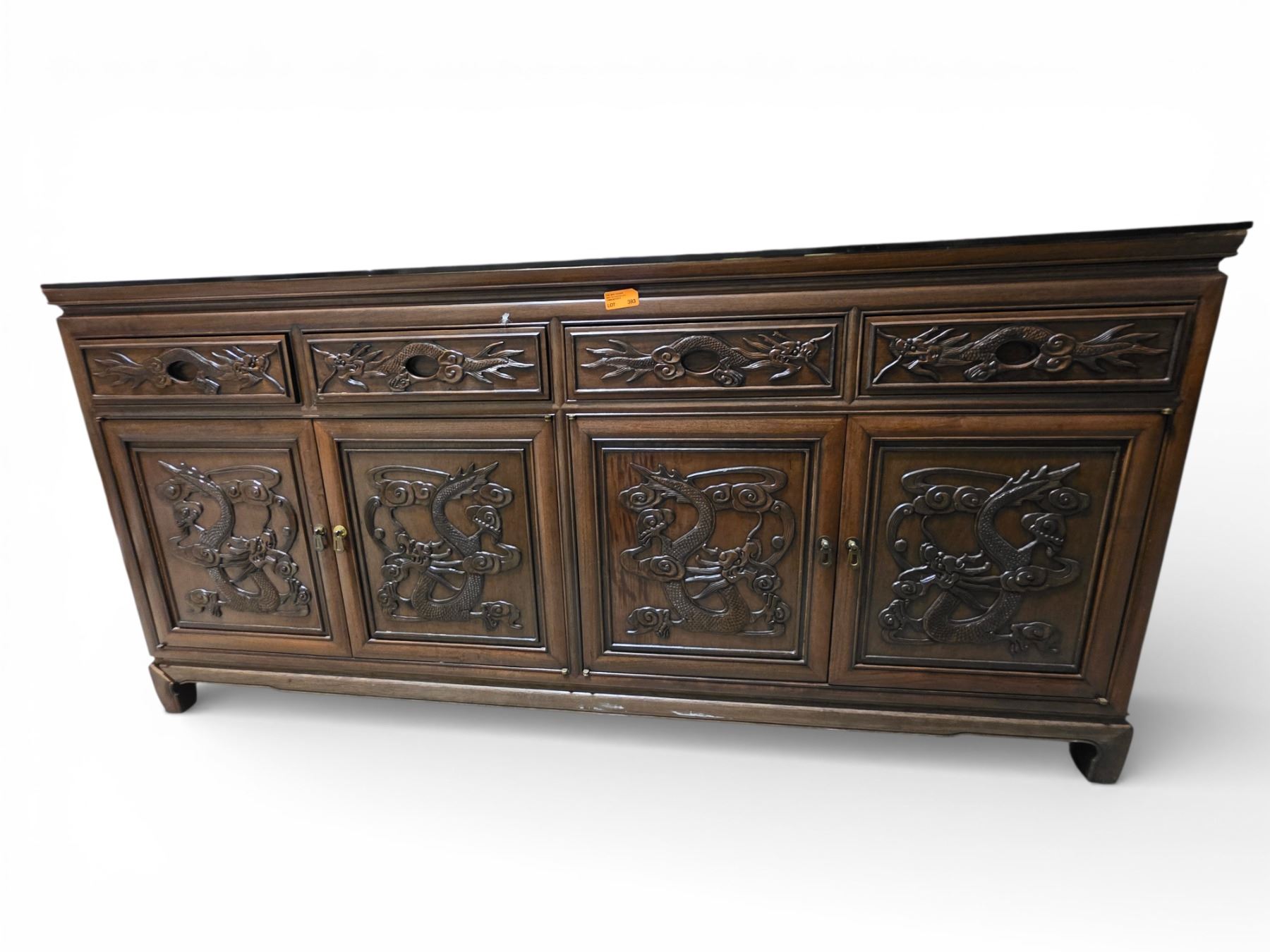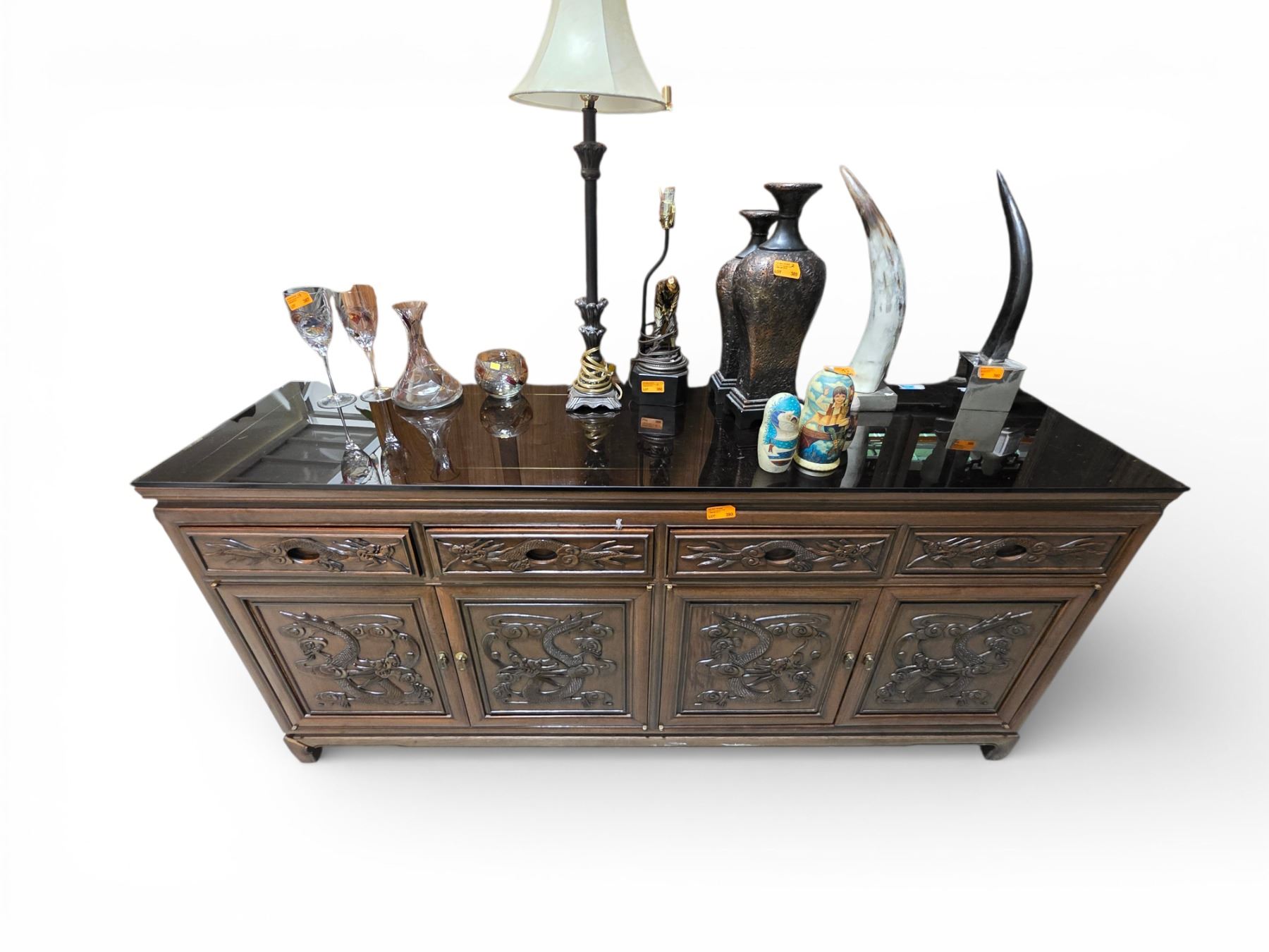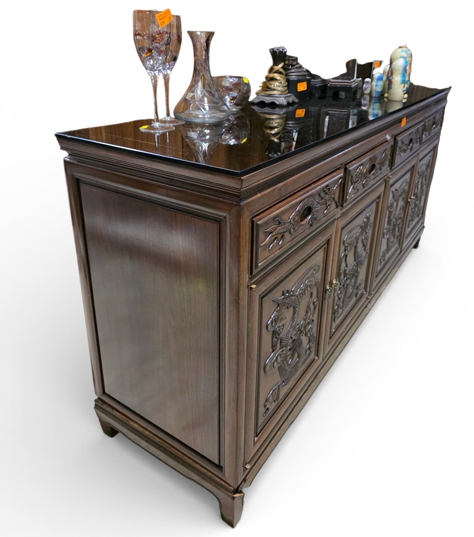 Chinese Hardwood Craved Sideboard with Glass Top, Approx. H34" x W72" x D19"