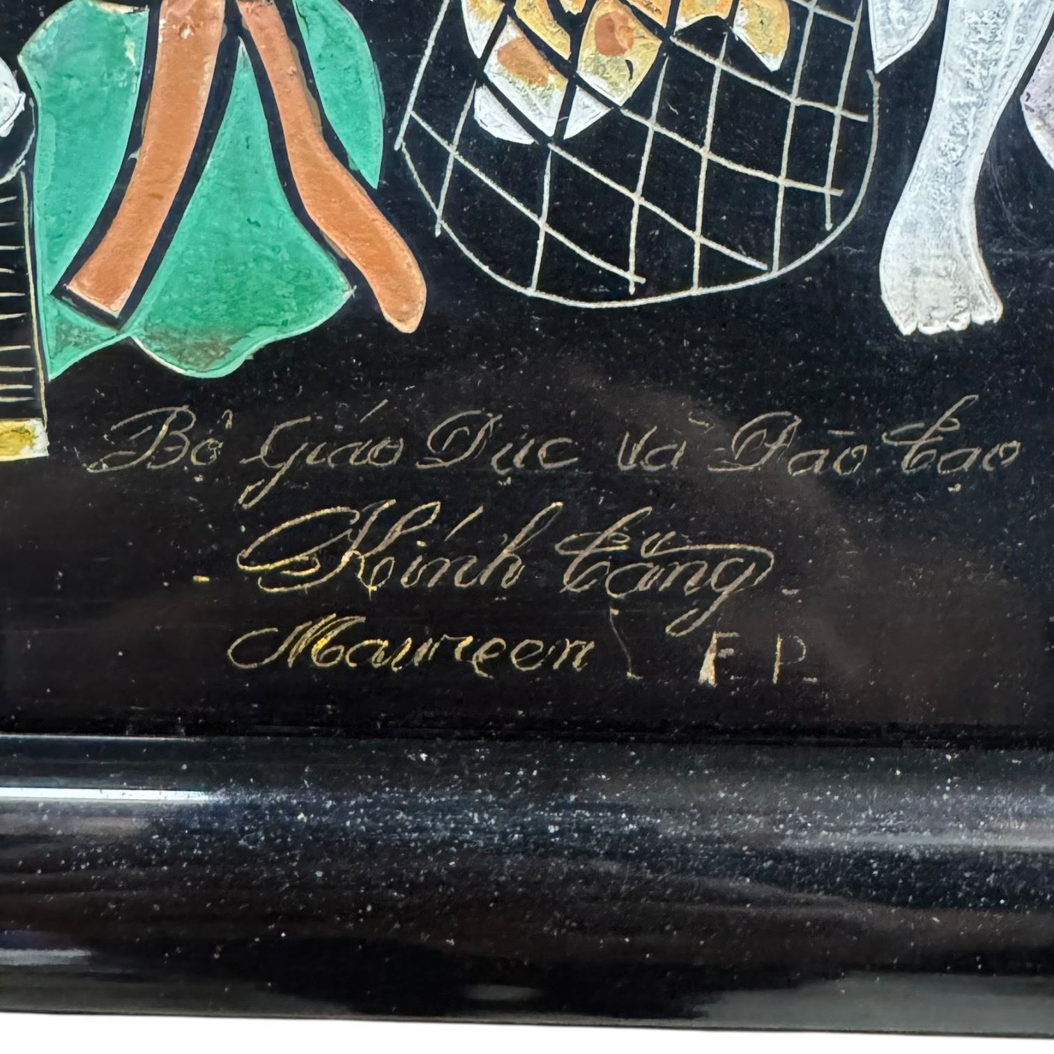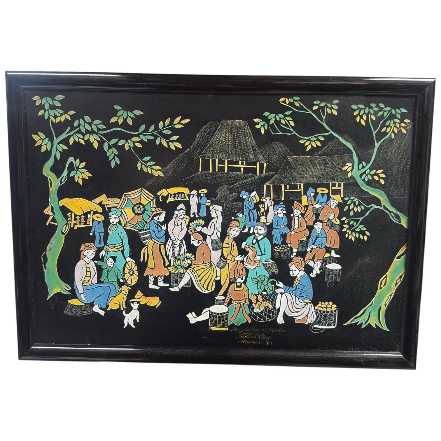 Chinese folk art painting likely hand-painted on a black lacquer-style wooden board. Features traditional village life or rural scenes. Typically created with acrylic or gouache paints. Dimensions are 21.5 in length and 15.6 in width. Often signed by the artist and marked. Item is as pictured.