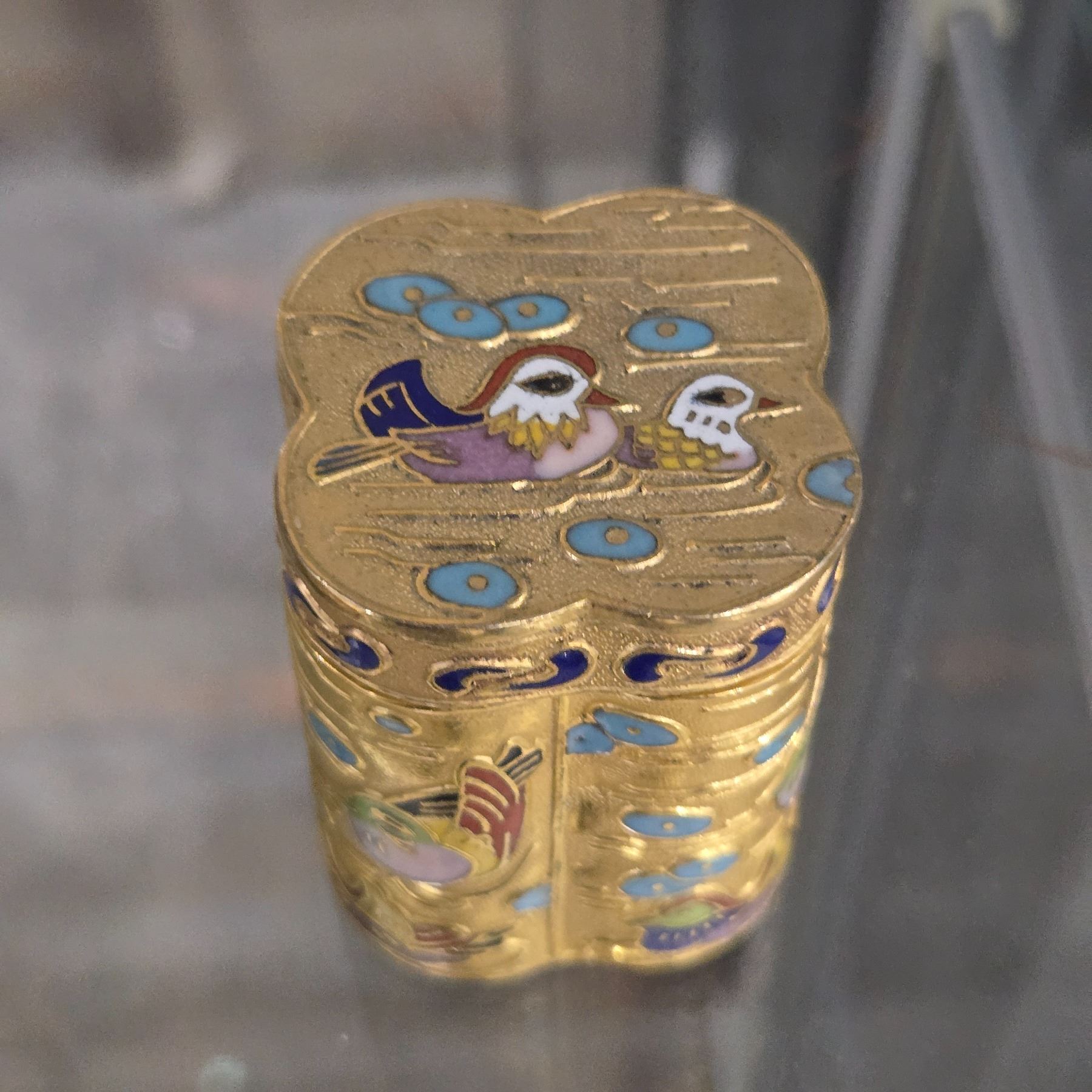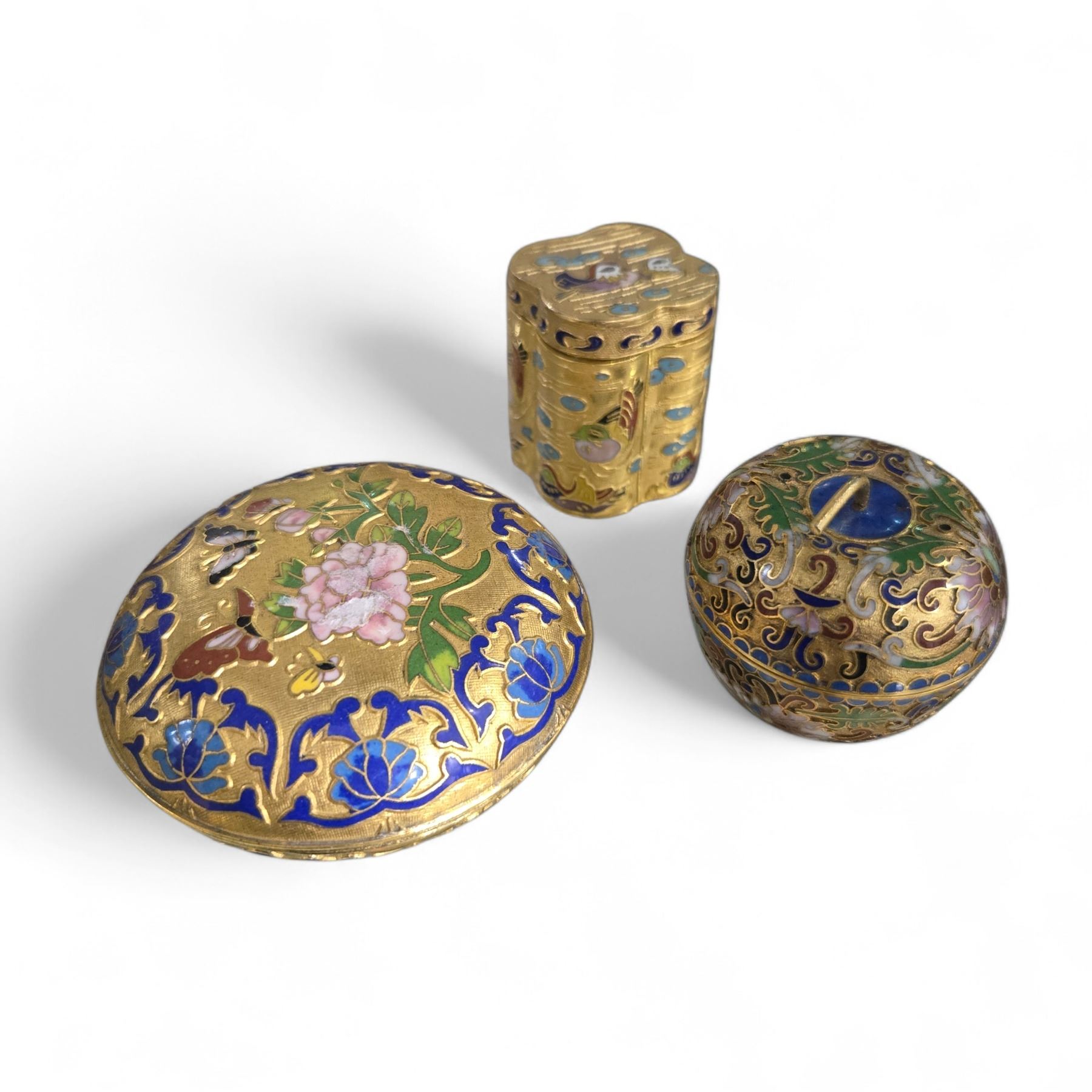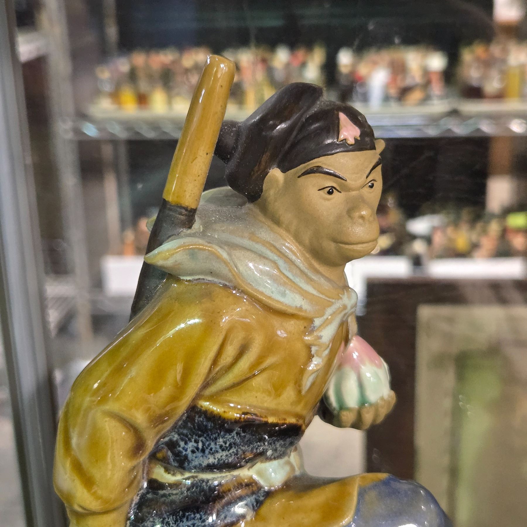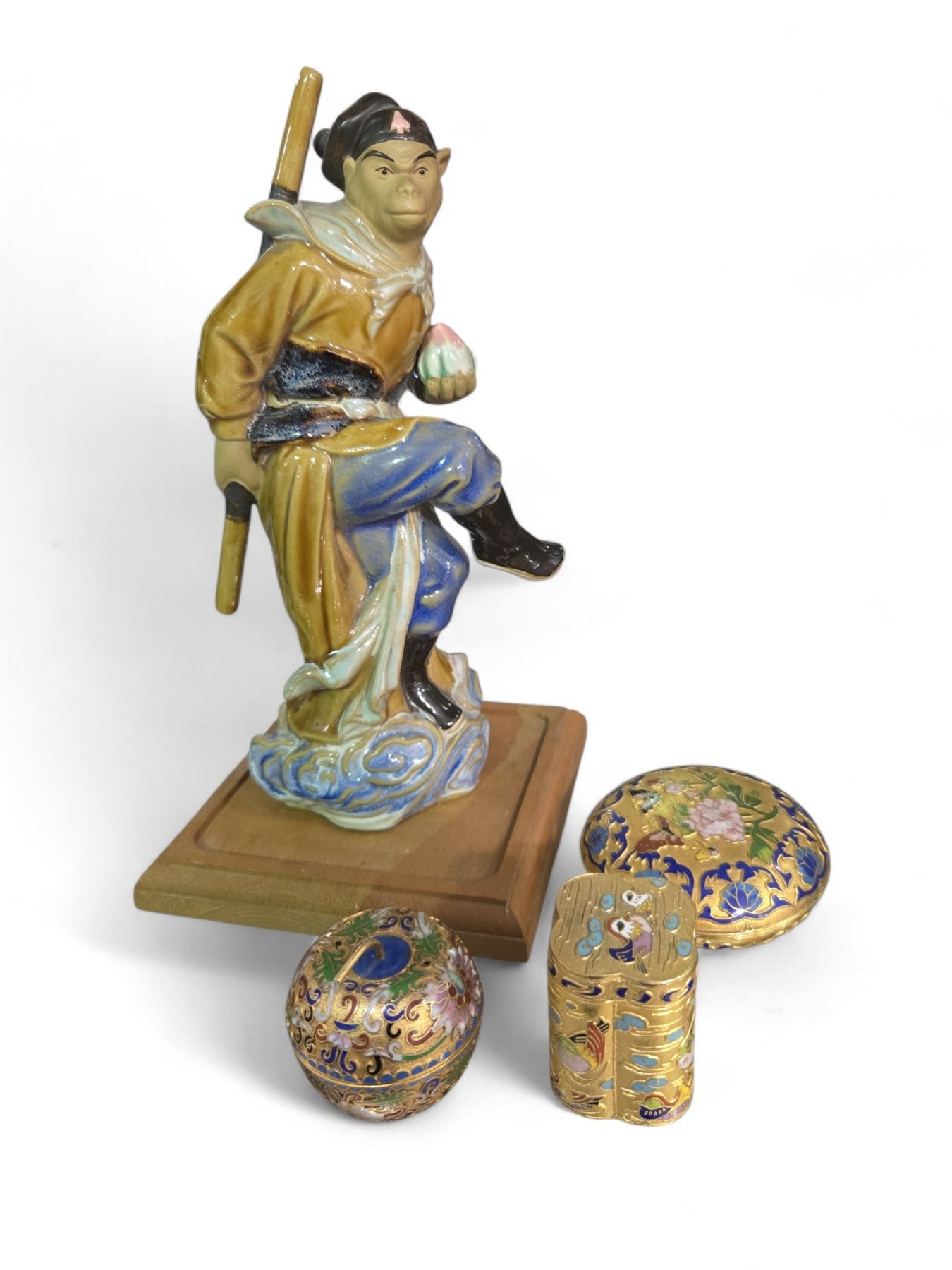 Chinese Porcelain Shiwan "Monkey King" Statue & 3 Vintage Petite Cloisonne Containers (apple is 2" tall x 2.5" diameter)