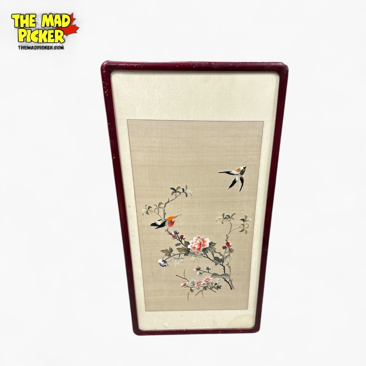 Chinese silk painting featuring traditional bird-and-flower motifs. Depicts birds and blossoms, painted or embroidered on silk fabric. Framed artwork measures 19x37 inches and may have originated from a scroll or folding screen. Similar styles are linked to historical figures like Empress Dowager Cixi.