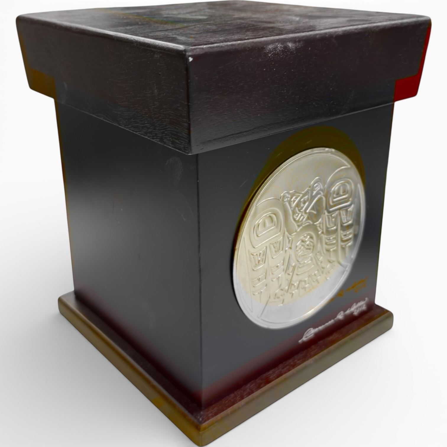 Clarence Wells Wood Keepsake Box with Metal Haida Design Plaque * 7" x 7" x 9" tall