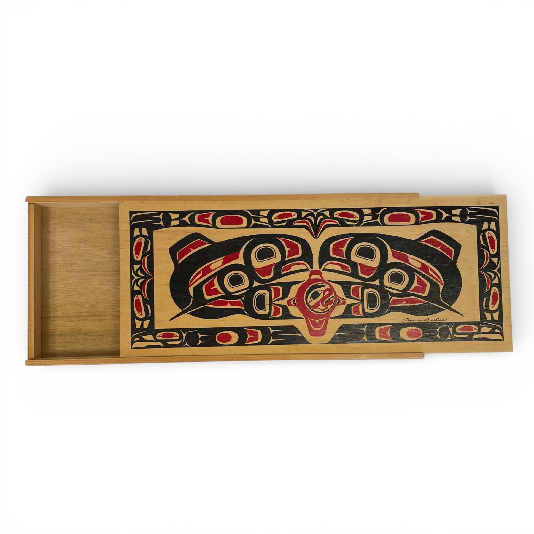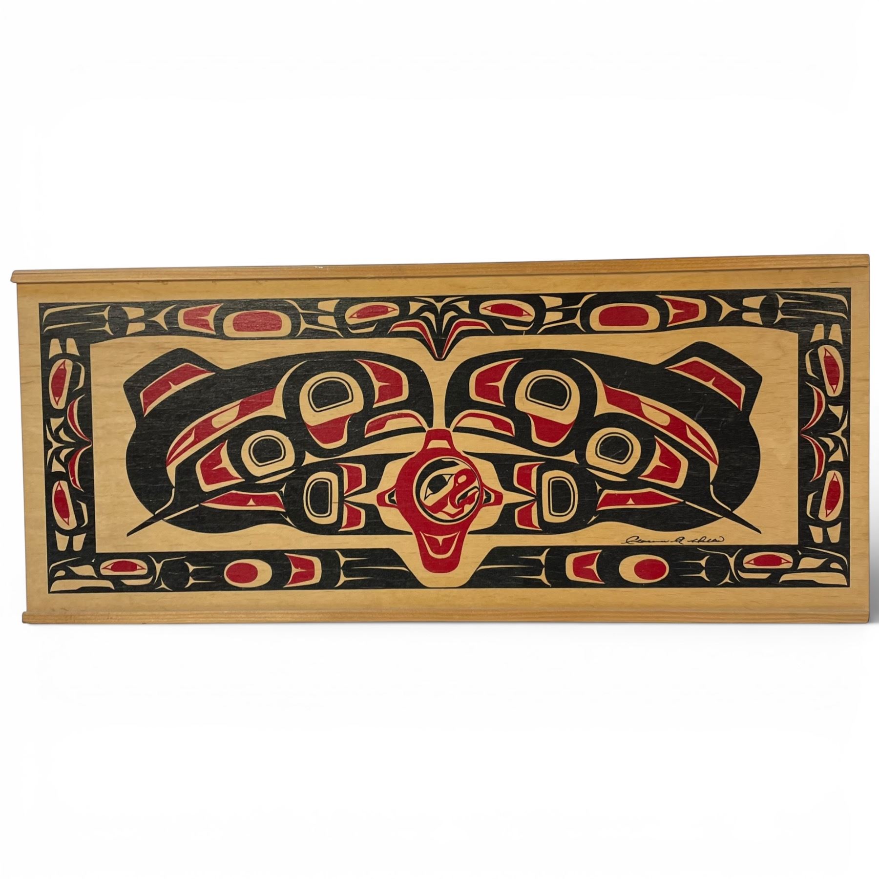 Handcrafted and painted salmon box by Clarence A Wells, showcasing West Coast First Nations artistic traditions. Features intricate painted designs. Dimensions are 18 In length and 7.5 In width. Item is as pictured.