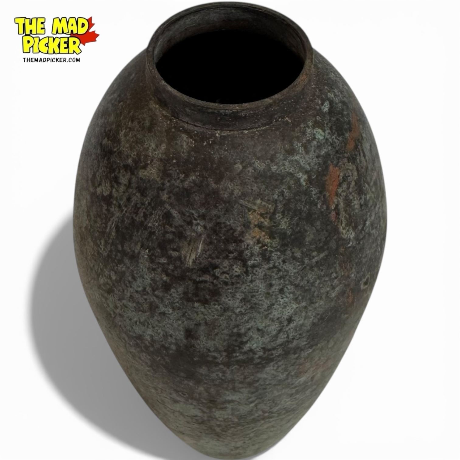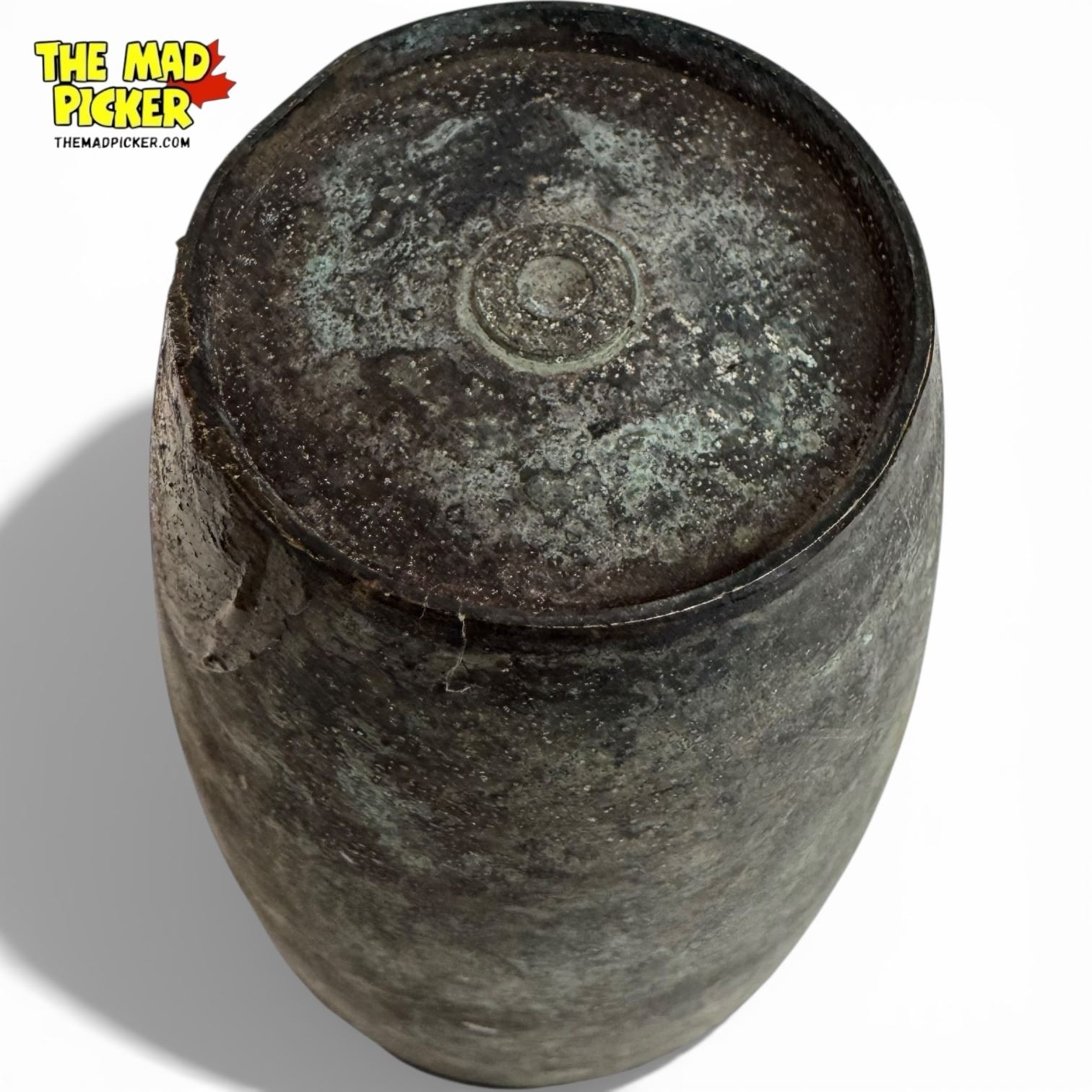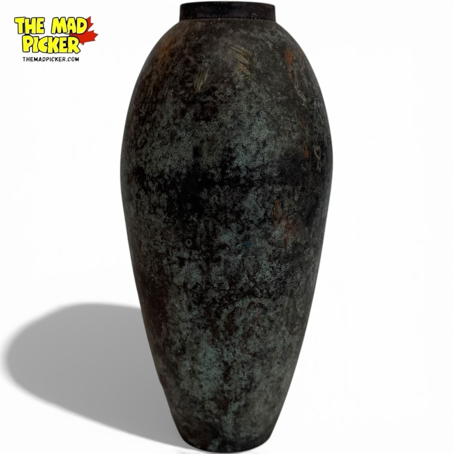 Classical Roman-inspired bronze decorative vase with a tapered design. Measures 7 inches tall. The piece mimics ancient Roman aesthetics and features a wonderful patina on the metal.