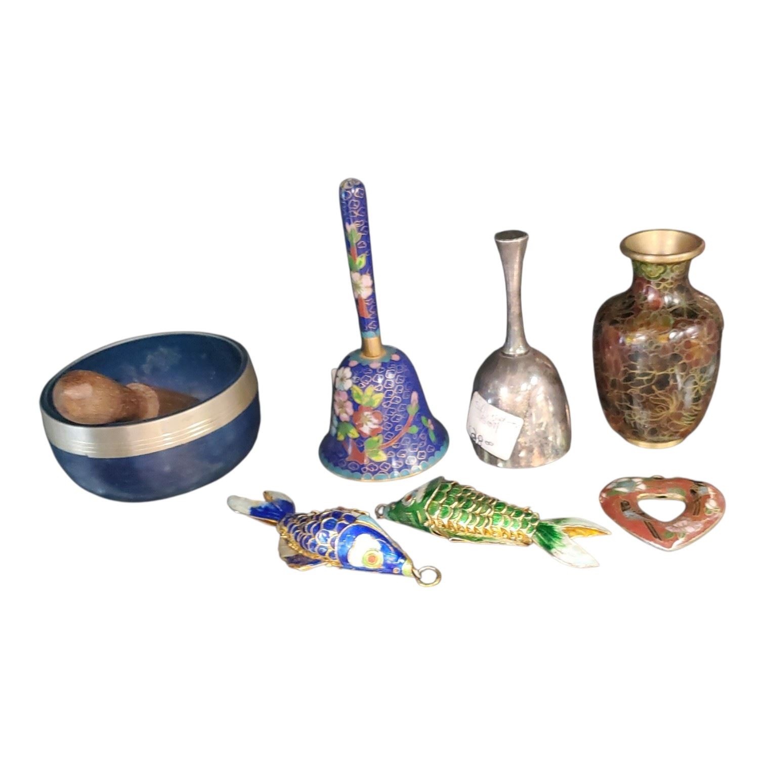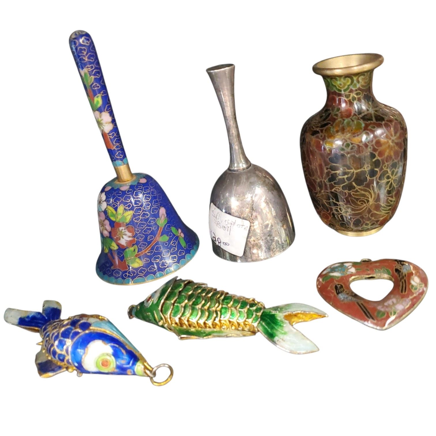 Collection of decorative items including a cloisonné bell, vase, and pendant, a silver plated bell, a prayer bowl measuring 4.5-Inch tall, and an articulated fish. Items showcase varied craftsmanship and styles. Item is as pictured.
