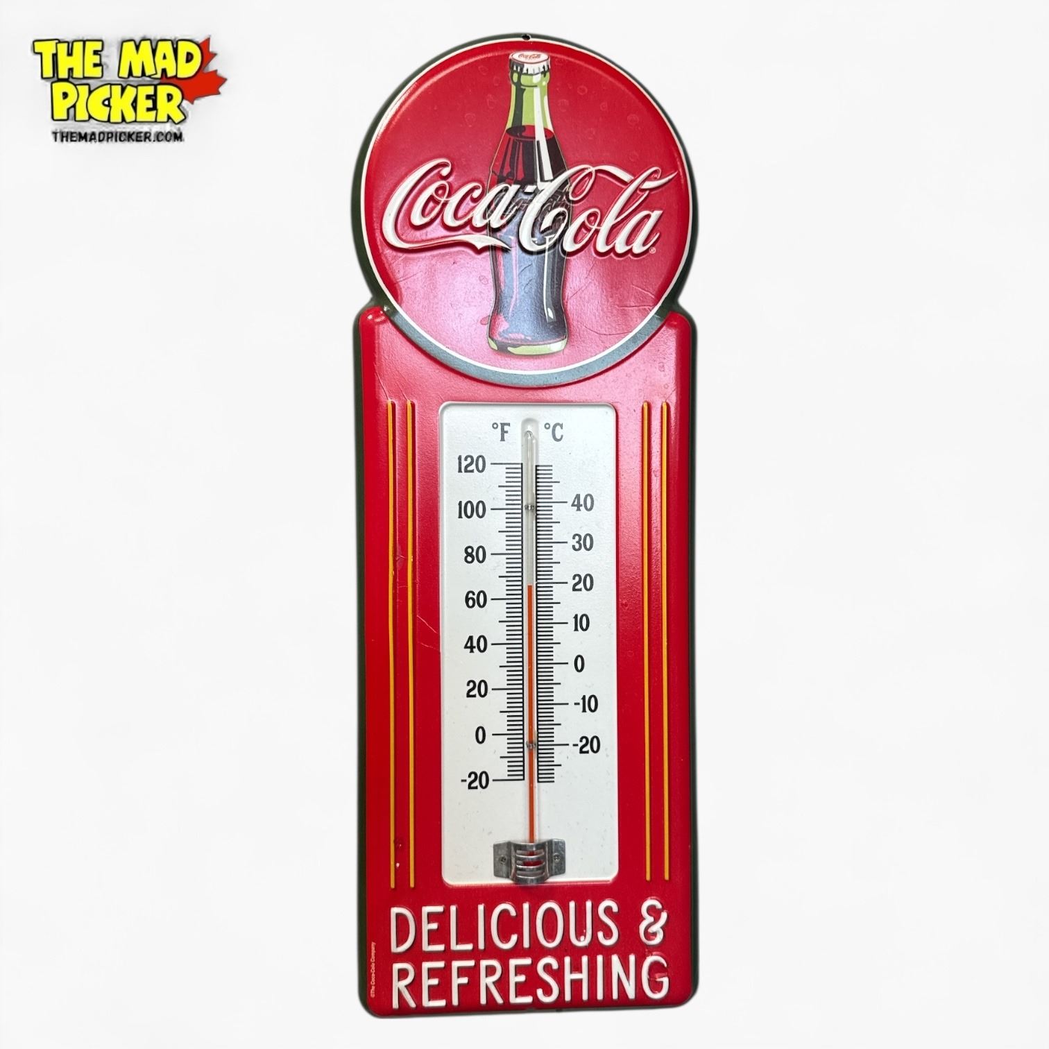 Coca-Cola metal thermometer featuring the slogan 'Delicious and Refreshing'. Measures 15.5 inches tall. Design inspired by vintage Coca-Cola advertising. Metal construction with printed graphics. Intended for indoor or outdoor use.