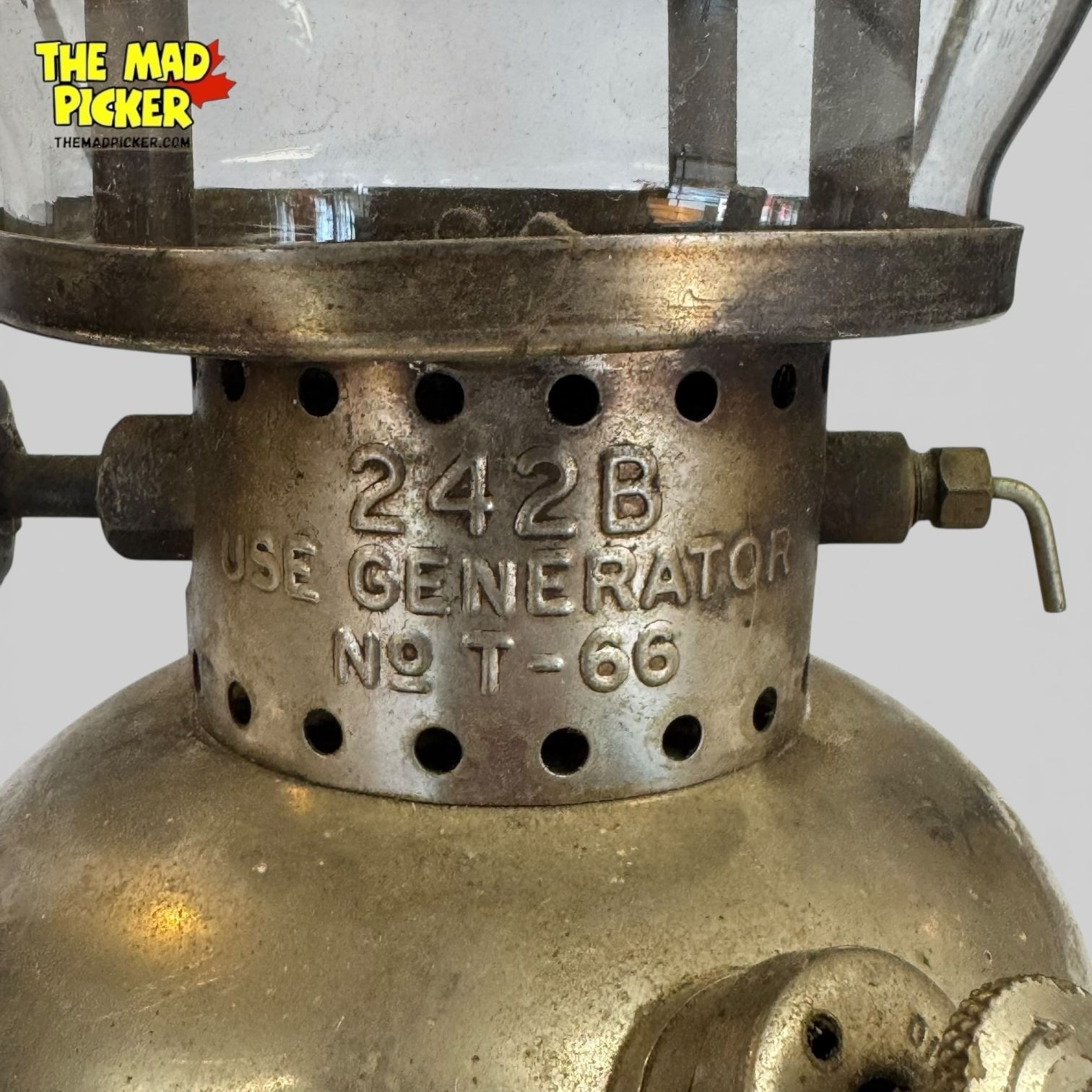 Coleman 242B lantern produced in 1950. Nickel-plated brass fount and single mantle design. Features a red vented top and knurled valve for fuel adjustment. Made in the USA. Designed for use with white gas fuel. Compact and portable model popular among camping enthusiasts.