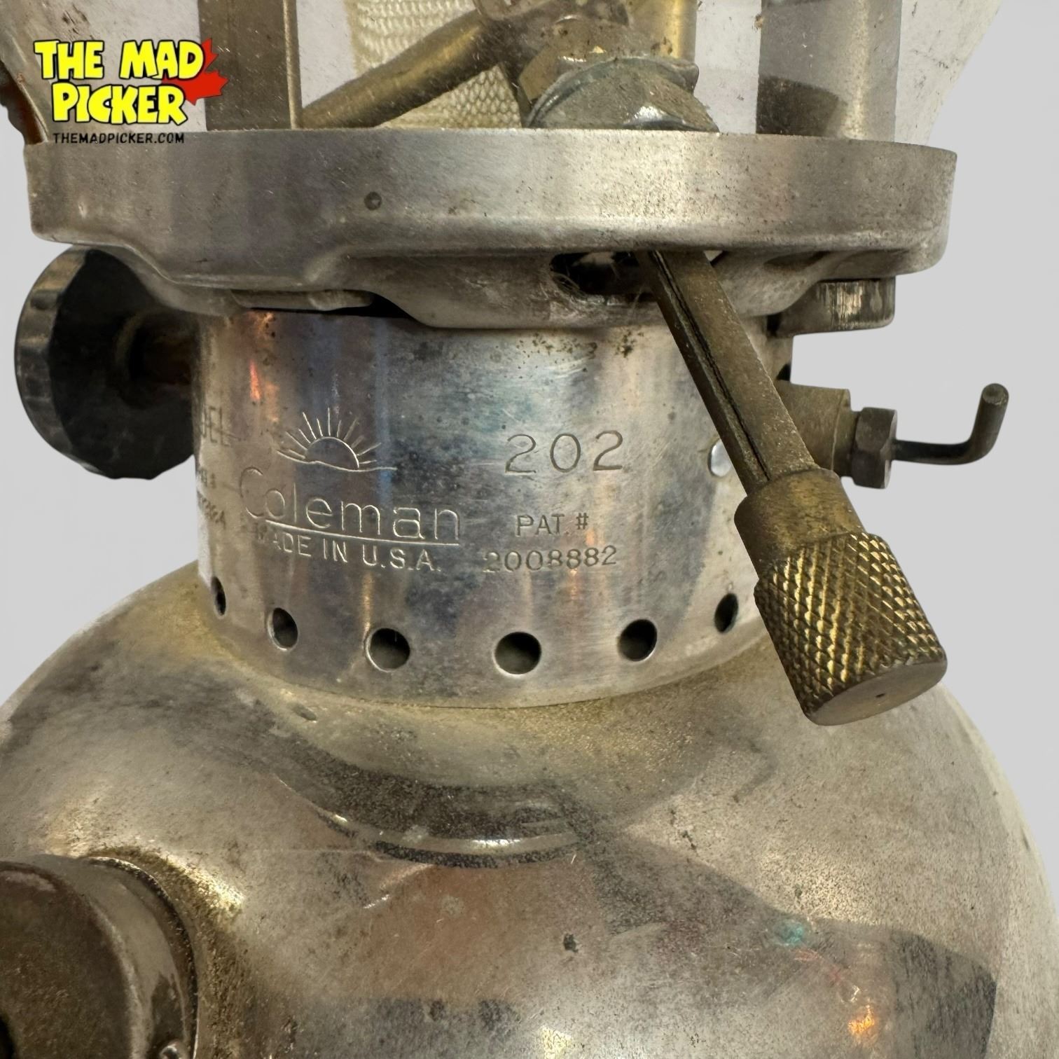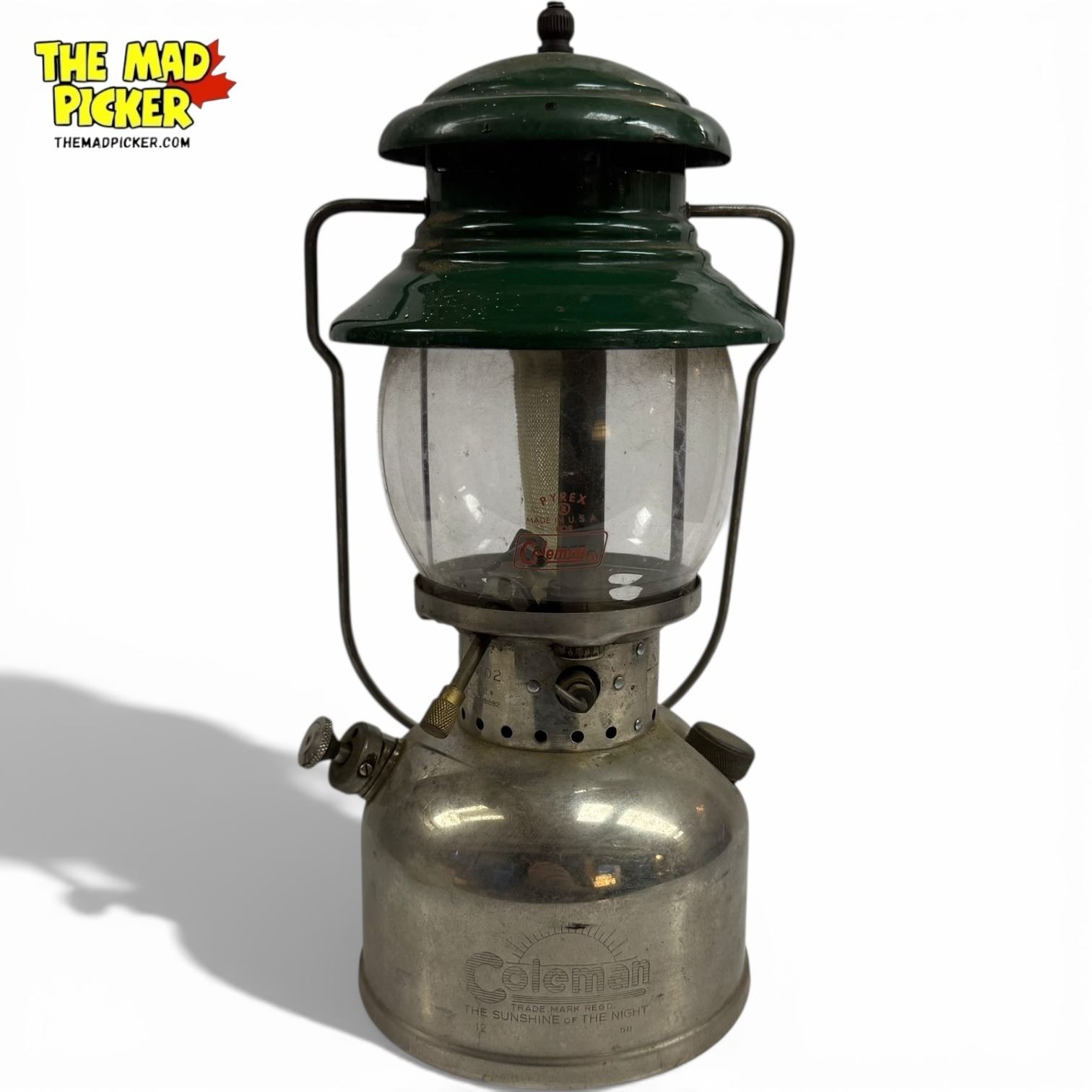 Coleman Model 202 lantern manufactured in 1958. Single mantle design with nickel-plated brass fount. Often referred to as the 'Professional' model, it includes a built-in pump and adjustable air control. Made in the USA. Suitable for white gas fuel. Height approximately 12 inches.