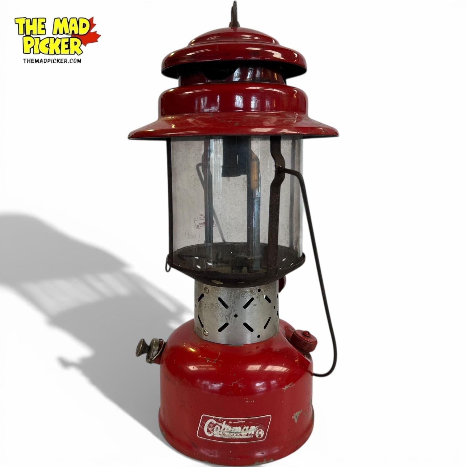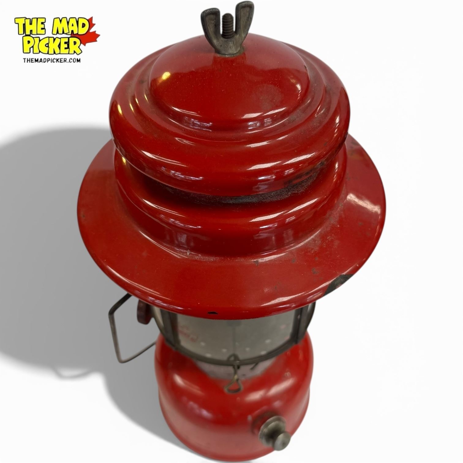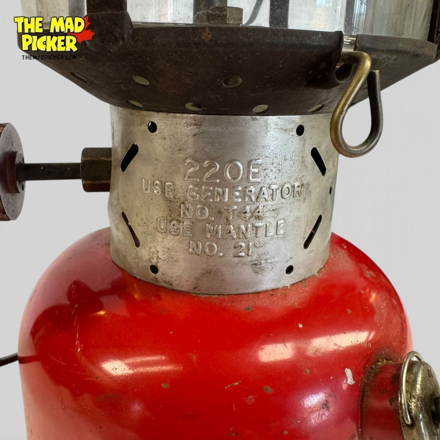 Coleman 220E kerosene double mantle lantern in red finish. Manufactured between 1951-1954 in Wichita, Kansas. Measures approximately 16 inches in height. Model features a built-in pump and globe. Known for its durable steel construction and reliable performance during its production era.