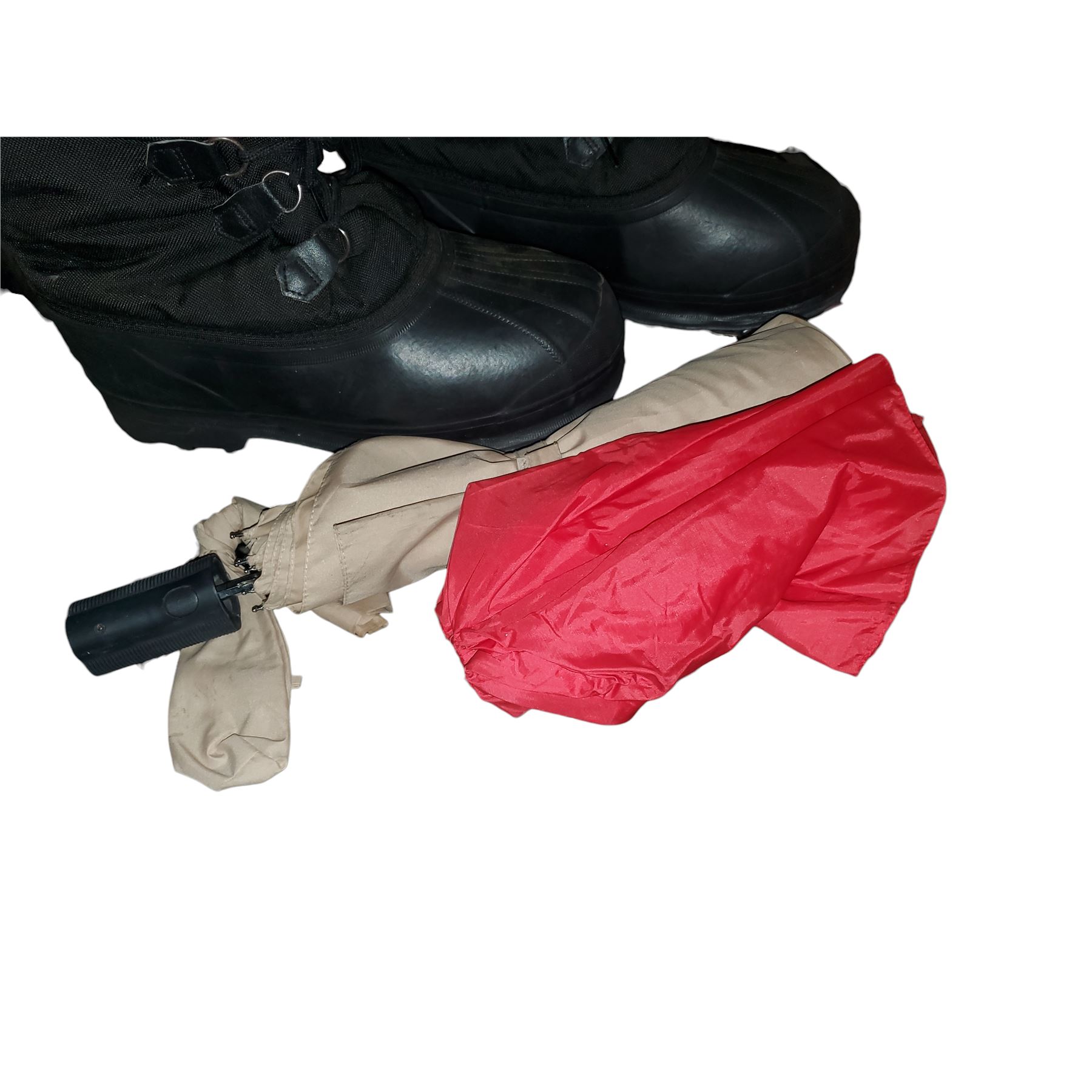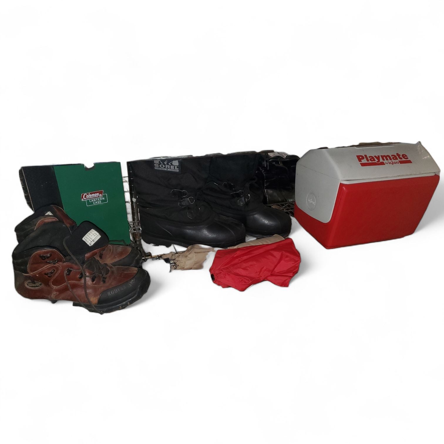 Coleman Lantern Case, Kodiak Boots (Size 12), Sorel Boots (Size 12), and Playmate Cooler