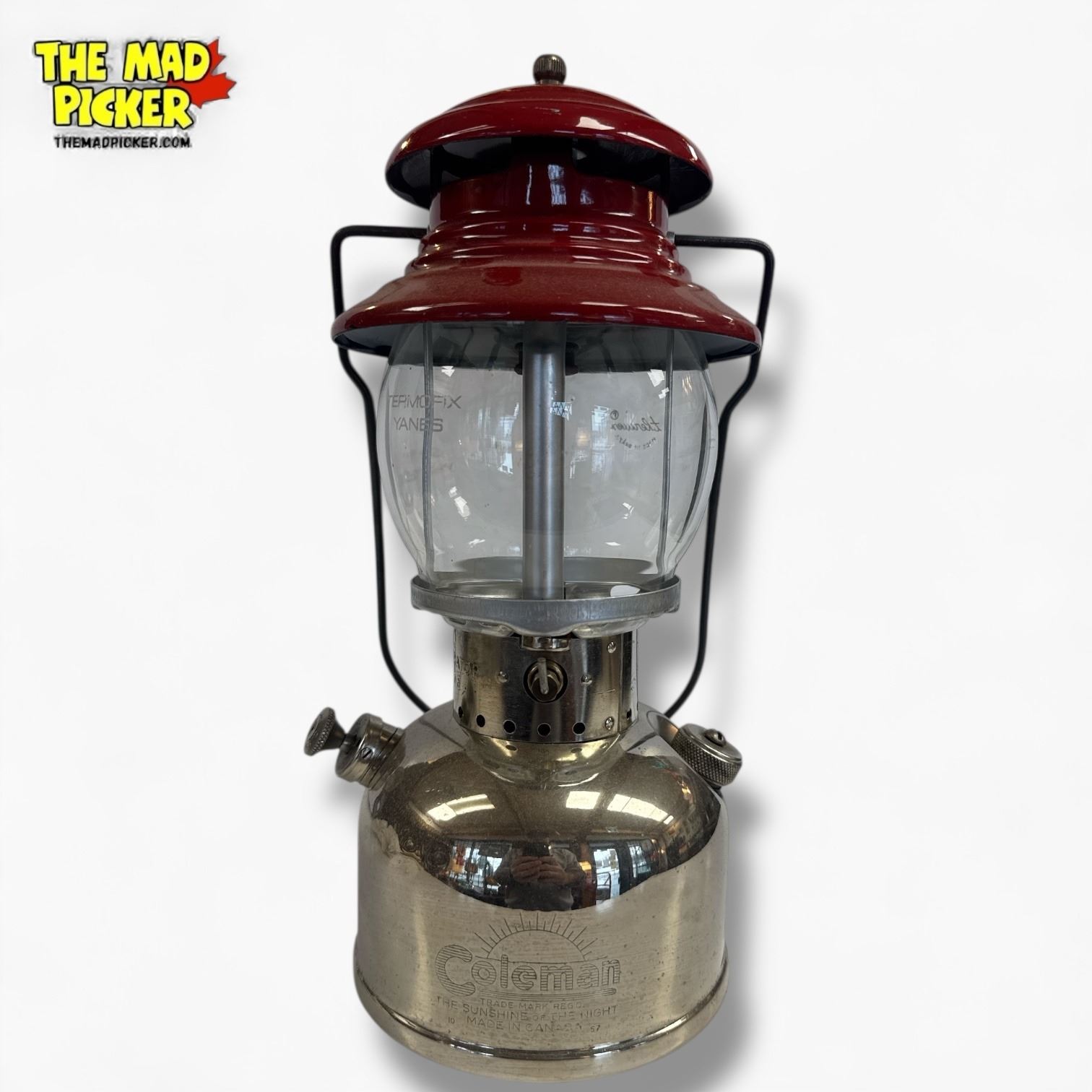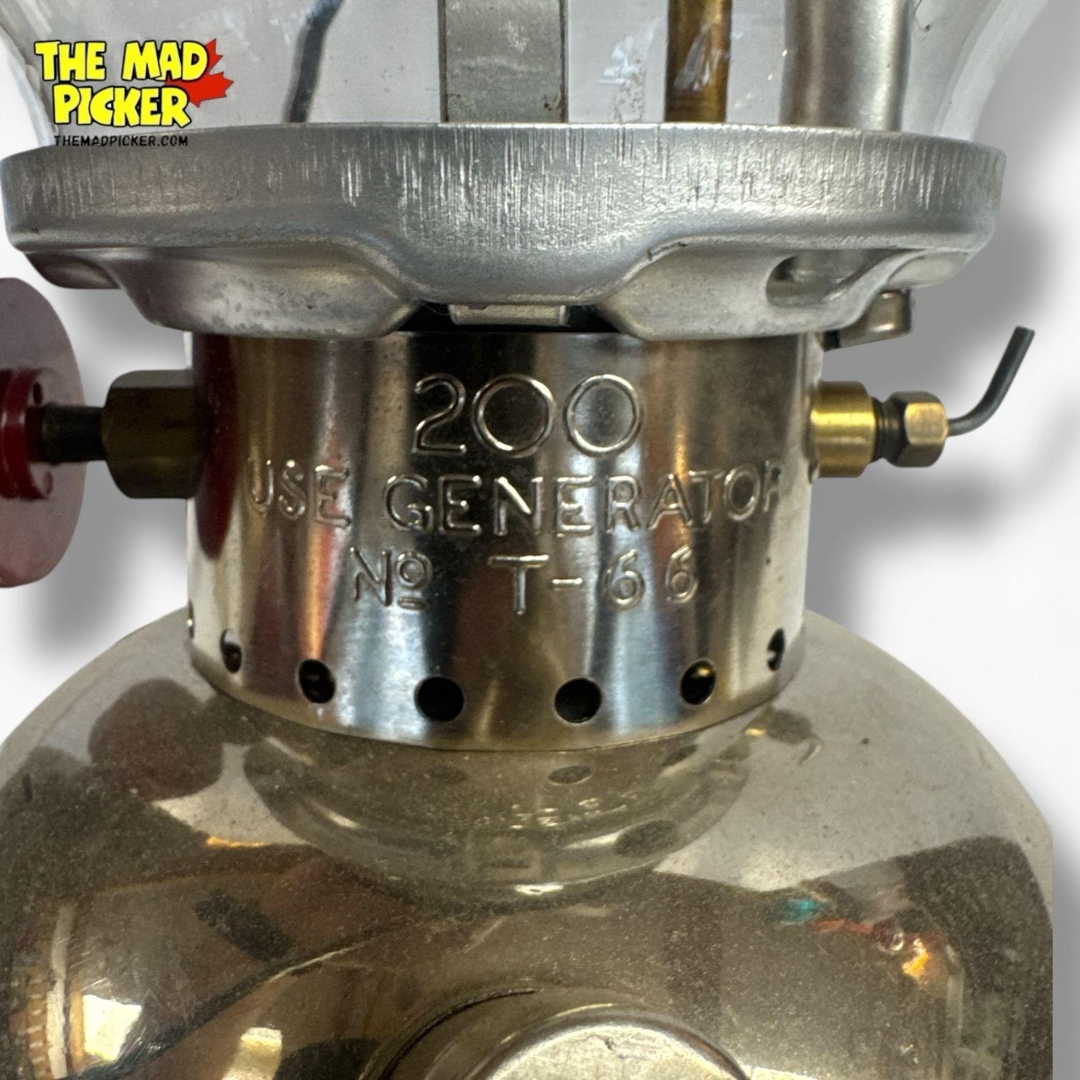 Coleman Model 200 nickel-plated lantern produced in the USA in 1957. Single mantle design with a red vented top and clear glass globe. Operates on white gas. Features the stamped manufacturing date '10-57' on the base. Iconic mid-century outdoor lighting equipment.
