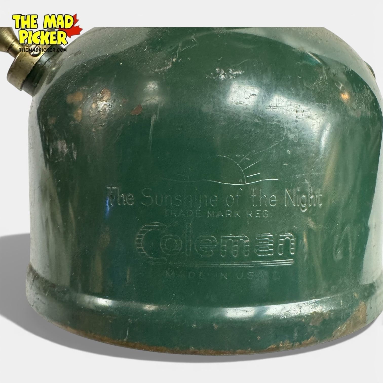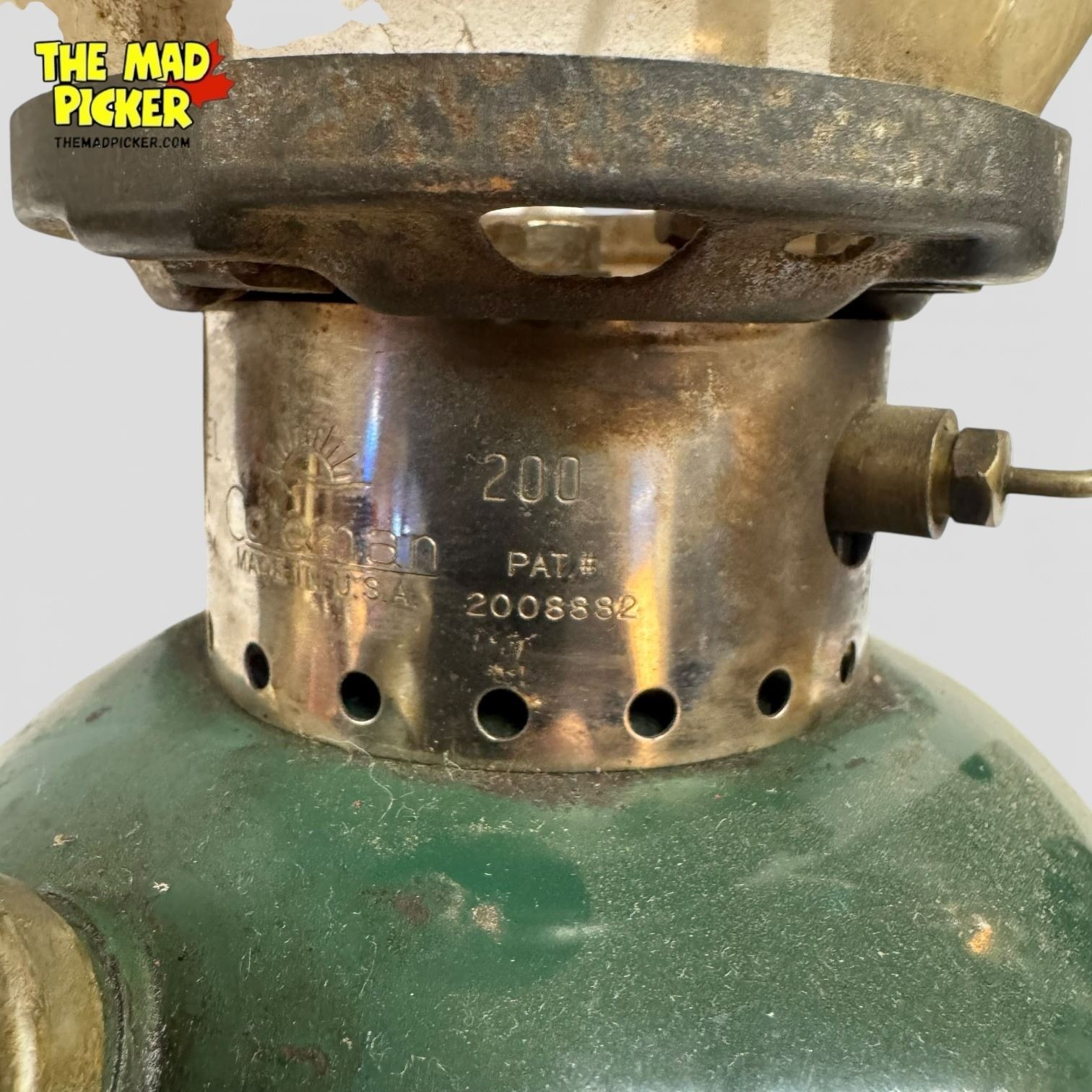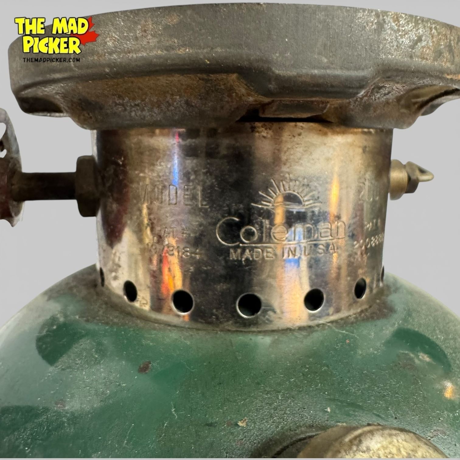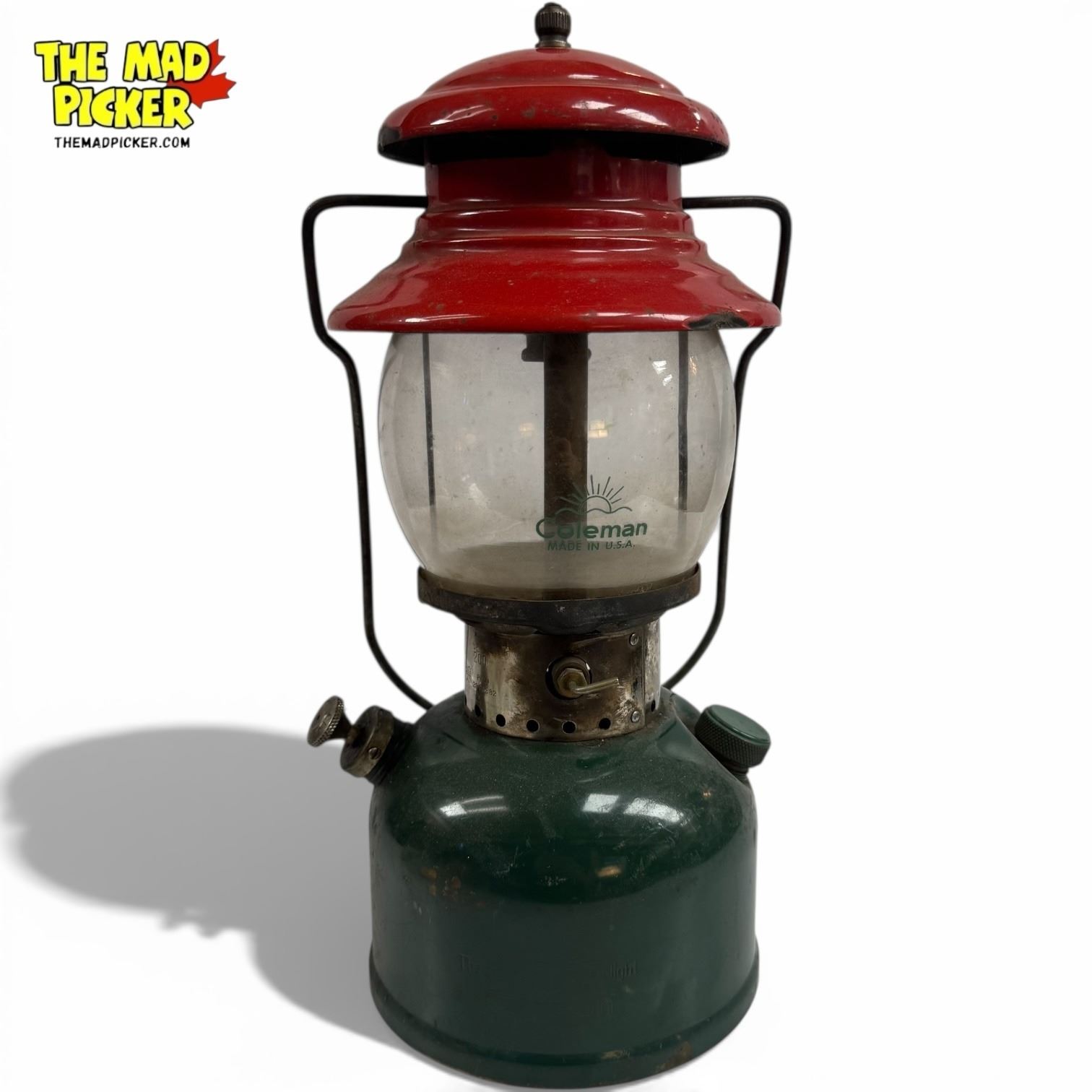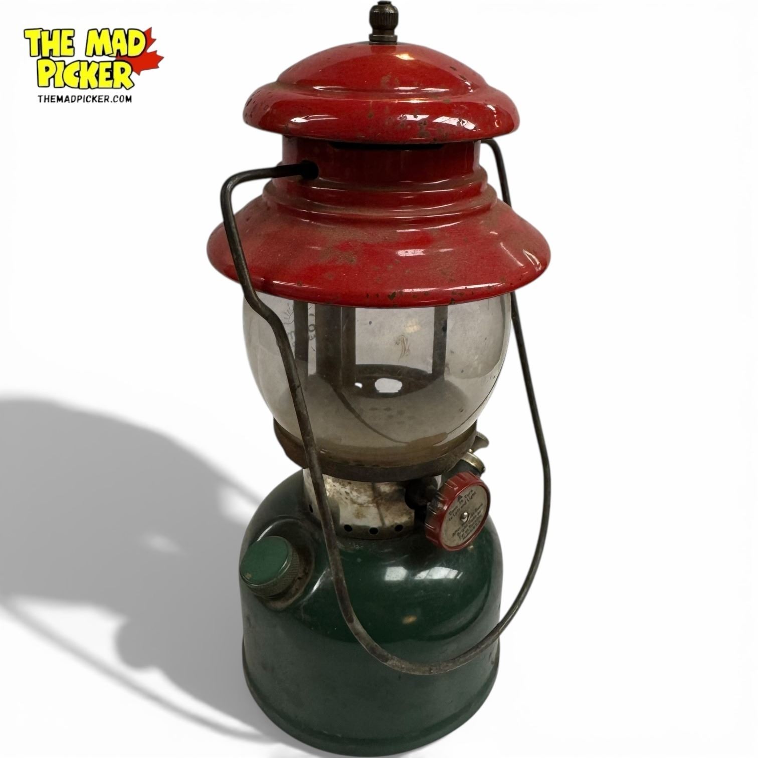 Coleman Model 200 'Christmas Tree' lantern, produced in 1951. Features a red enamel ventilator and fount, single mantle design. Measures approximately 13.5 inches tall. Known for its distinctive color scheme reminiscent of holiday decorations. Made in the USA.