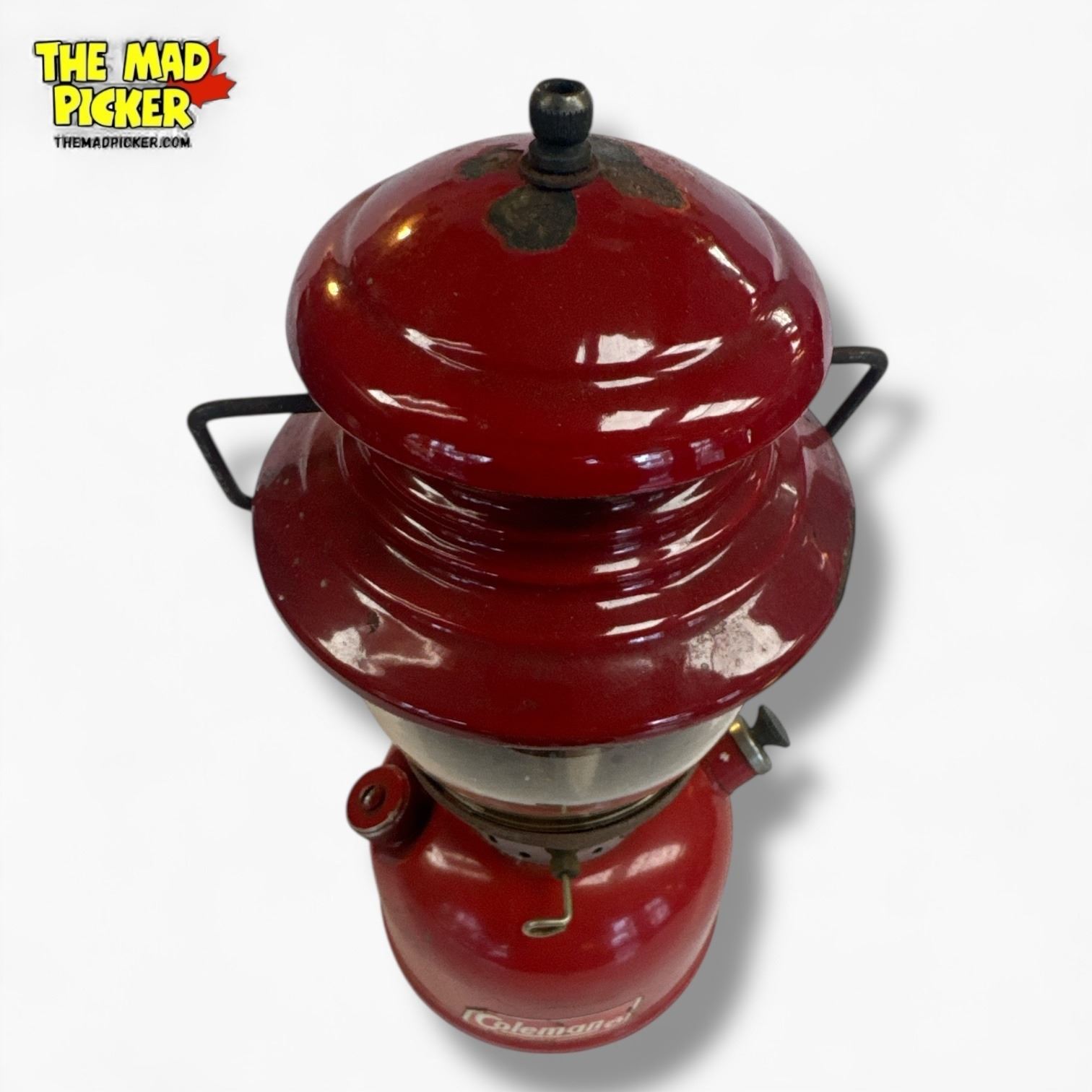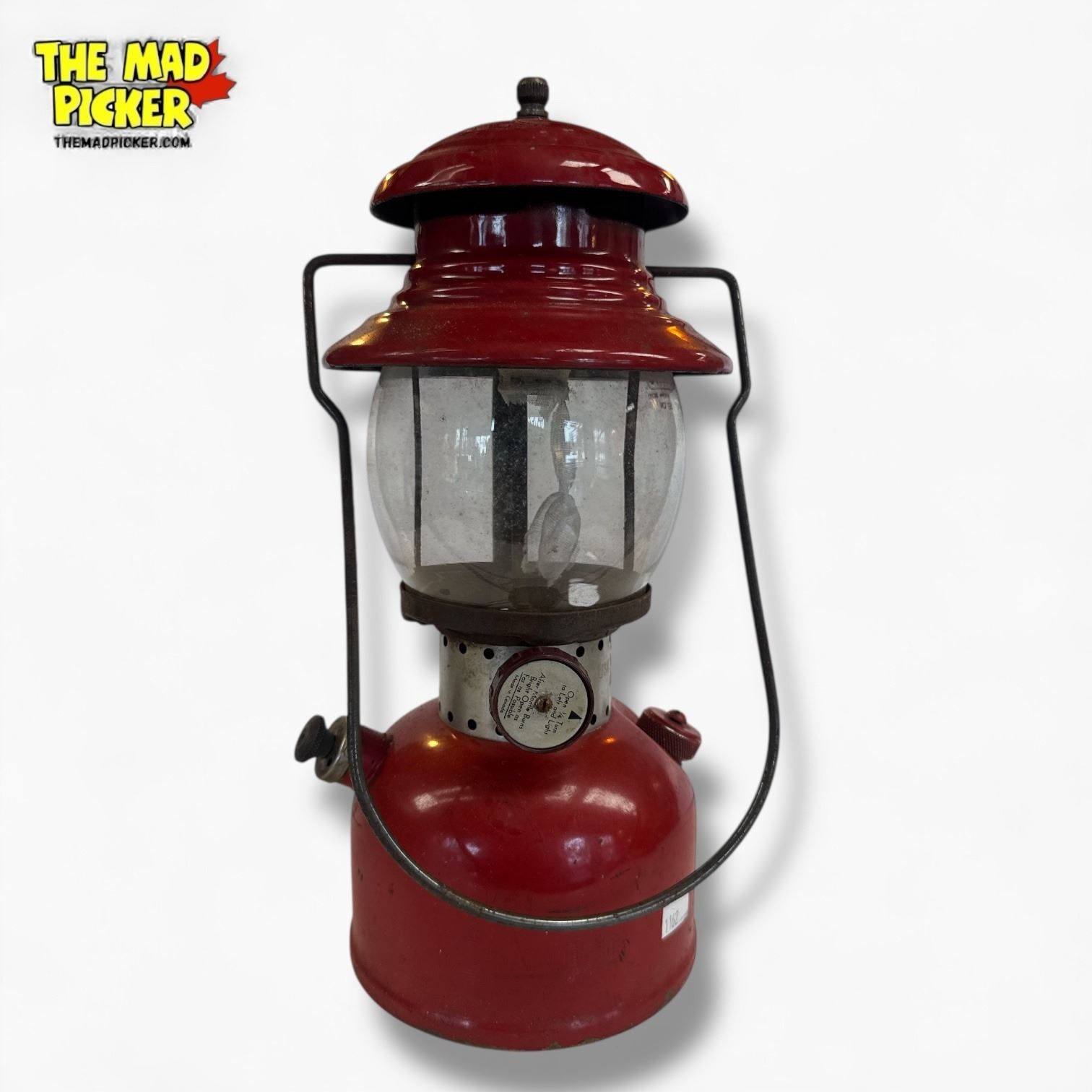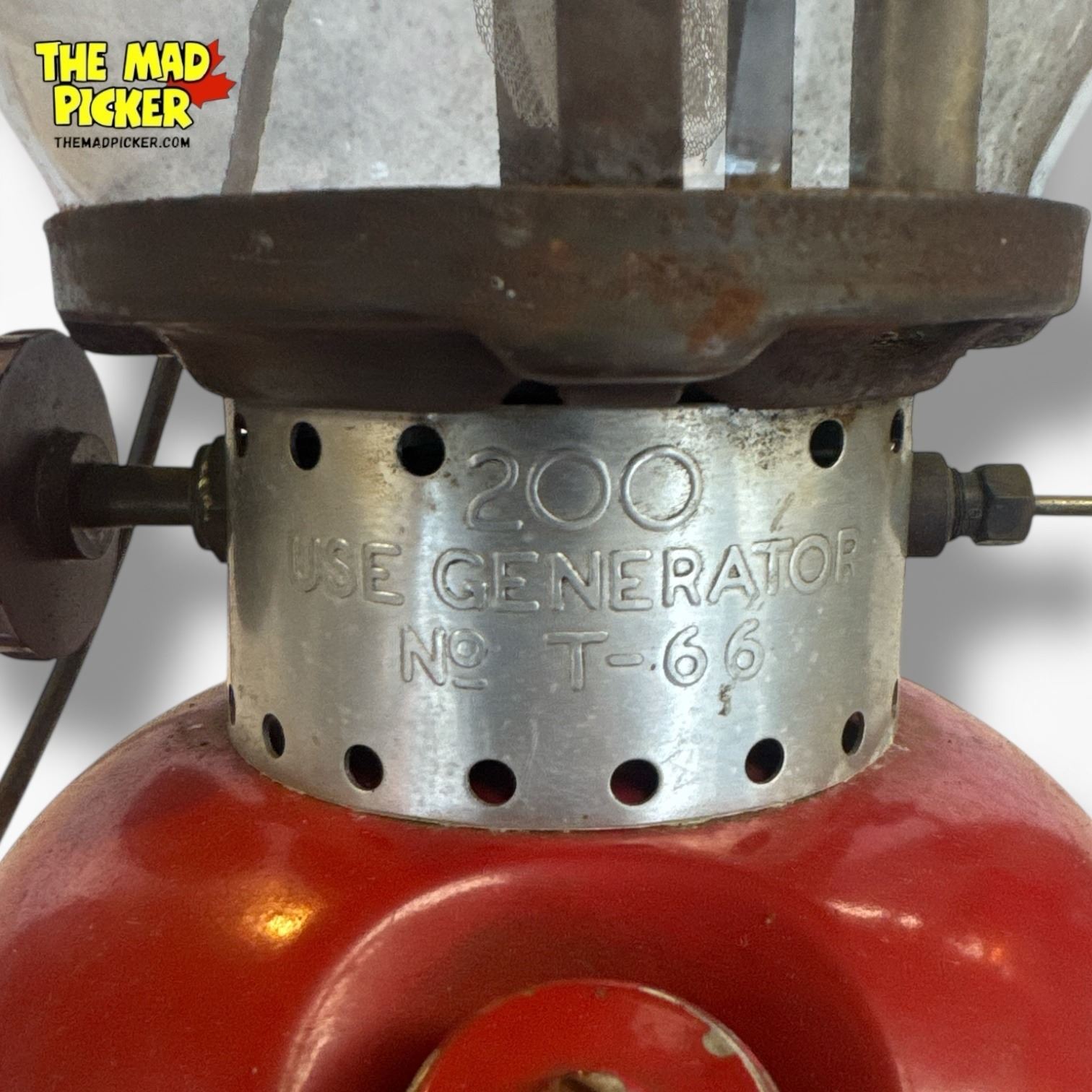 Coleman Model 200 lantern in red, a single mantle gasoline-powered model produced in the 1950s. Features the classic red vented hood and cylindrical fuel tank. Popular for its durable design and efficient lighting. Great condition with no reported damage or functional issues.