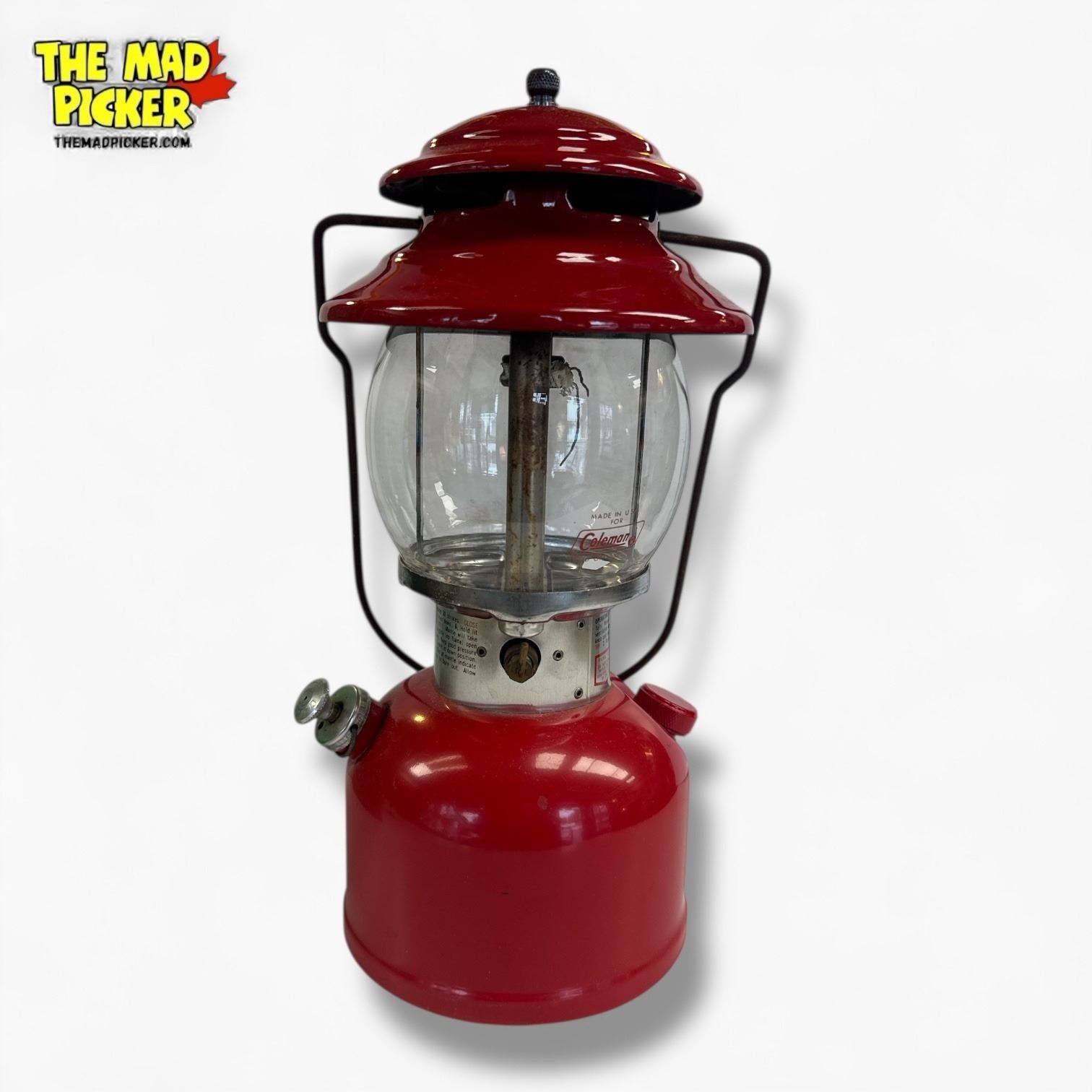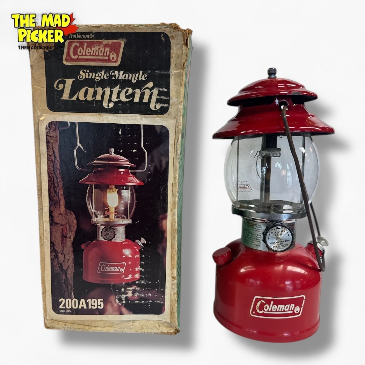 Coleman Model 200A red lantern manufactured in 1979. Single mantle design with original box included. Made in the USA with a sturdy metal frame and glass globe. Known as the 'Red Lantern', this model was popular for camping and outdoor activities during its production run.