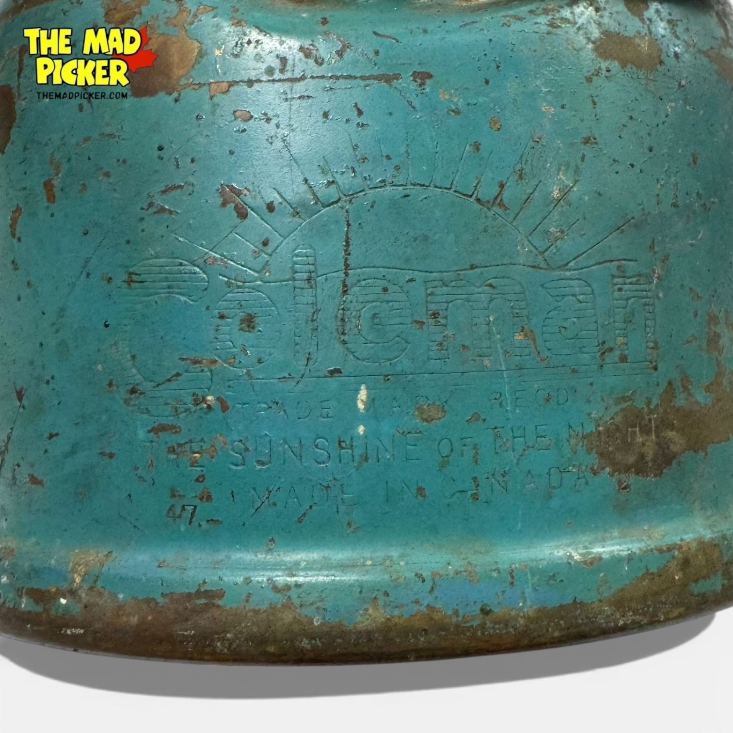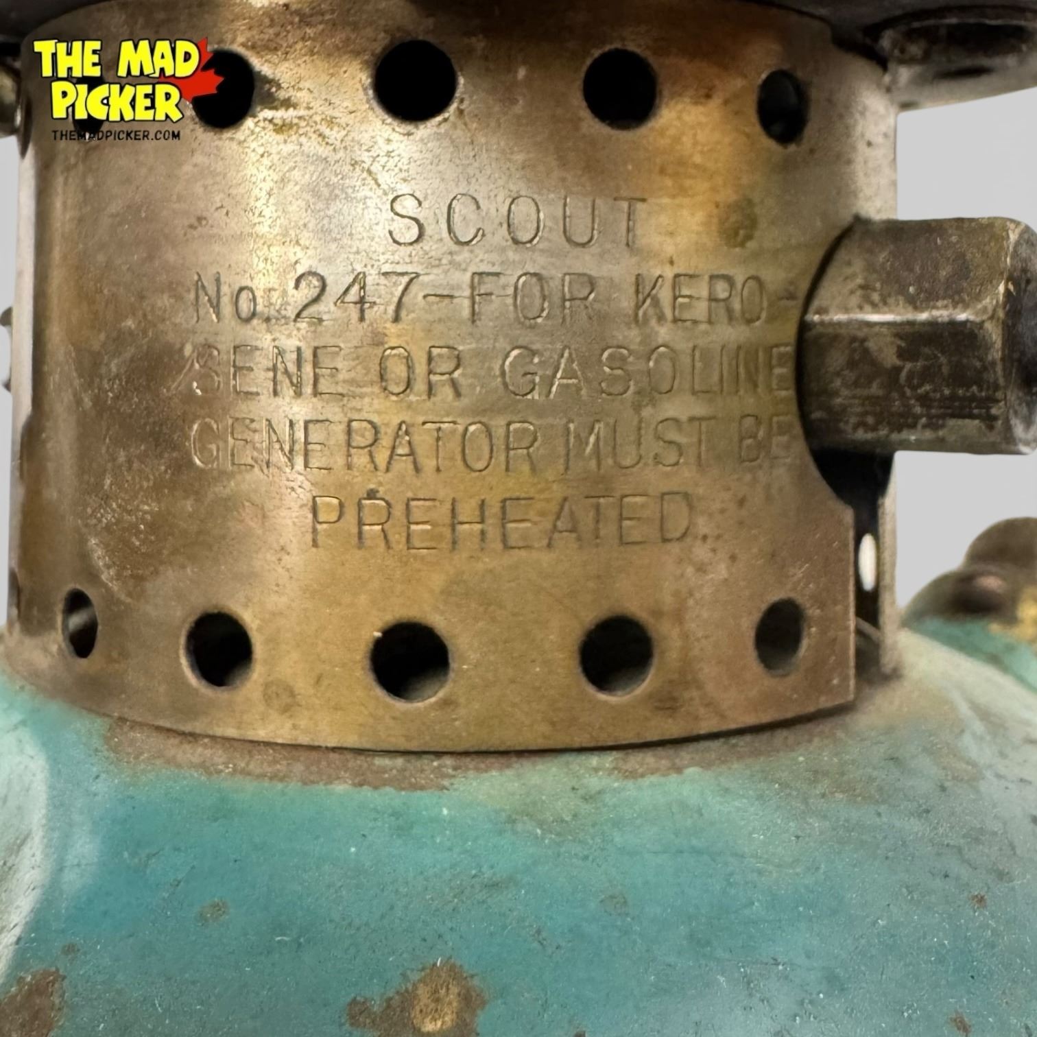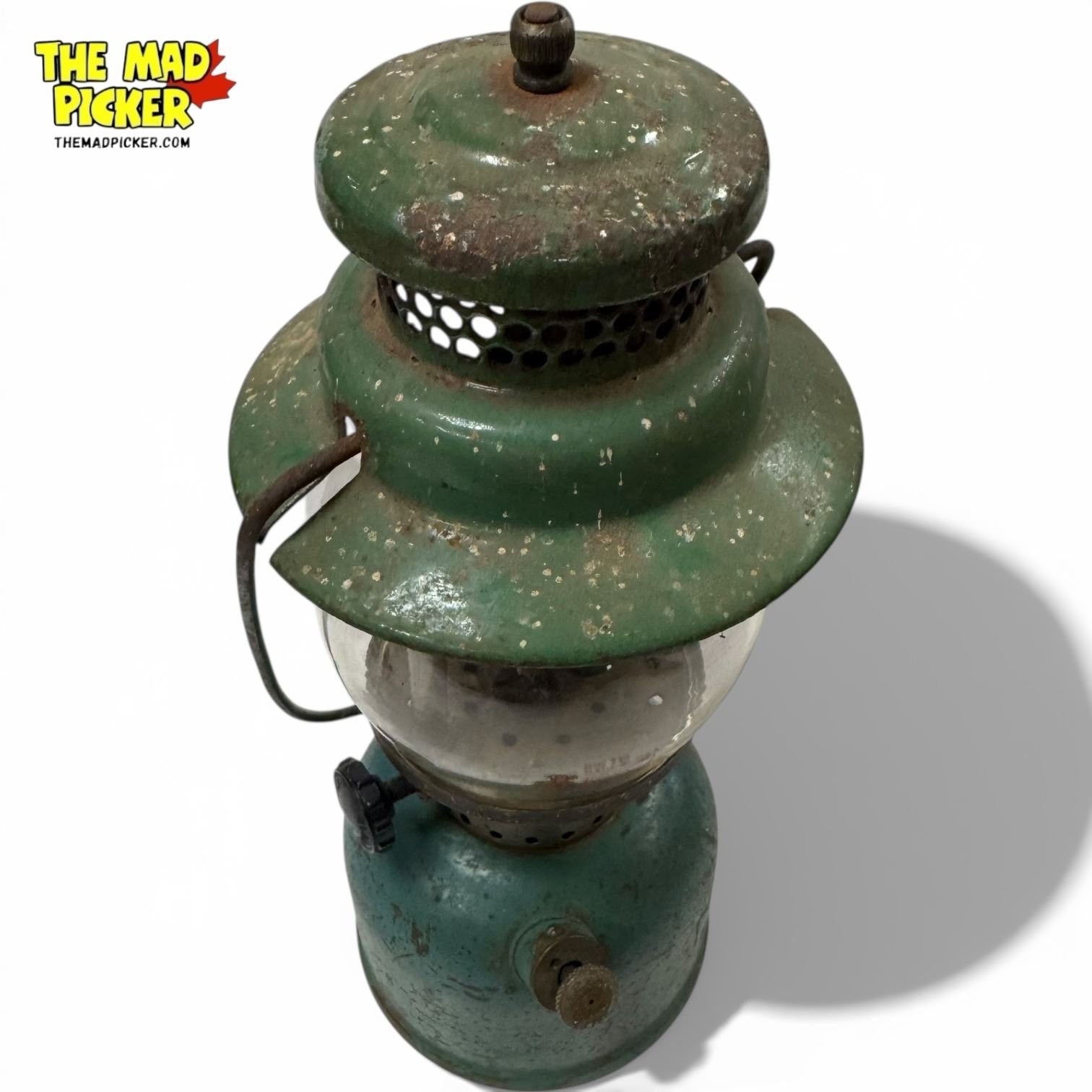 Coleman Model 249 Scout lantern in seafoam green, produced in 1947. Designed for kerosene fuel with a single-mantle system, this model features a brass fount and globe holder. Manufactured in Wichita, Kansas, the 249 Scout is notable for its compact size and outdoor utility. Stamped production year on base.