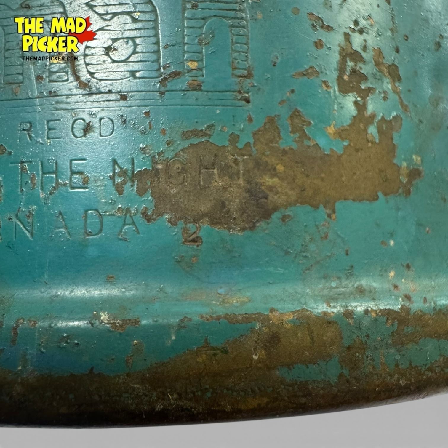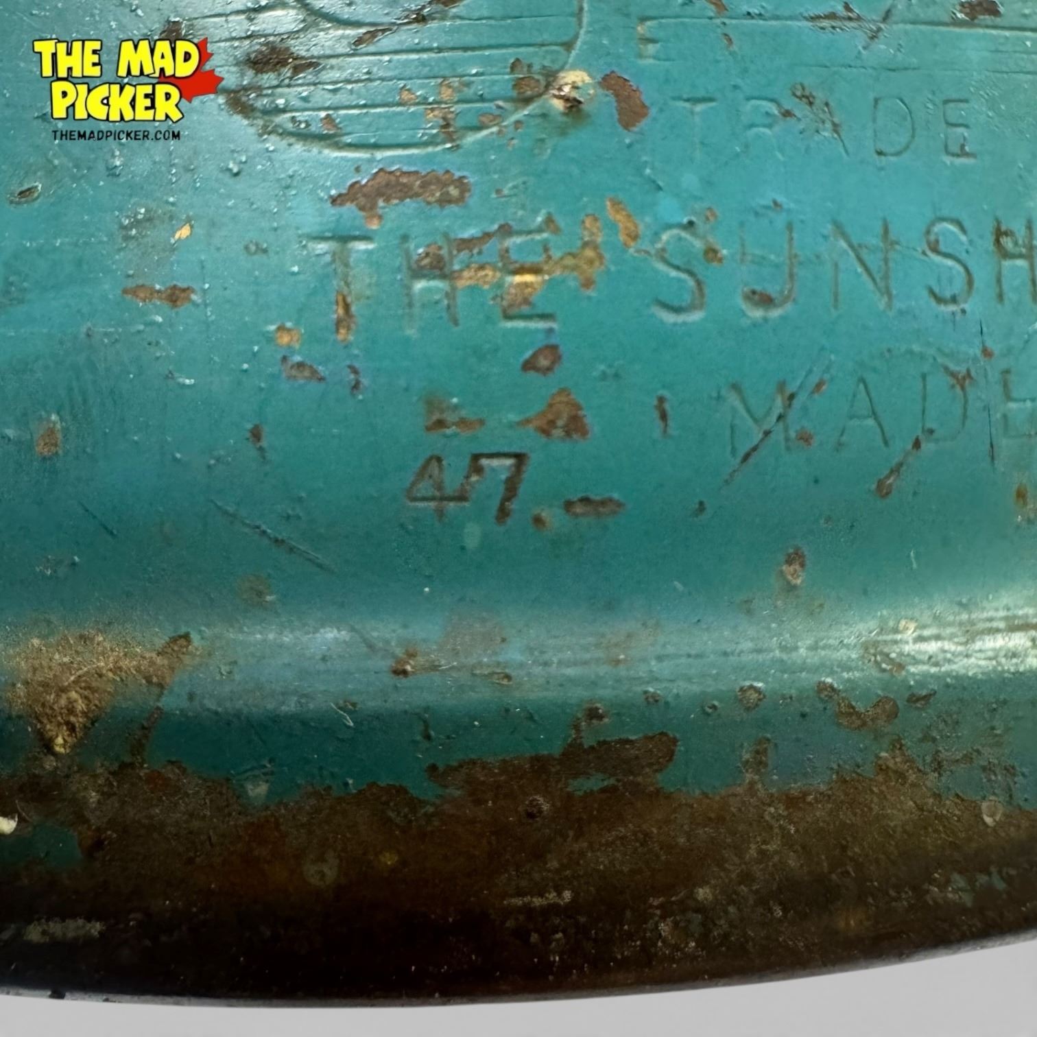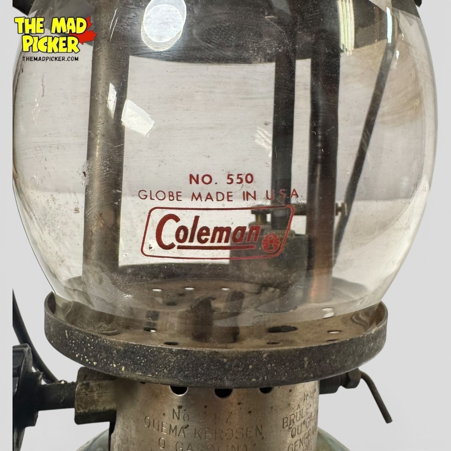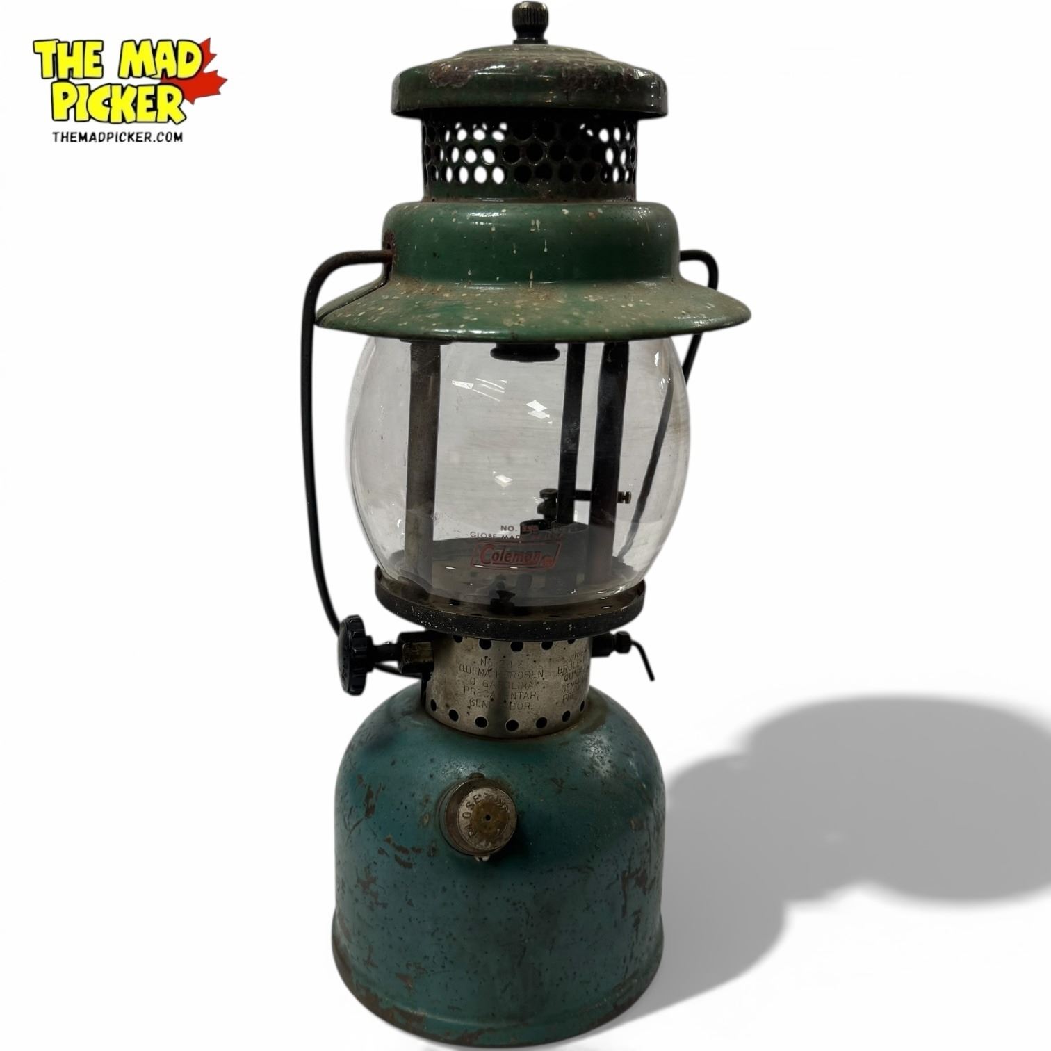 Coleman Model 249 Scout lantern in seafoam green, produced in 1947. Designed for kerosene fuel with a single-mantle system, this model features a brass fount and globe holder. Manufactured in Wichita, Kansas, the 249 Scout is notable for its compact size and outdoor utility. Stamped production year on base.