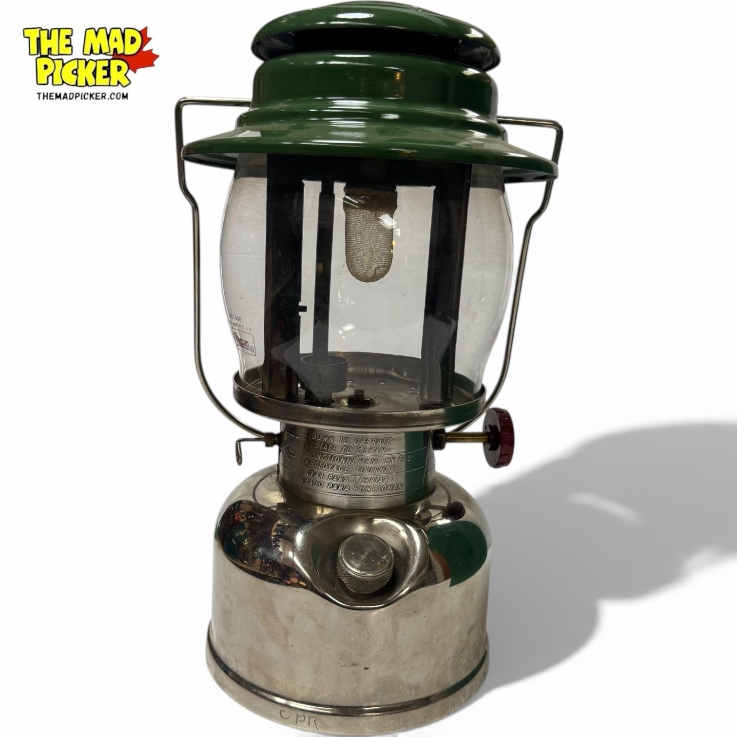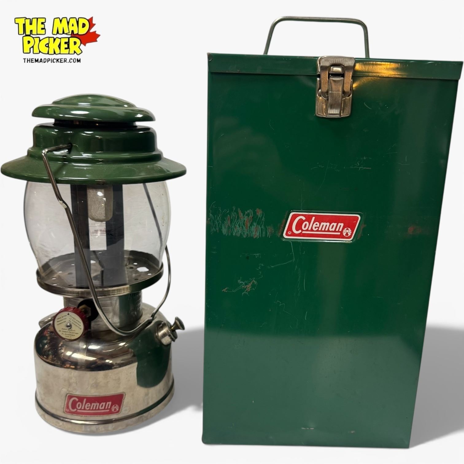 Coleman Lantern Model 639, produced in 1974. Single mantle kerosene lantern with nickel-plated fount and ventilator. Includes original metal carrying case for portability and protection. Designed for outdoor use with durable construction. Approximately 13 inches tall.