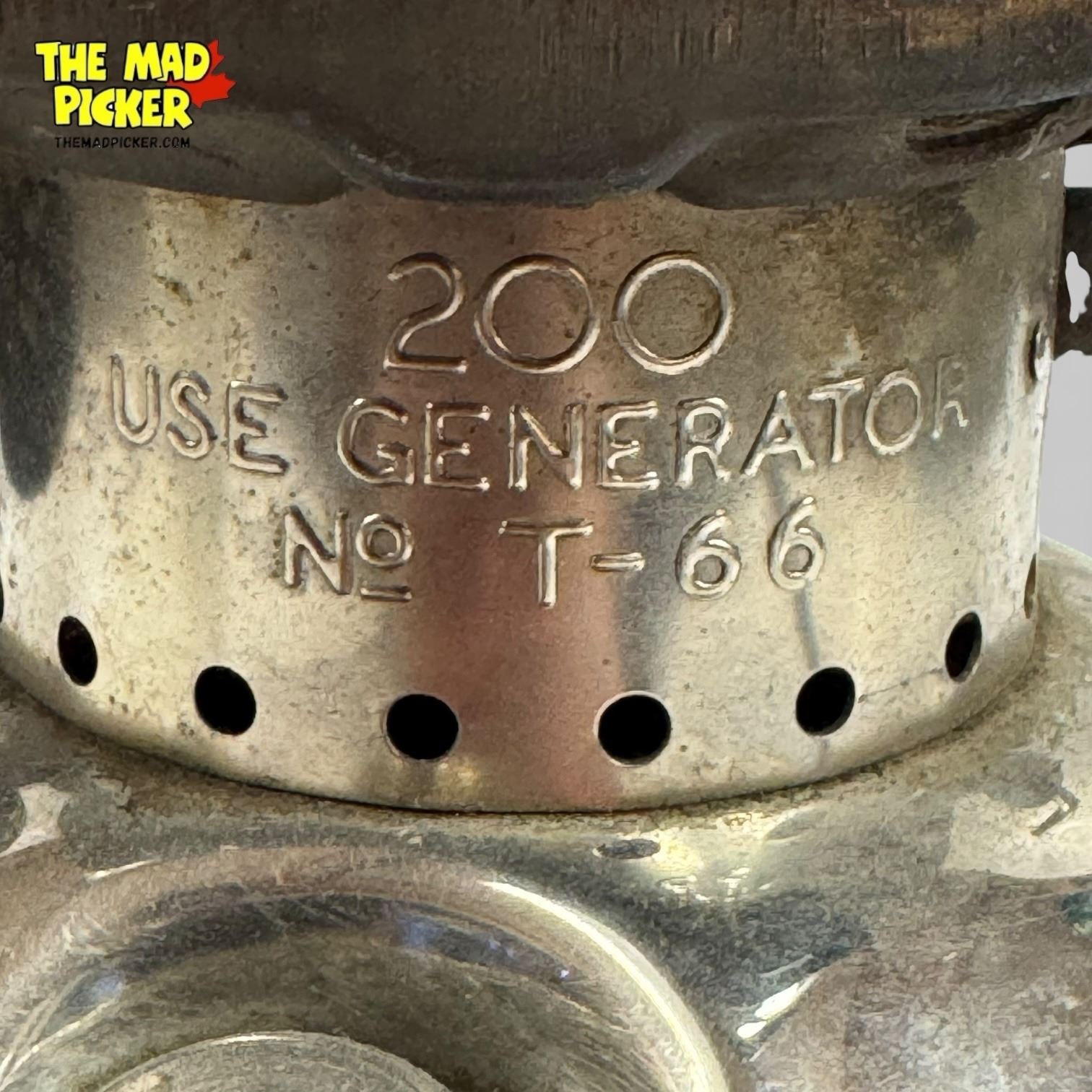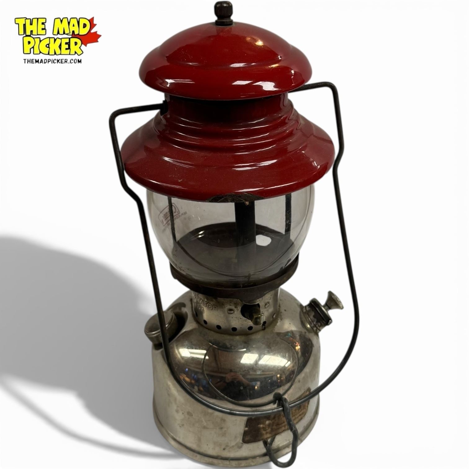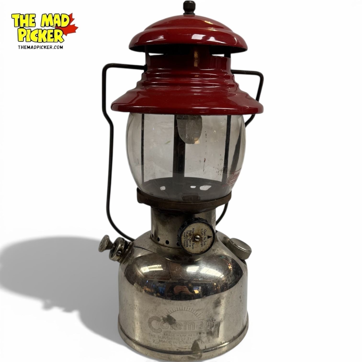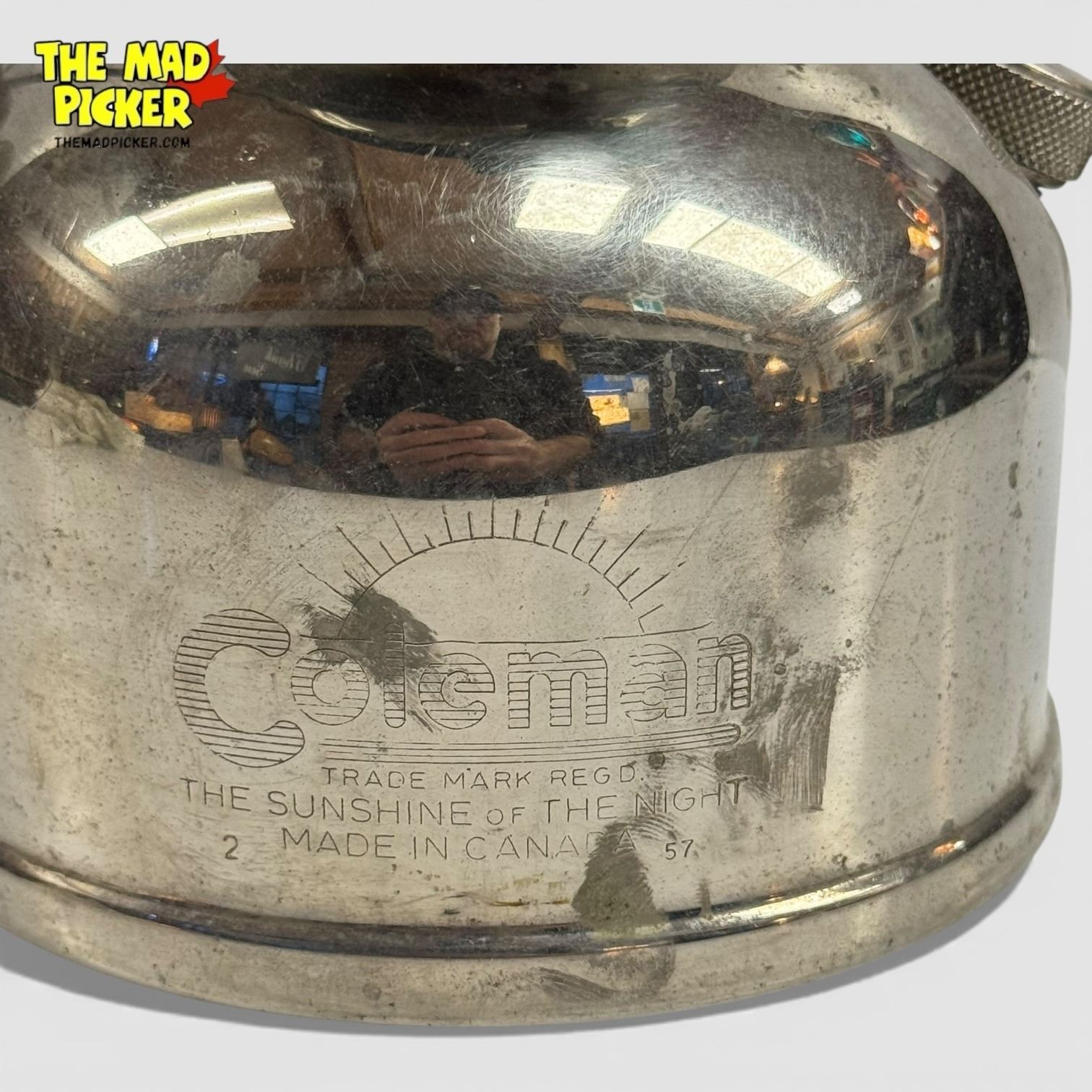 Coleman Model 200 lantern with nickel-plated fount, manufactured in Canada in 1957. Single mantle design with red vent. Designed for white gas fuel. Features stamped production date on the bottom. Known for durable build and reliable lighting, popular among camping enthusiasts during its production era.