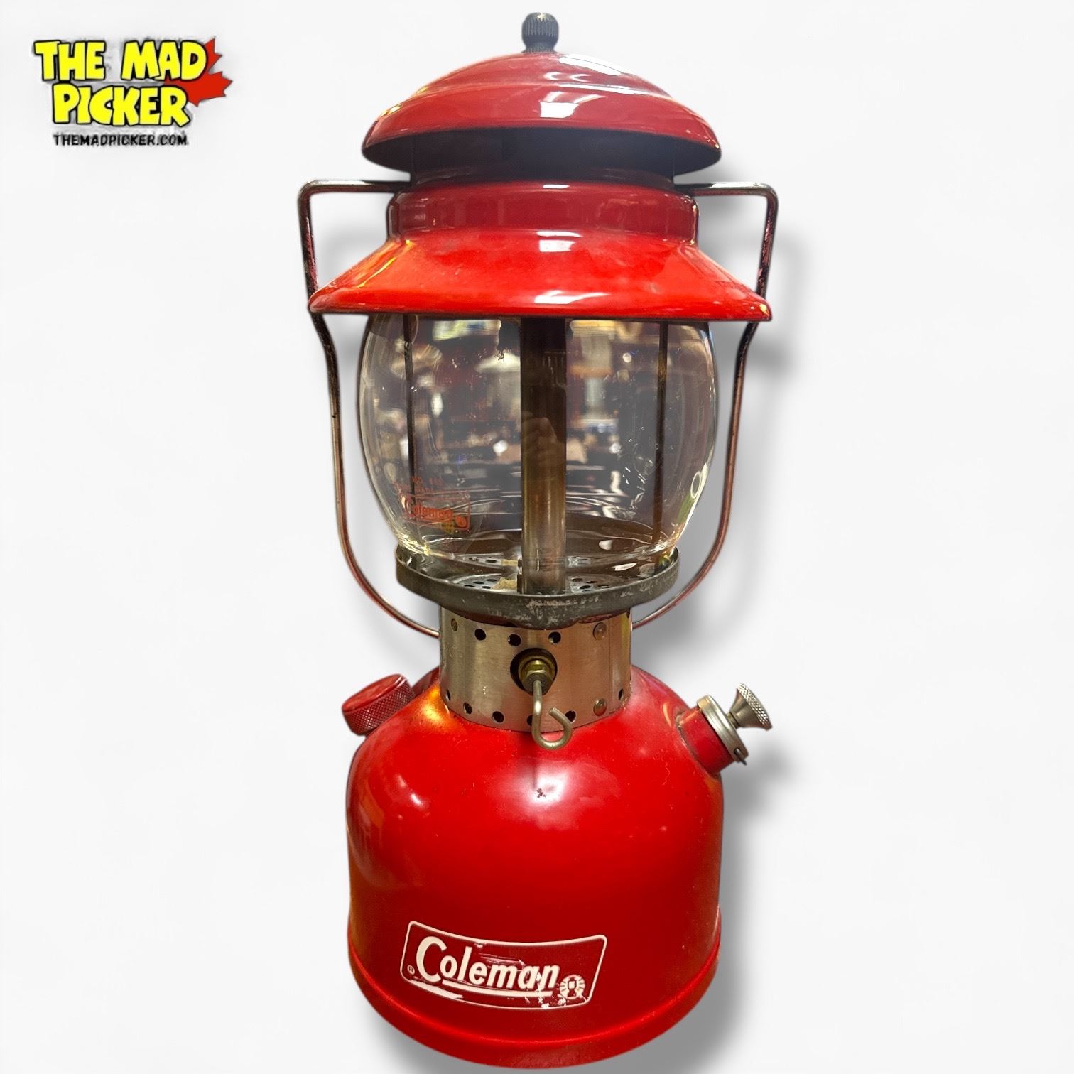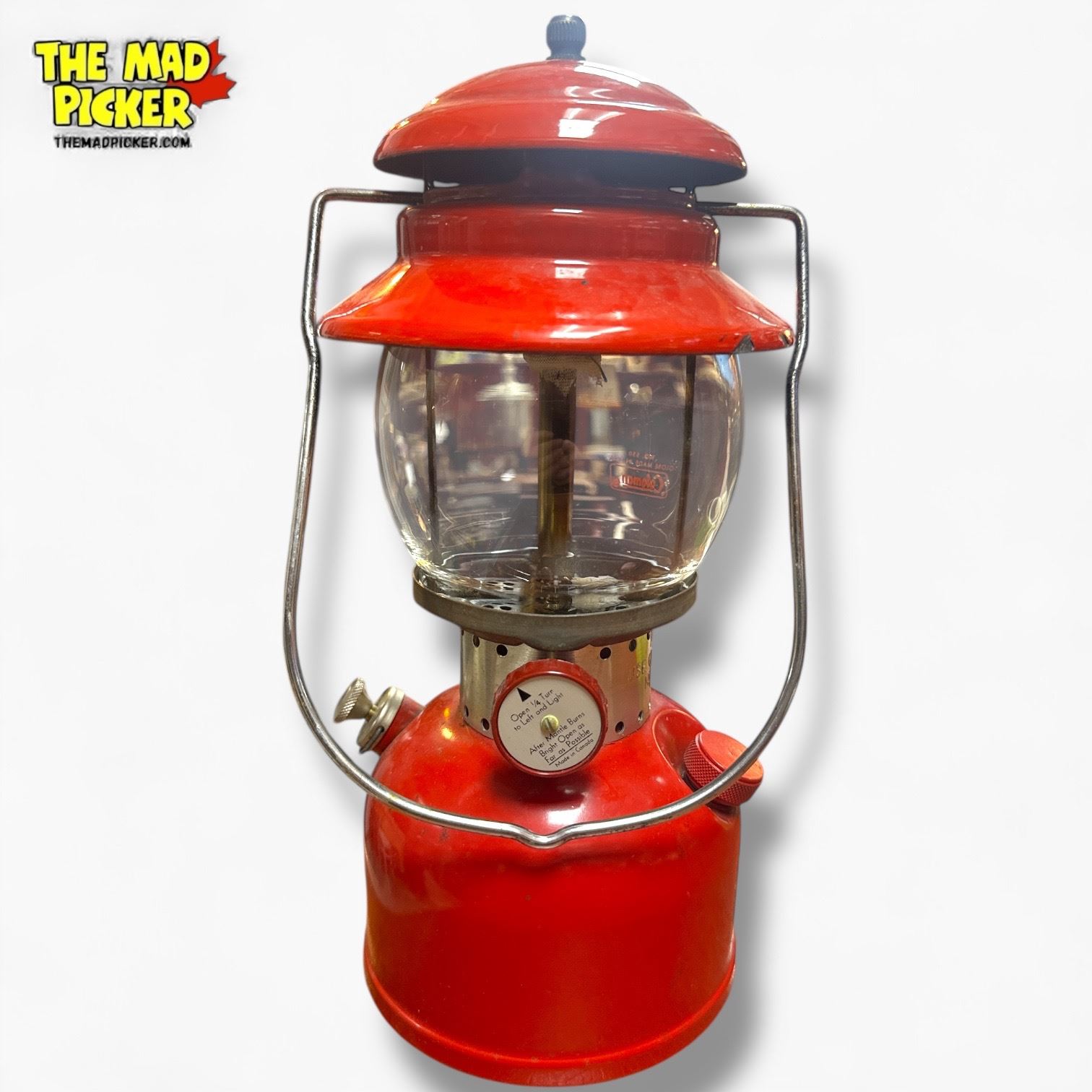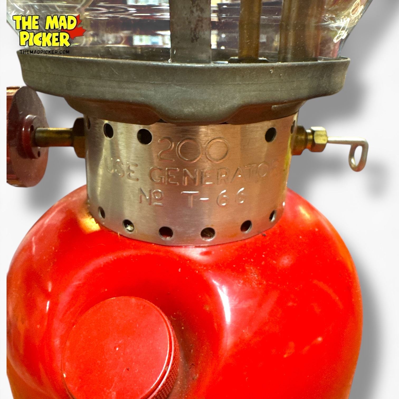 Coleman Model 200 red lantern, manufactured in Canada. Features an all-red enamel finish and single-mantle design. Precise production date is undated but belongs to the Model 200 series made from 1951-1962. Designed for outdoor use, uses white gas fuel. Classic Canadian-made design.