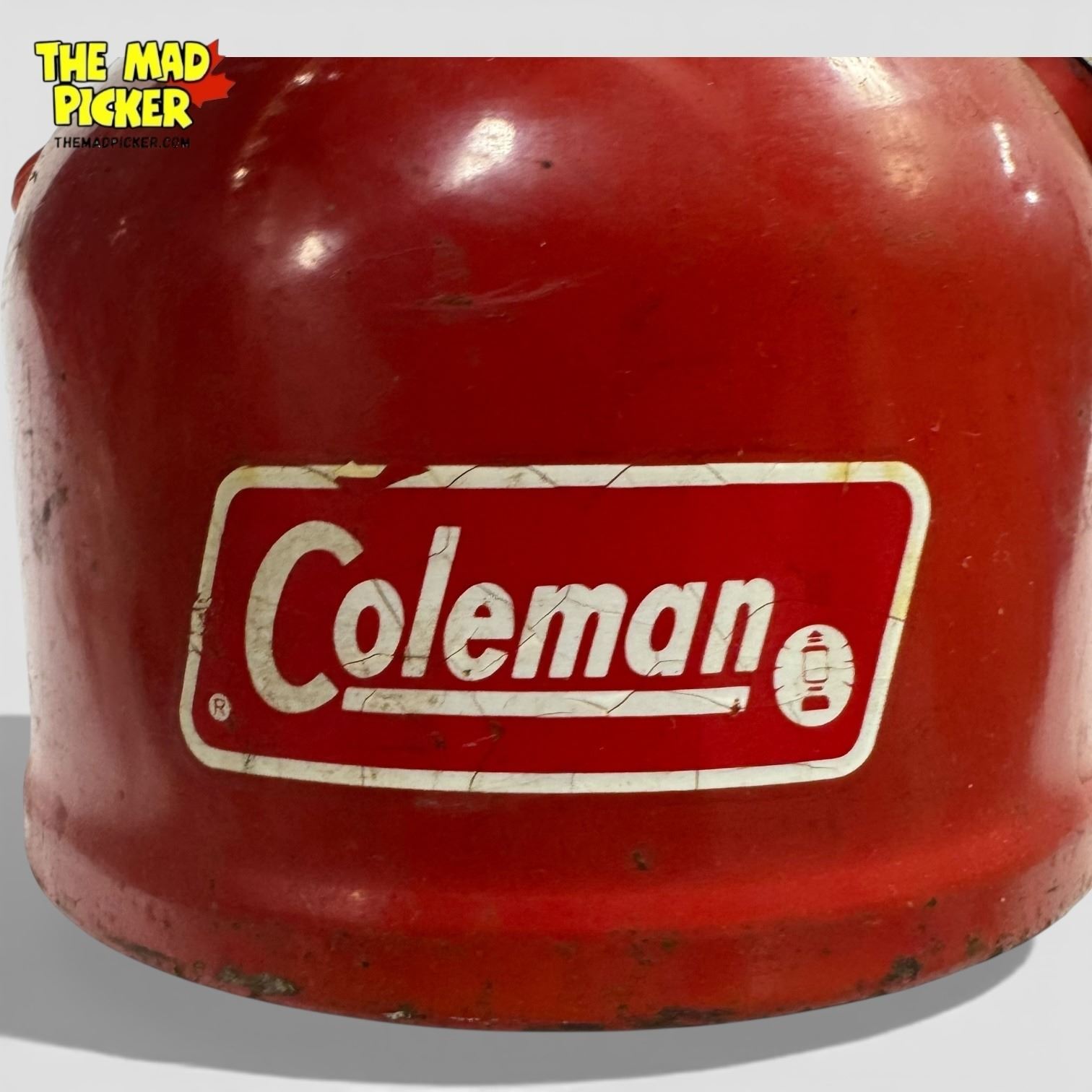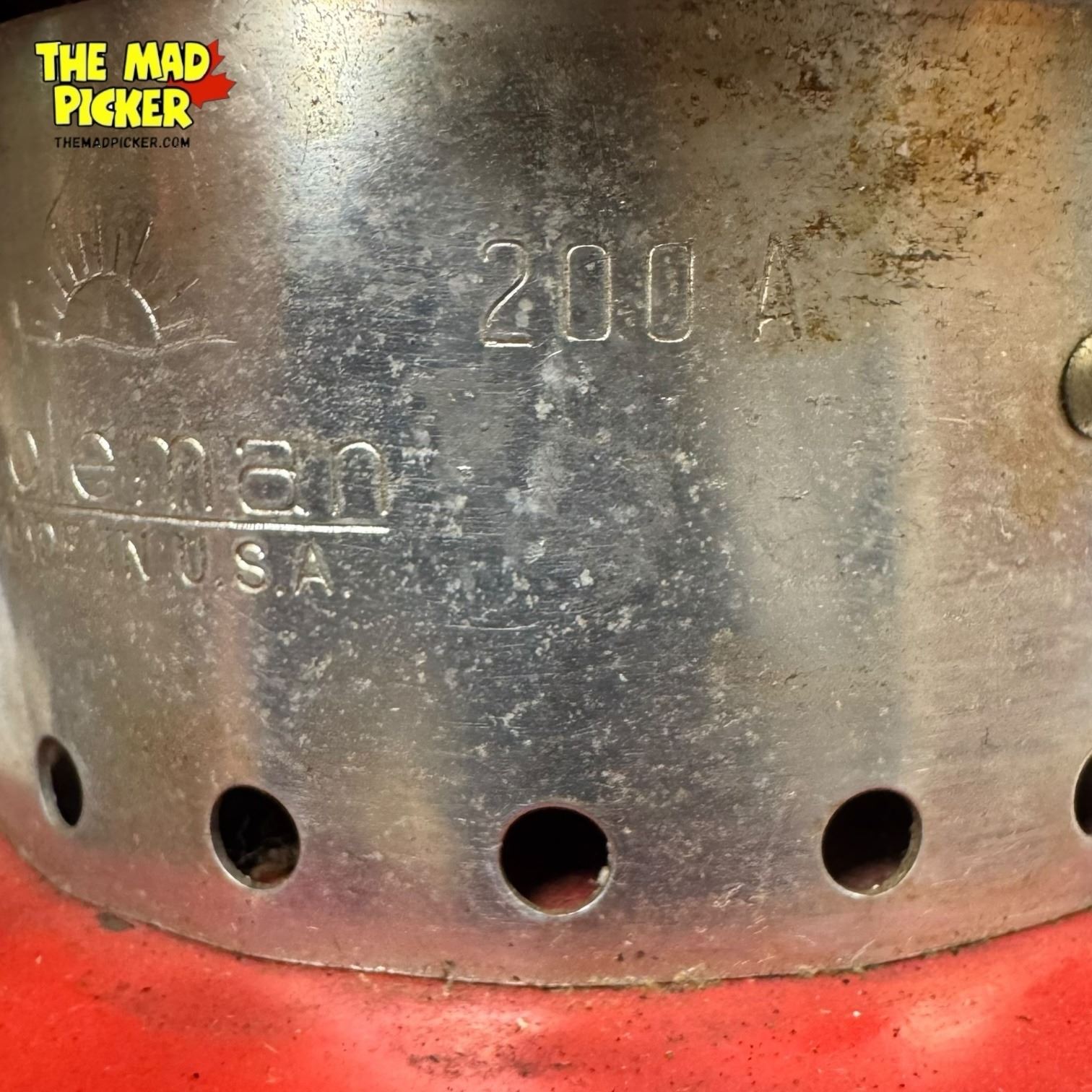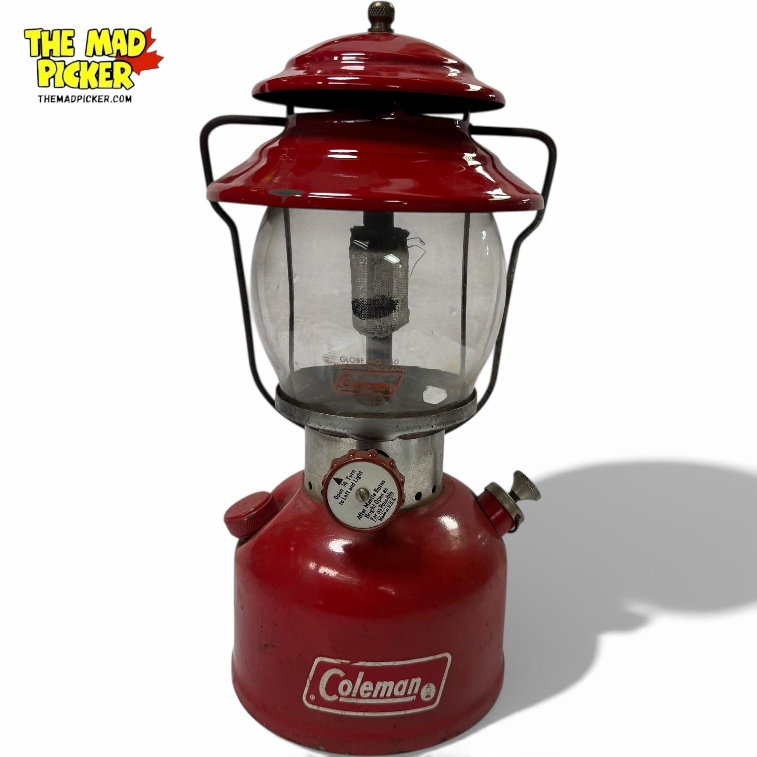 Coleman Model 200A lantern, manufactured in the USA in 1972. Features a red enamel top and single mantle design, known for its compact build. Operates on white gas. Includes original metal globe guard and clear glass globe etched with Coleman logo. Popular for camping and outdoor use during its production era.