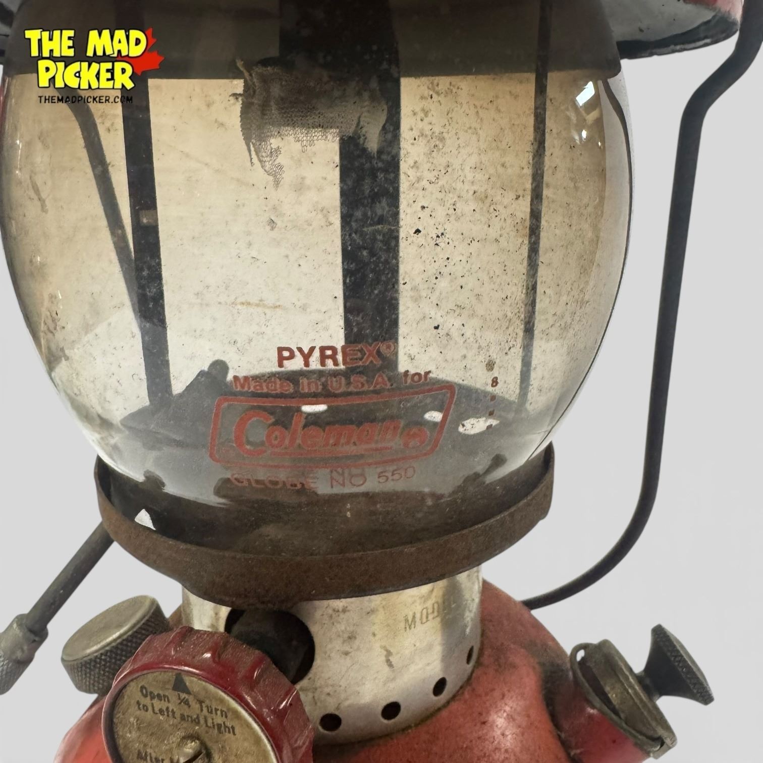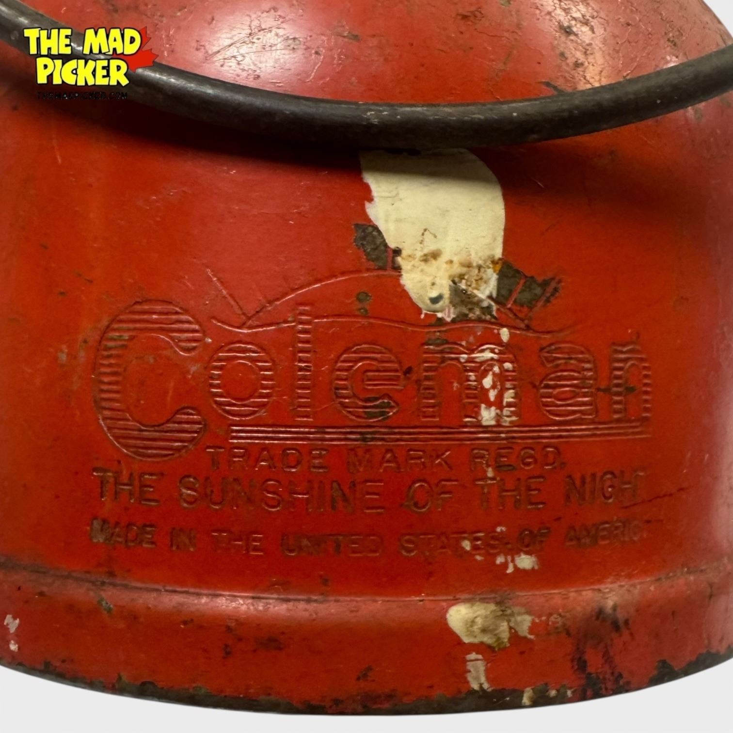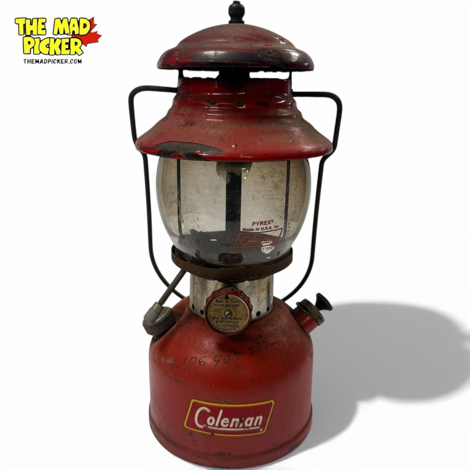 Coleman Model 200A kerosene lantern in red, dated 1959. Single mantle design, made in the USA. Features a steel fount and green ventilator. Compact design suitable for outdoor use. The 200A model was produced from the 1950s to early 1980s, with this example representing late 1950s manufacturing.