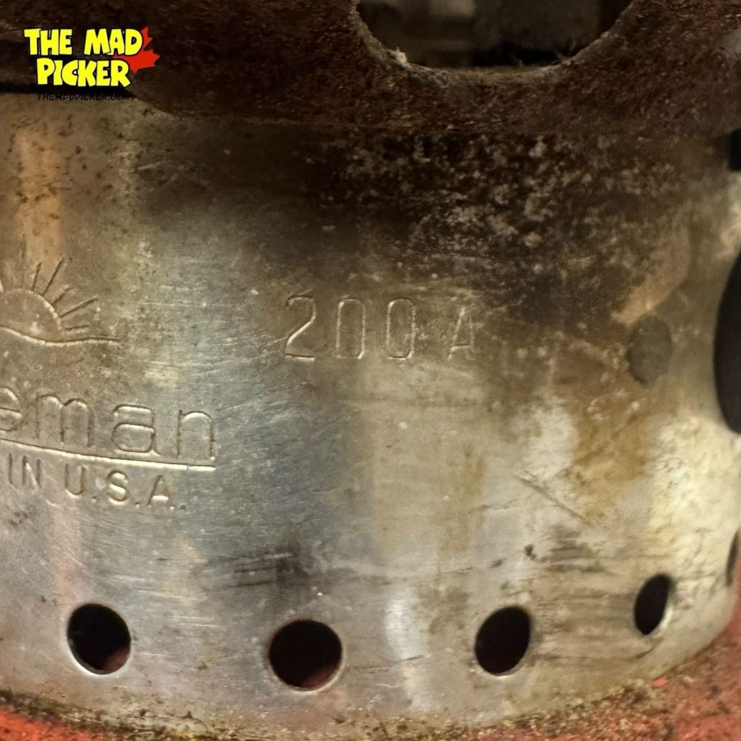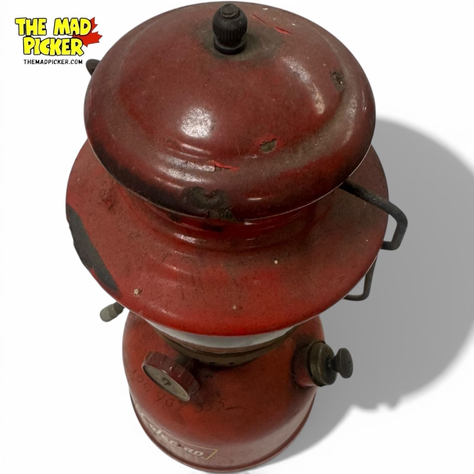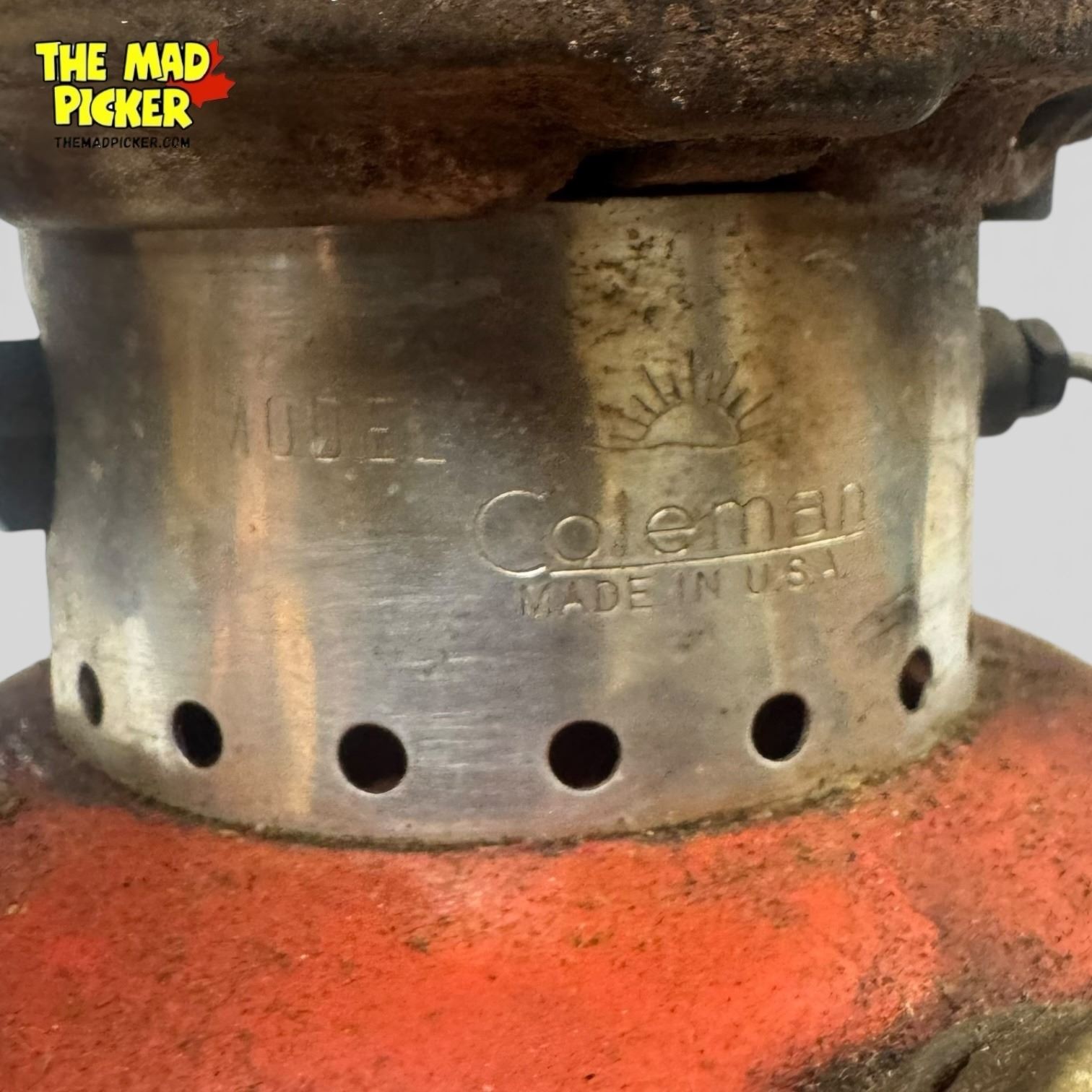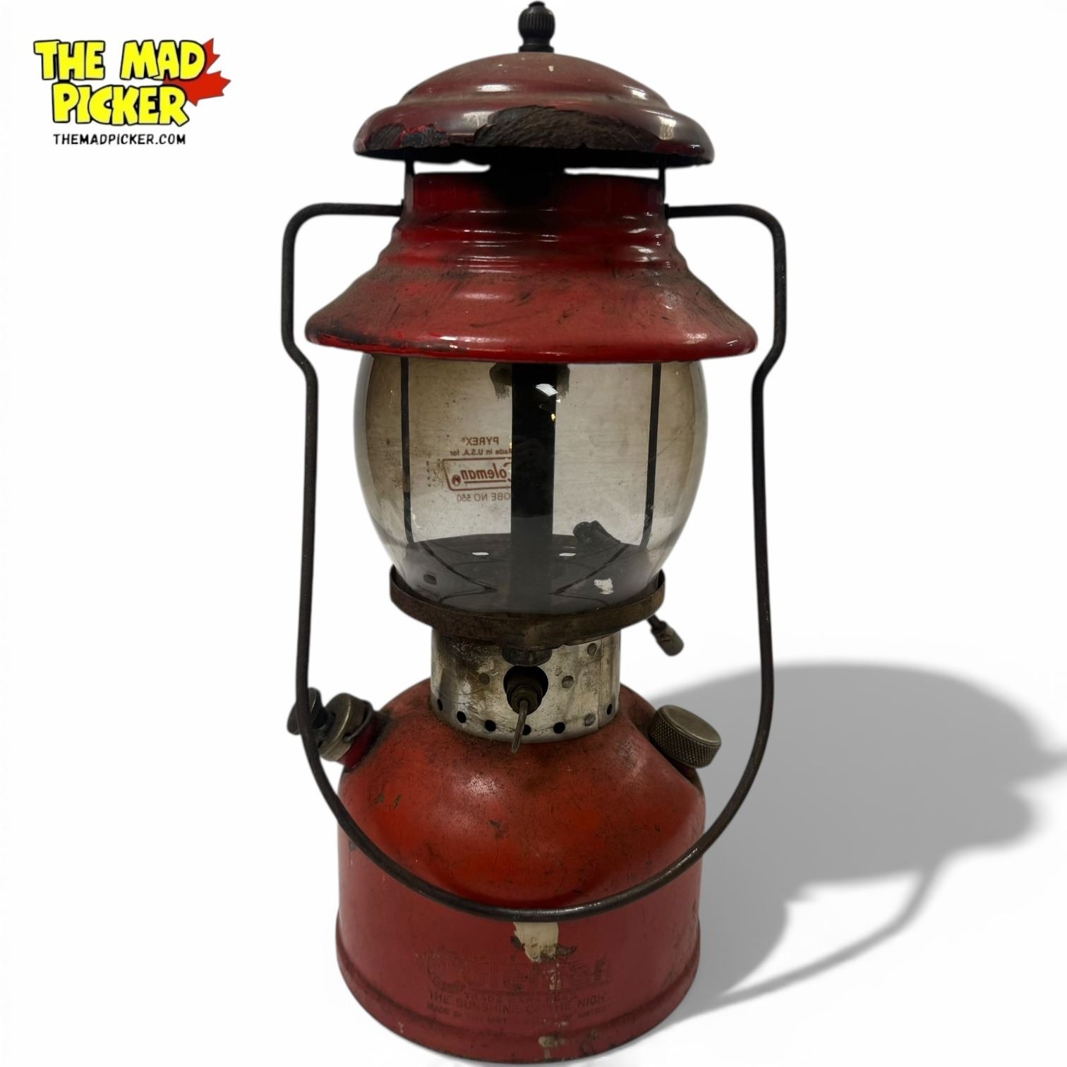 Coleman Model 200A kerosene lantern in red, dated 1959. Single mantle design, made in the USA. Features a steel fount and green ventilator. Compact design suitable for outdoor use. The 200A model was produced from the 1950s to early 1980s, with this example representing late 1950s manufacturing.