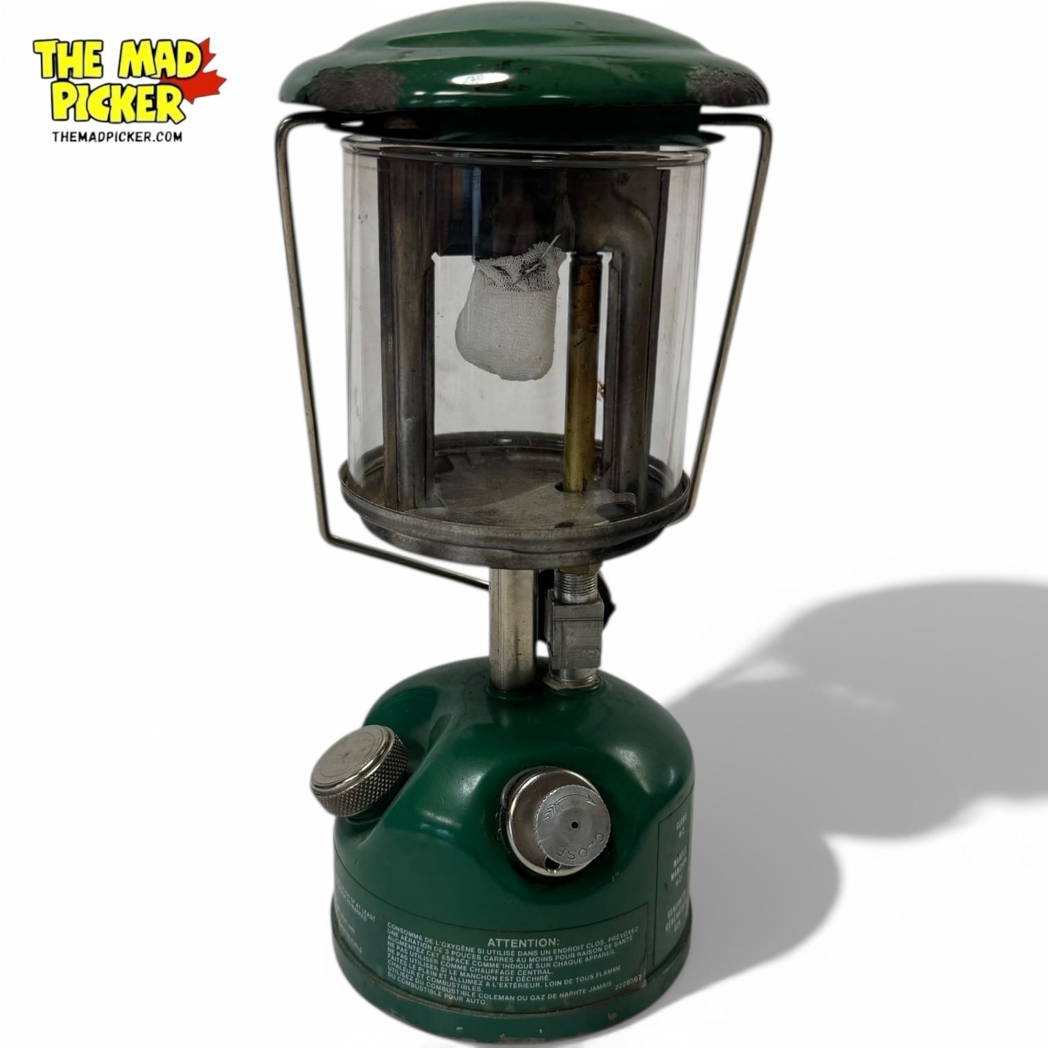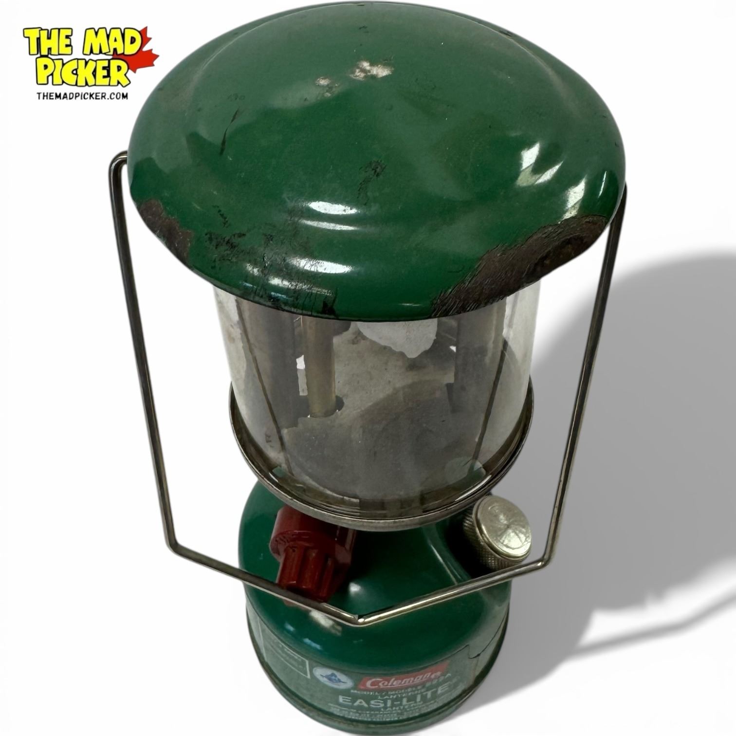 Coleman Model 222A single mantle lantern in green. Manufactured in 1984 in the USA. Designed as a compact backpacking lantern, it features a metal frame, glass globe, and adjustable light output. Runs on white gas, with a fuel capacity of 0.2 gallons. Includes metal bail handle for portability.