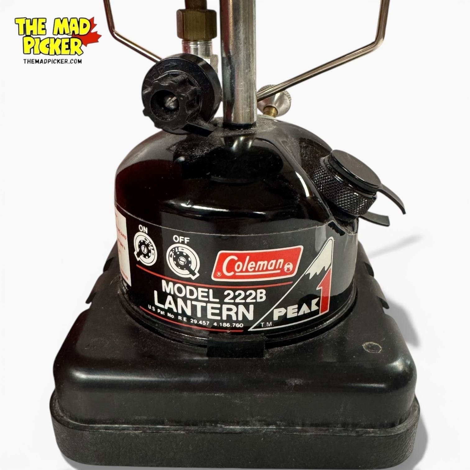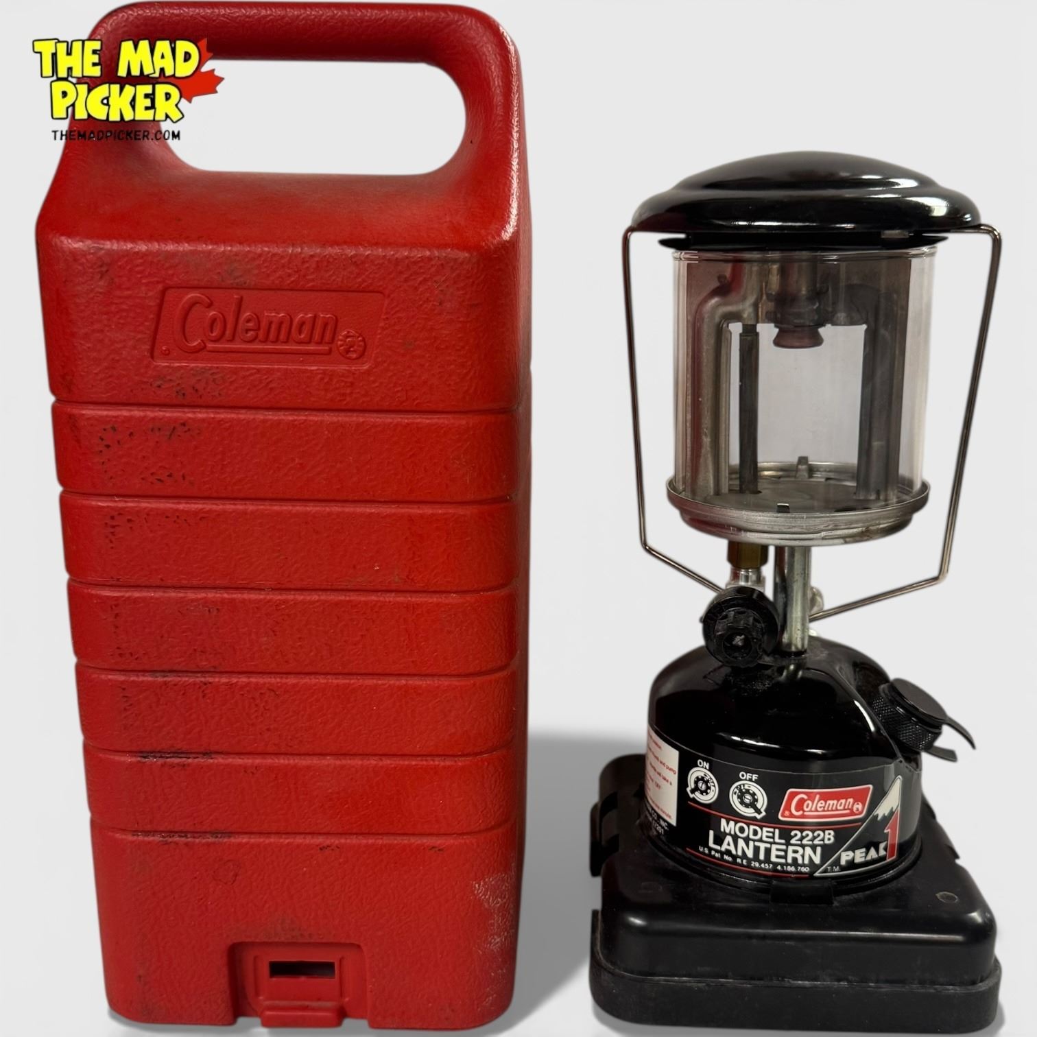Coleman Model 222B gas lantern in black finish, designed for compact portability. Produced in 1989, featuring single mantle operation with adjustable brightness. Includes original hard plastic carrying case for storage and transport. Popular for camping and outdoor use.