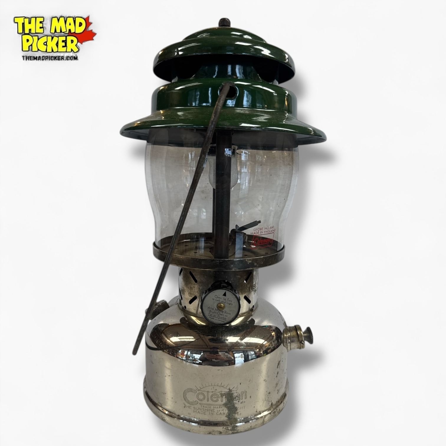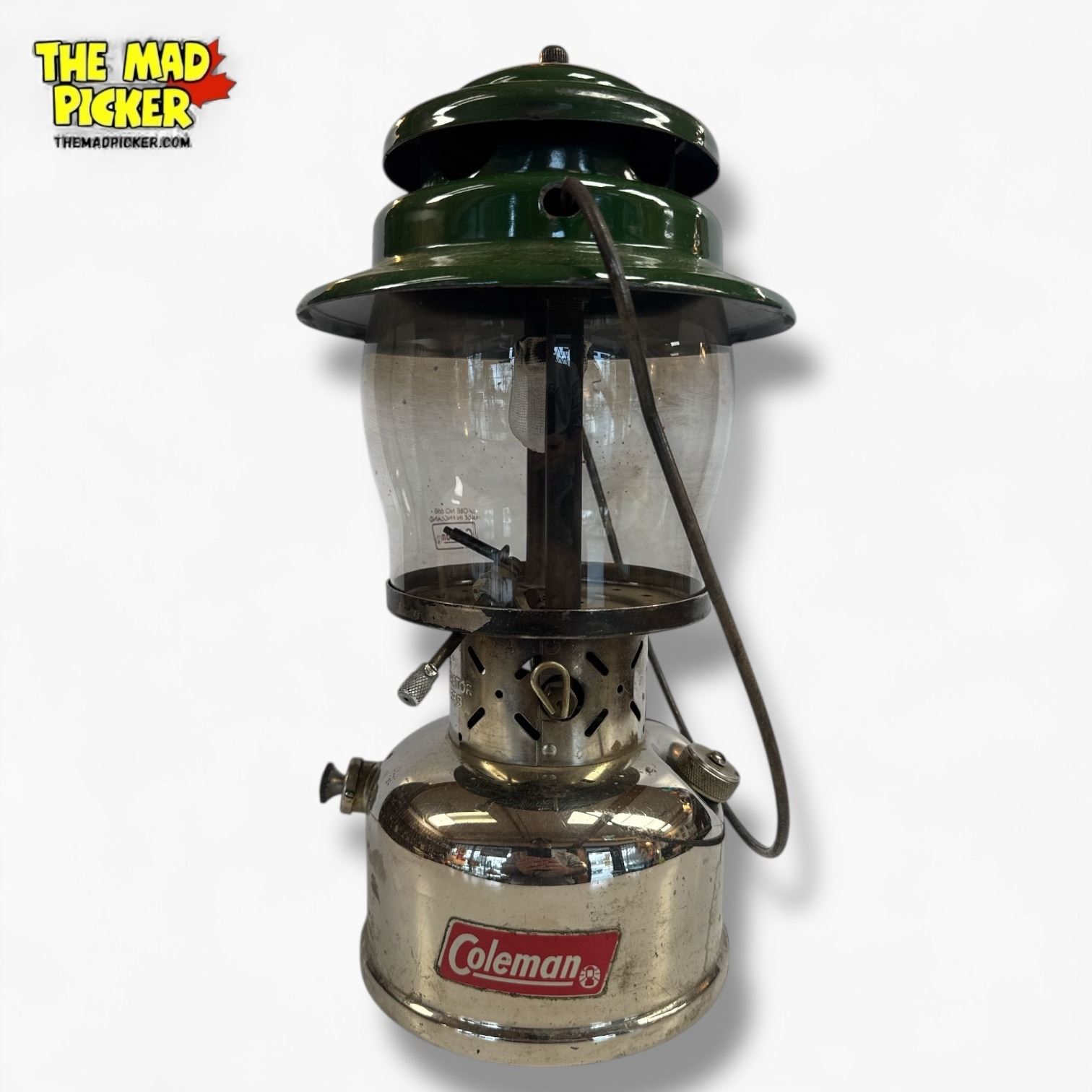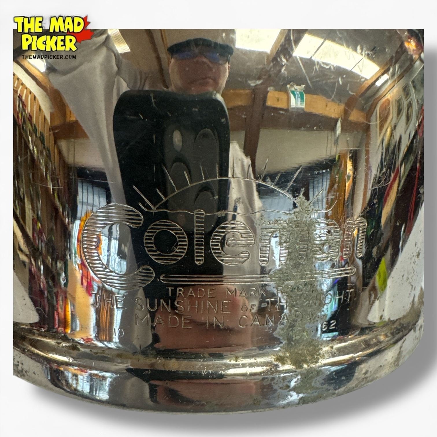 Coleman Model 236 lantern, nickel-plated, dated 1962. Single mantle design with 500 candle power output. Made in Canada. Features a wide ventilator and fuel capacity for extended use. Suitable for white gas. Measures approximately 15 inches tall, excluding the bail handle.