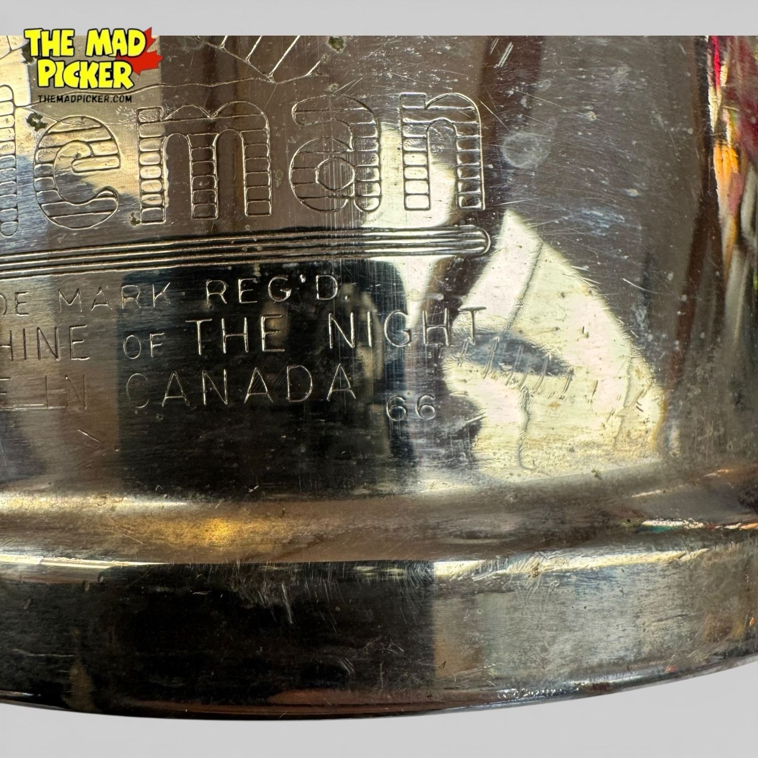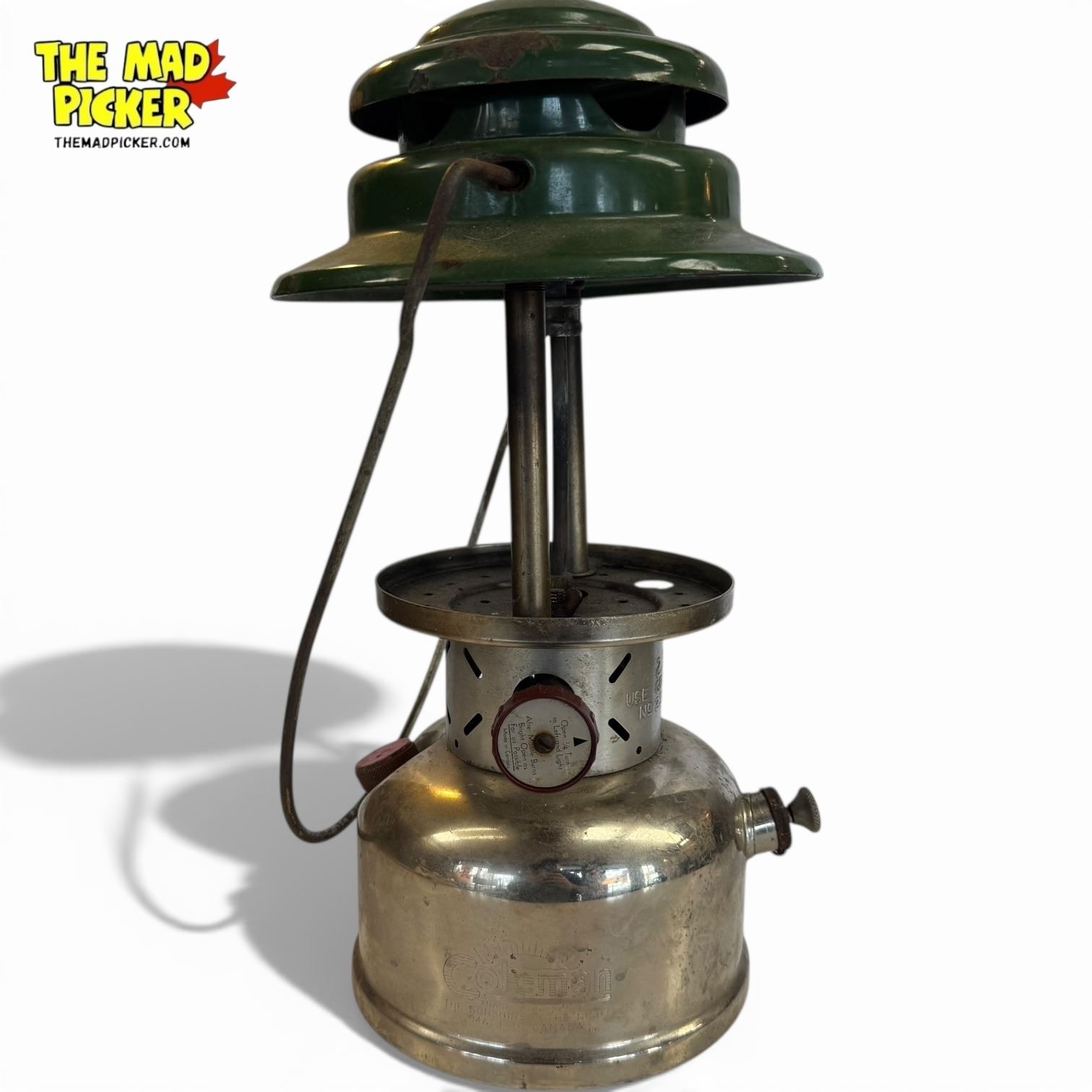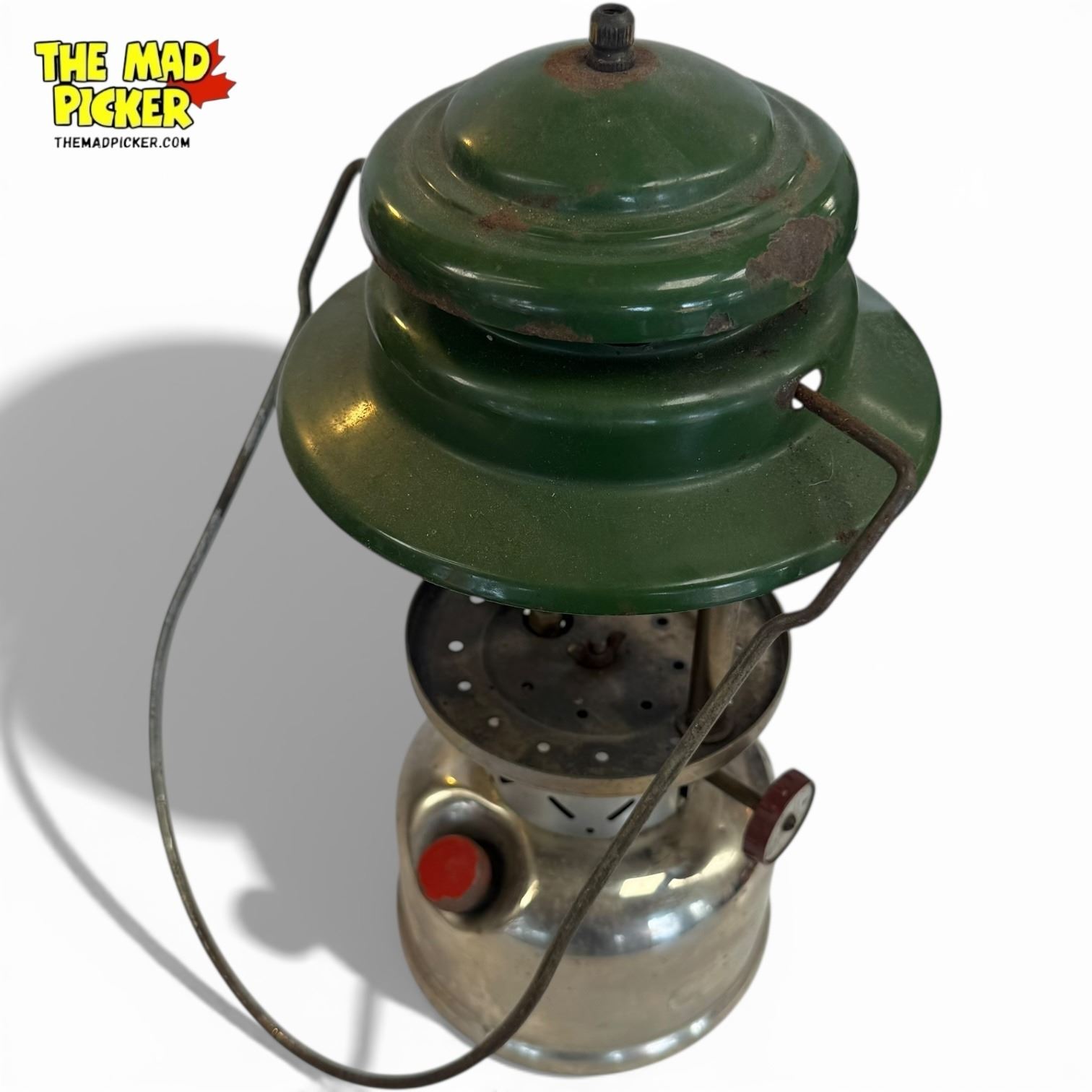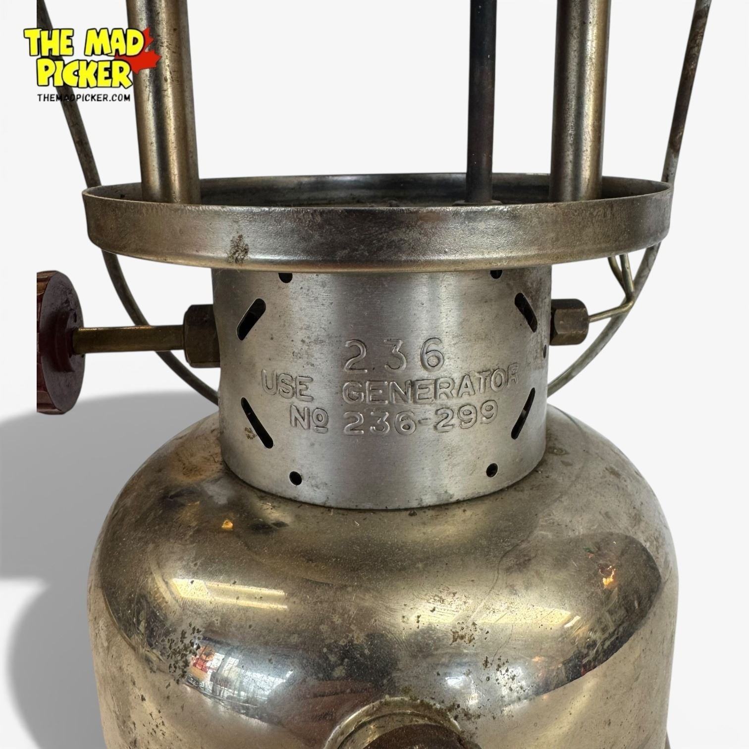 Coleman Model 236 lantern manufactured in 1966 in Canada. Single-mantle kerosene lantern designed for outdoor use. The lantern does not include its original glass globe. Metal construction with classic Coleman design, suitable for camping or utility lighting.