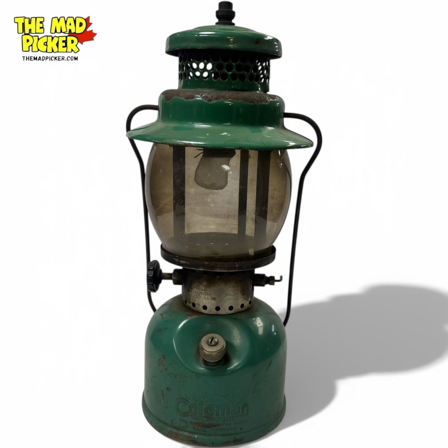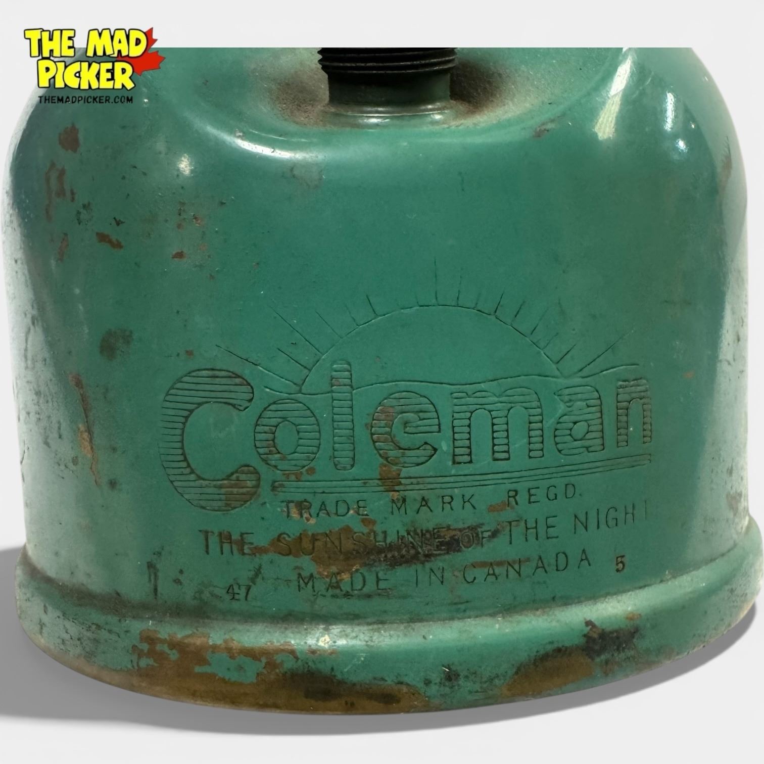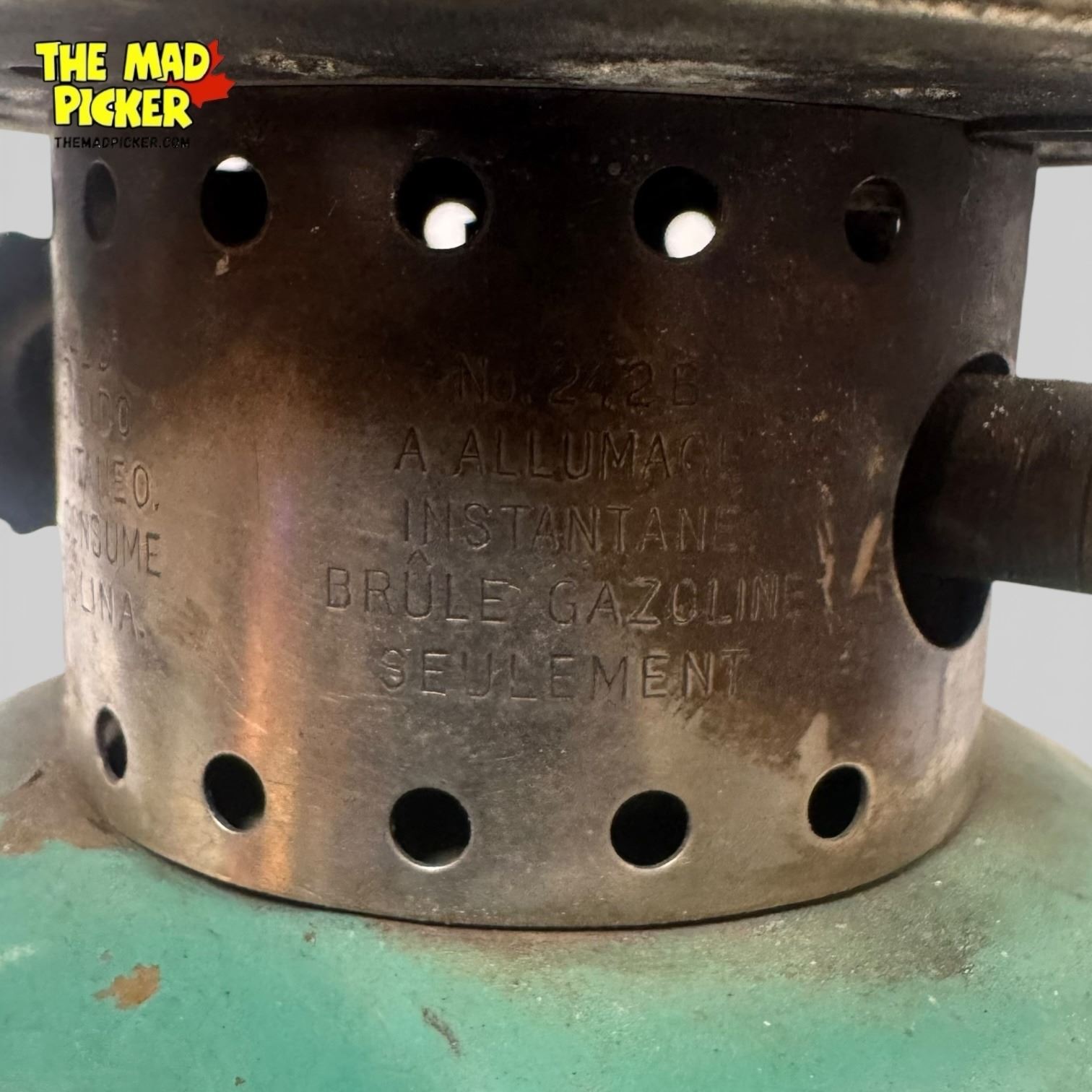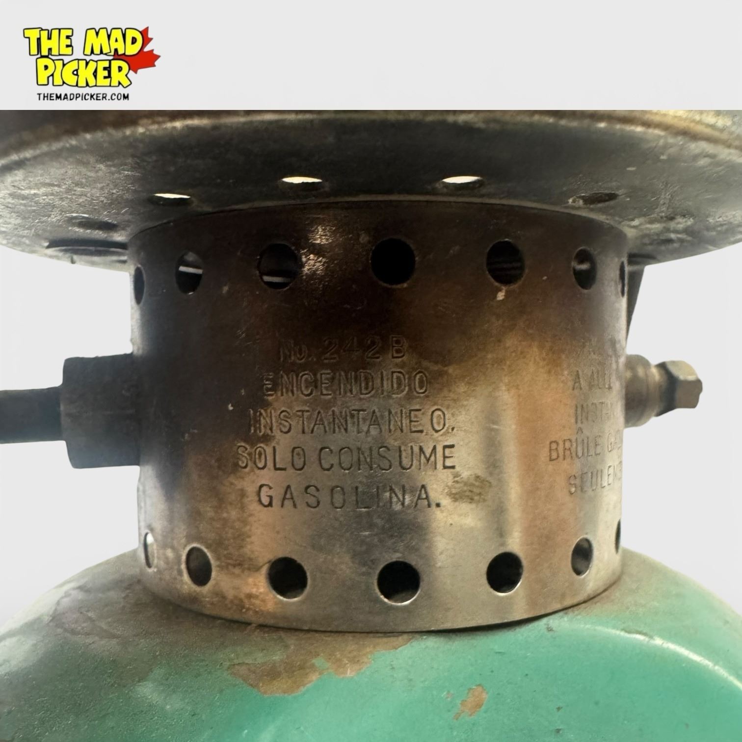 1947 Coleman Model 242B lantern in seafoam green, manufactured in Canada. Commonly used for camping and outdoor activities during post-war era. This model showcases durable craftsmanship typical of Coleman's mid-20th century production.