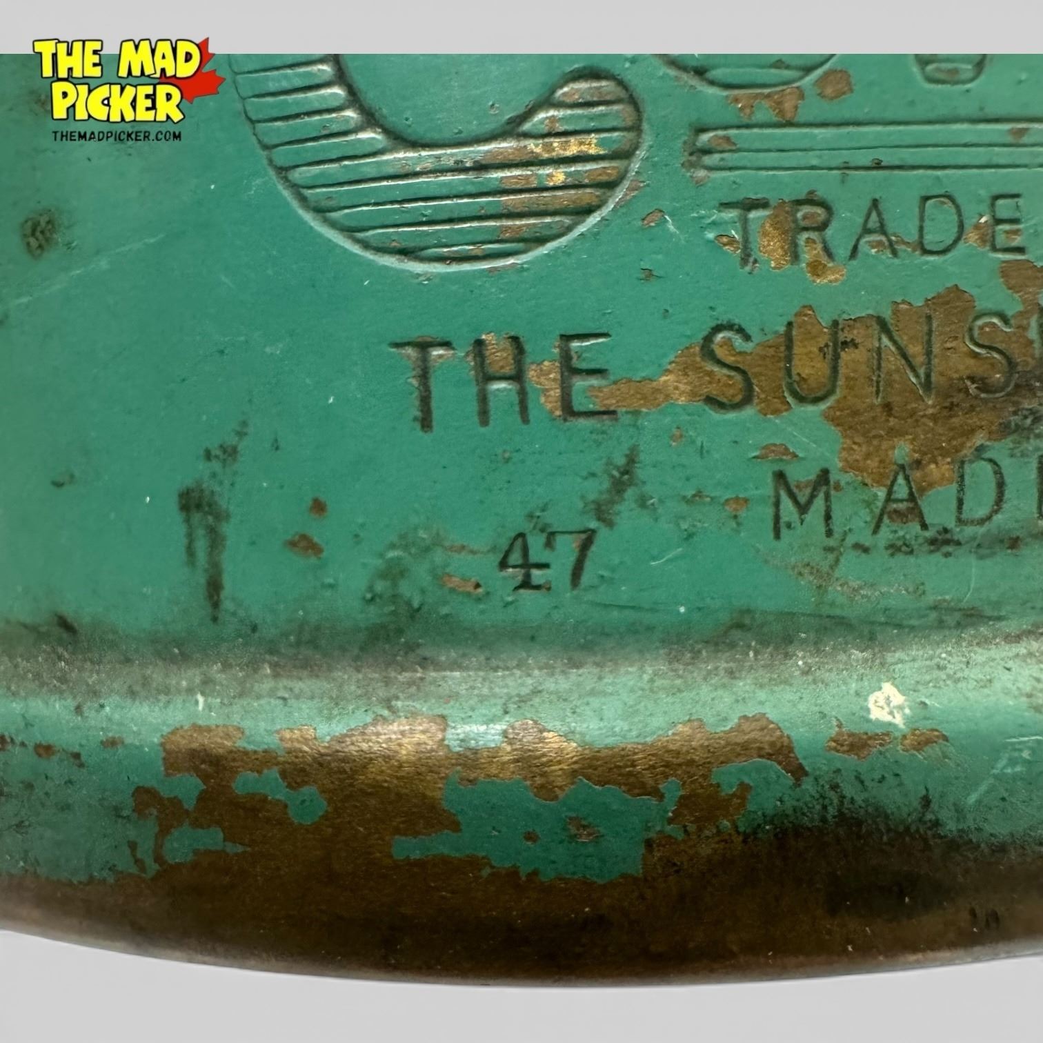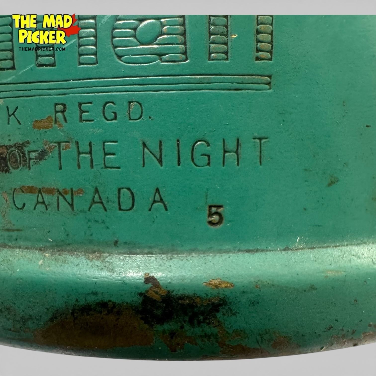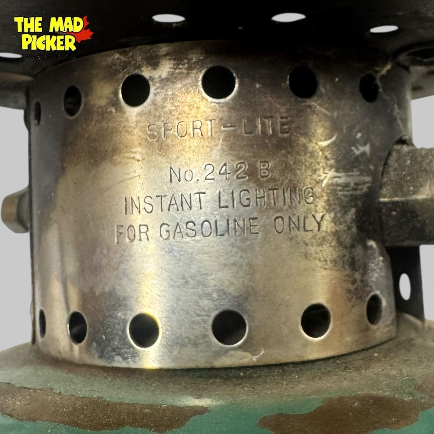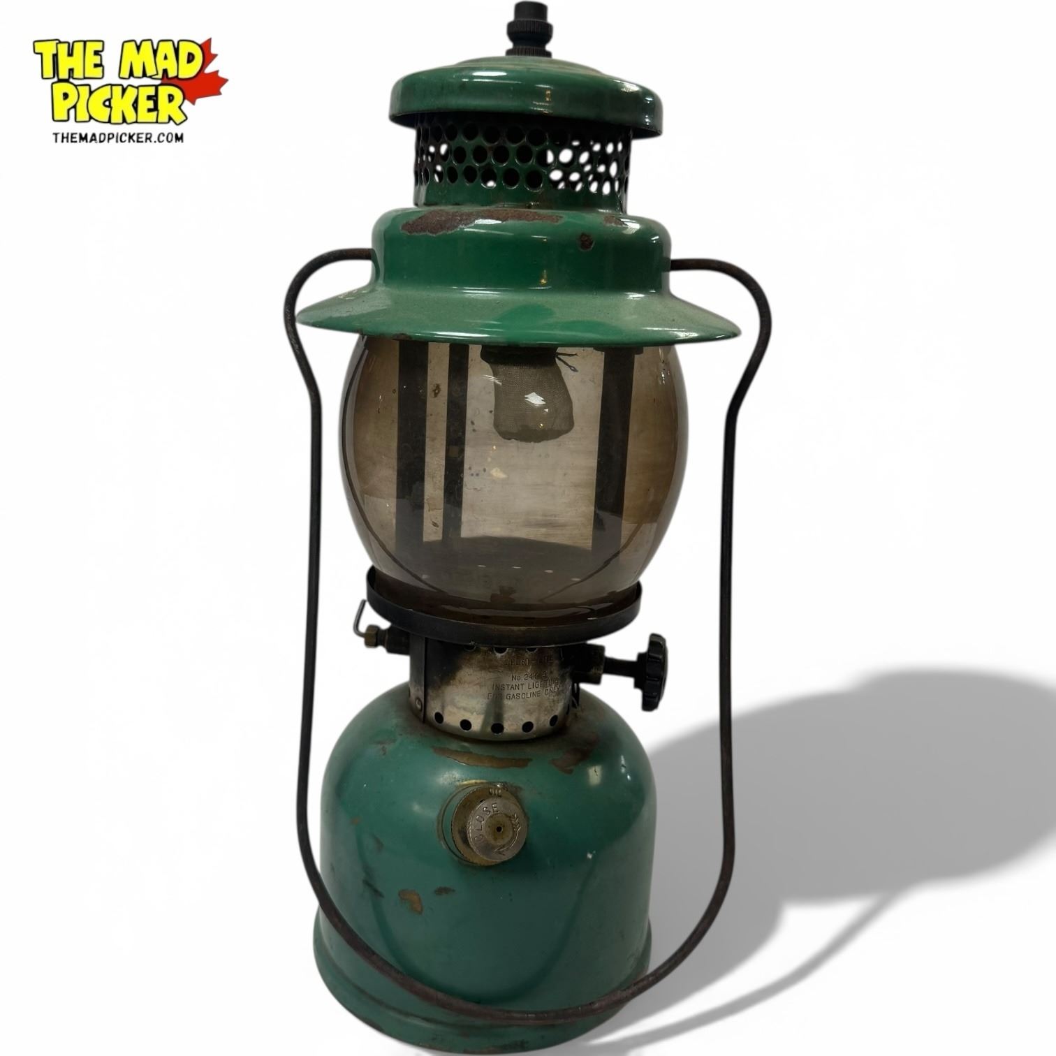 1947 Coleman Model 242B lantern in seafoam green, manufactured in Canada. Commonly used for camping and outdoor activities during post-war era. This model showcases durable craftsmanship typical of Coleman's mid-20th century production.