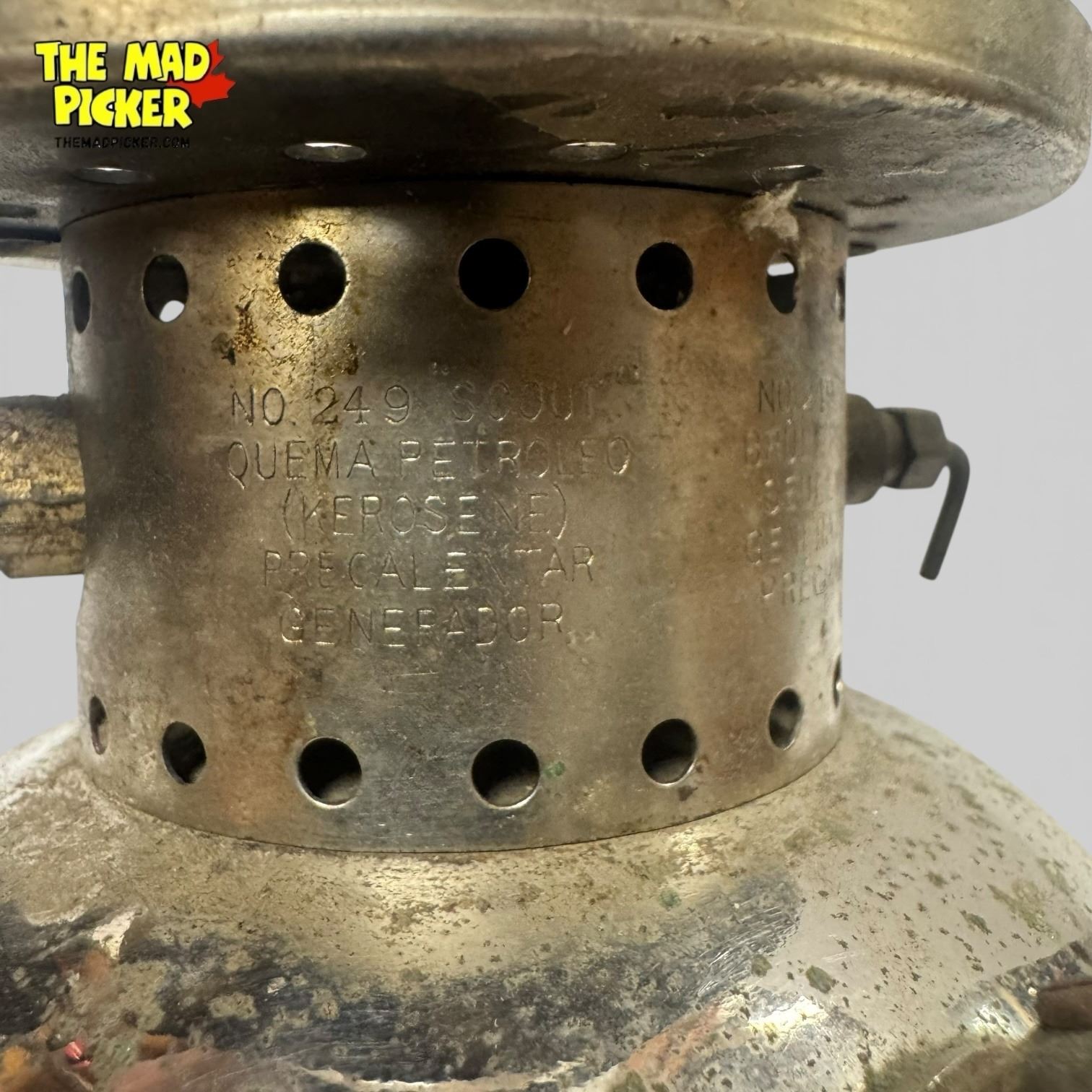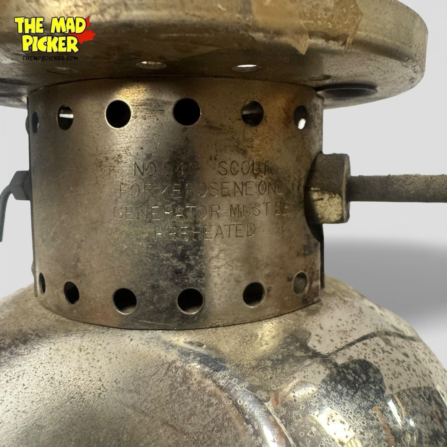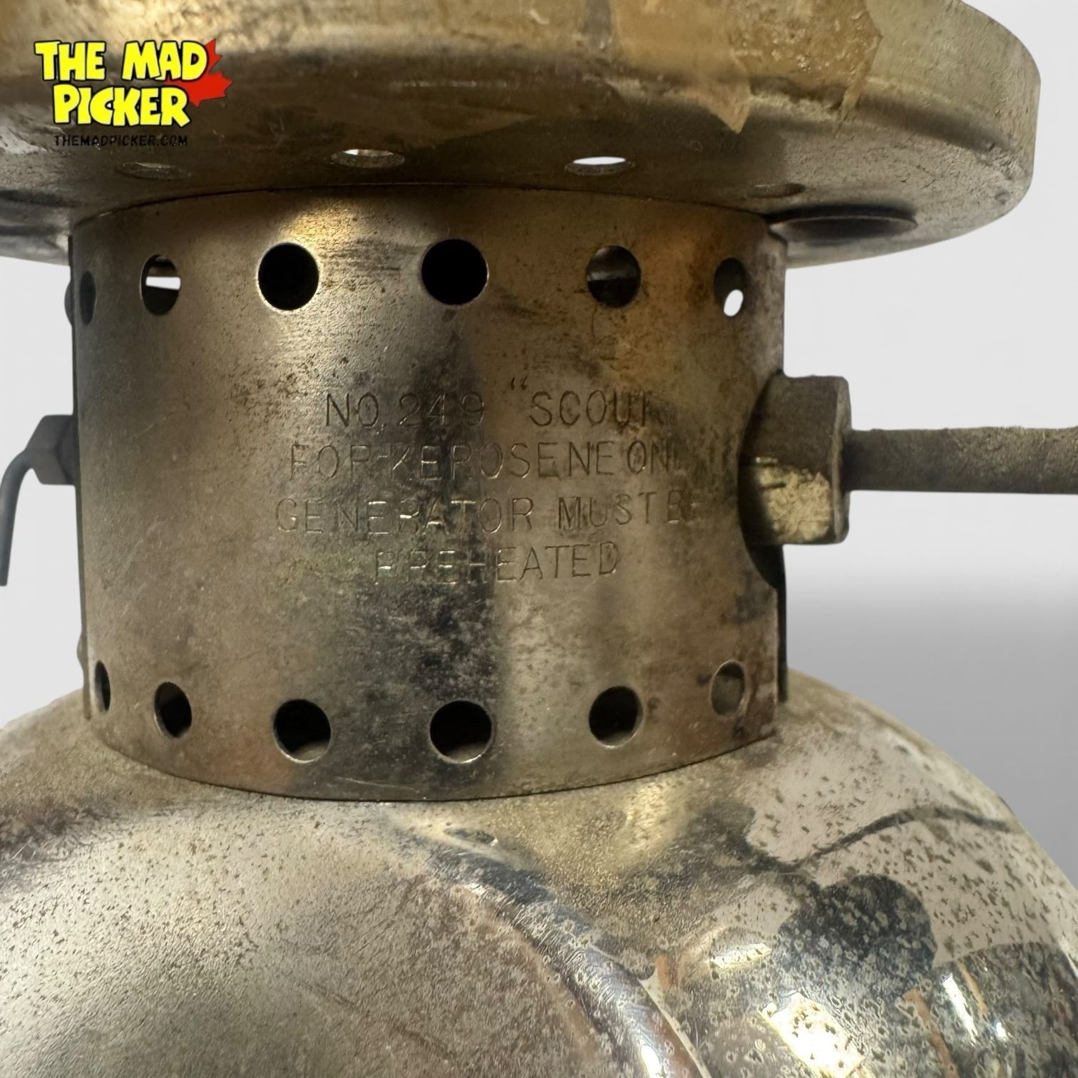 Coleman Model 249 Scout lantern manufactured in 1948. Constructed from nickel-plated brass, this single mantle kerosene lantern features a globe cage and fuel cap design typical of mid-century Coleman models. Designed for outdoor use, the 249 Scout is part of Coleman's classic utility lantern range.
