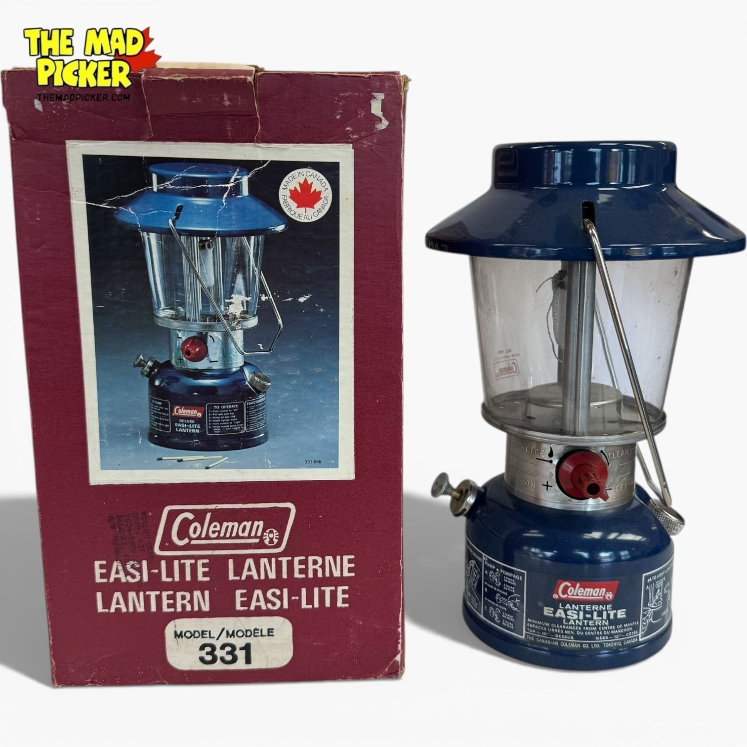 Coleman Model 331 lantern in blue, manufactured in 1978. Includes original box. Features dual-mantle design, runs on liquid fuel. Classic design with steel frame and glass globe. Made in the USA. Box shows the 1970s packaging style.