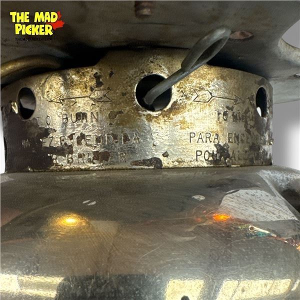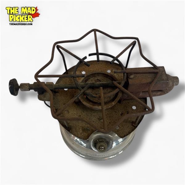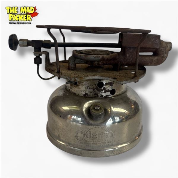 1948 Coleman Model 500 single-burner camp stove, built for use with white gasoline. Features a sturdy nickel-plated brass fuel tank and a cast aluminum burner assembly. Often referred to as the 'Speedmaster', this model is known for its compact design and efficiency. Manufactured in the USA.