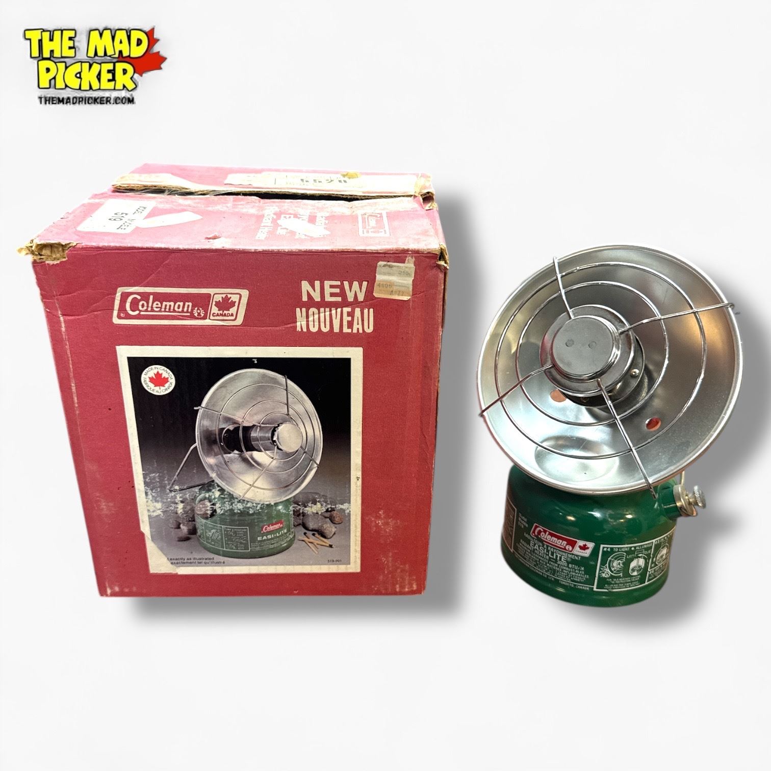 Coleman Model 519 Easi-Lite Radiant Heater, produced in 1981. Designed for camping and outdoor use, this portable heater features a metal fuel tank and radiant heating element. Compact and useful for cold weather activities. Operates on white gas. Made in the USA.