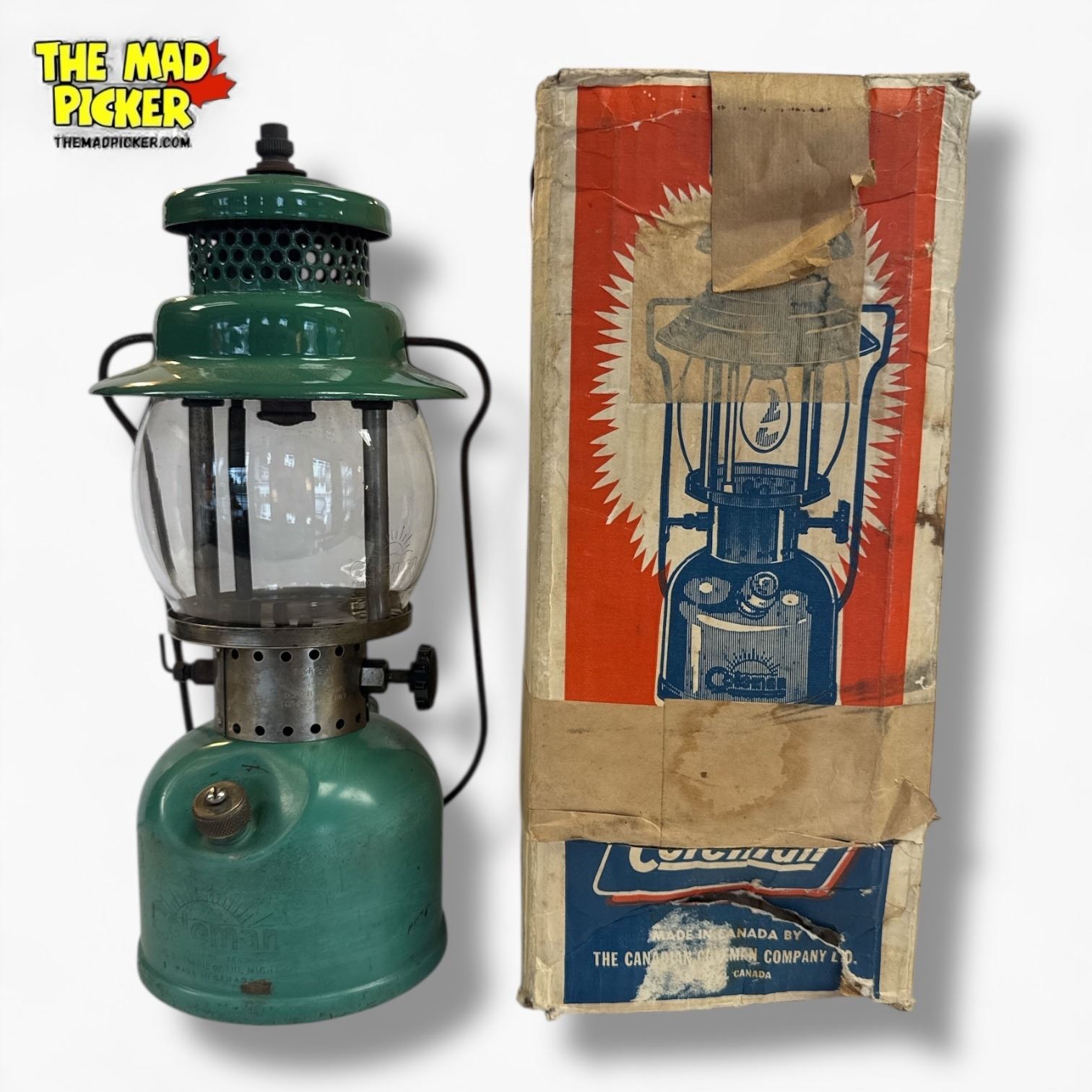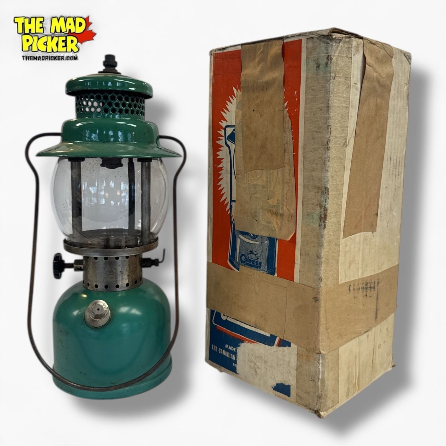 Coleman Sport-Lite lantern model 242B in seafoam green, manufactured in 1947. Single-mantle design with 300 candlepower. Includes original box. Made in Wichita, Kansas. Features brass tank and ventilator on a steel frame. Known for its durable construction and reliable performance.