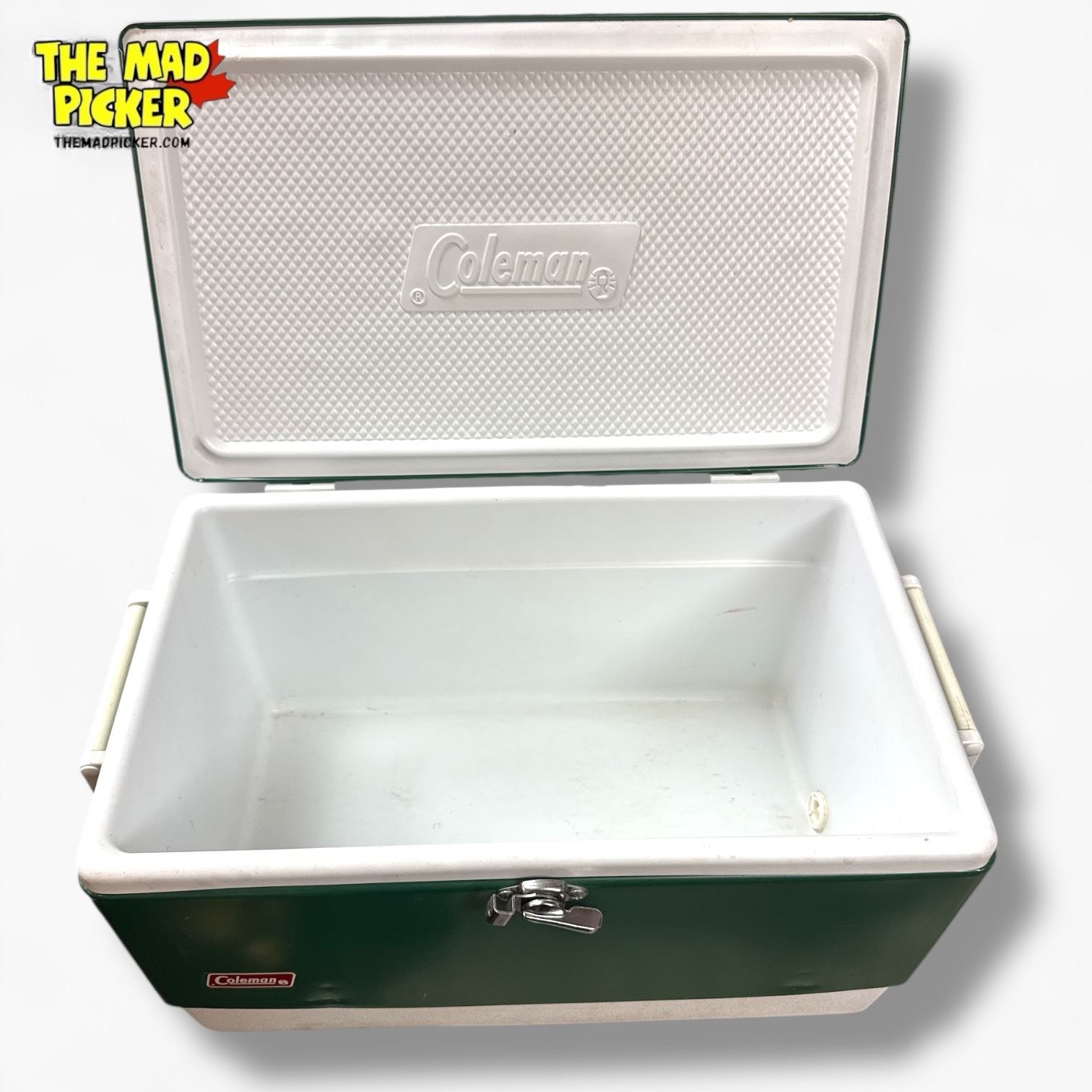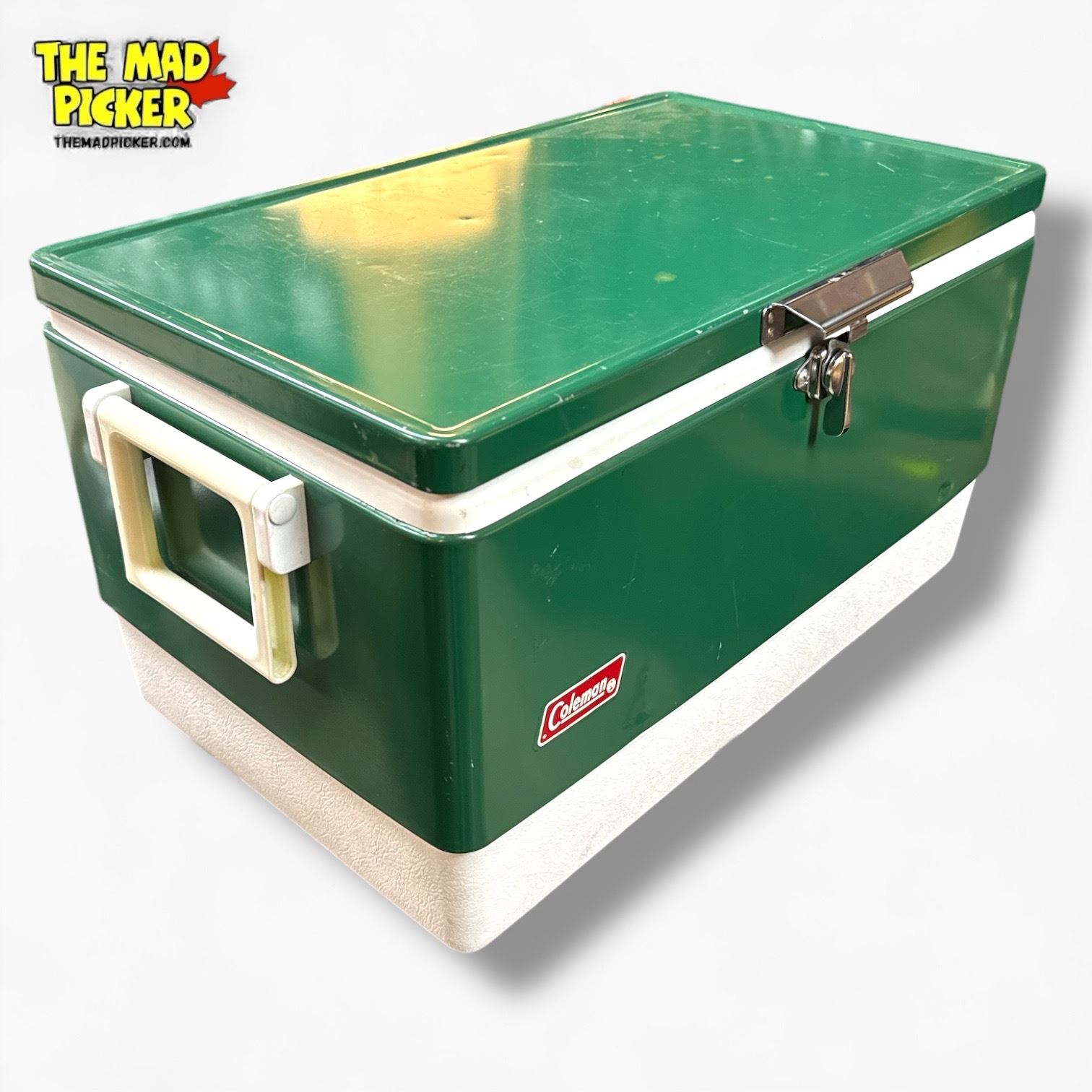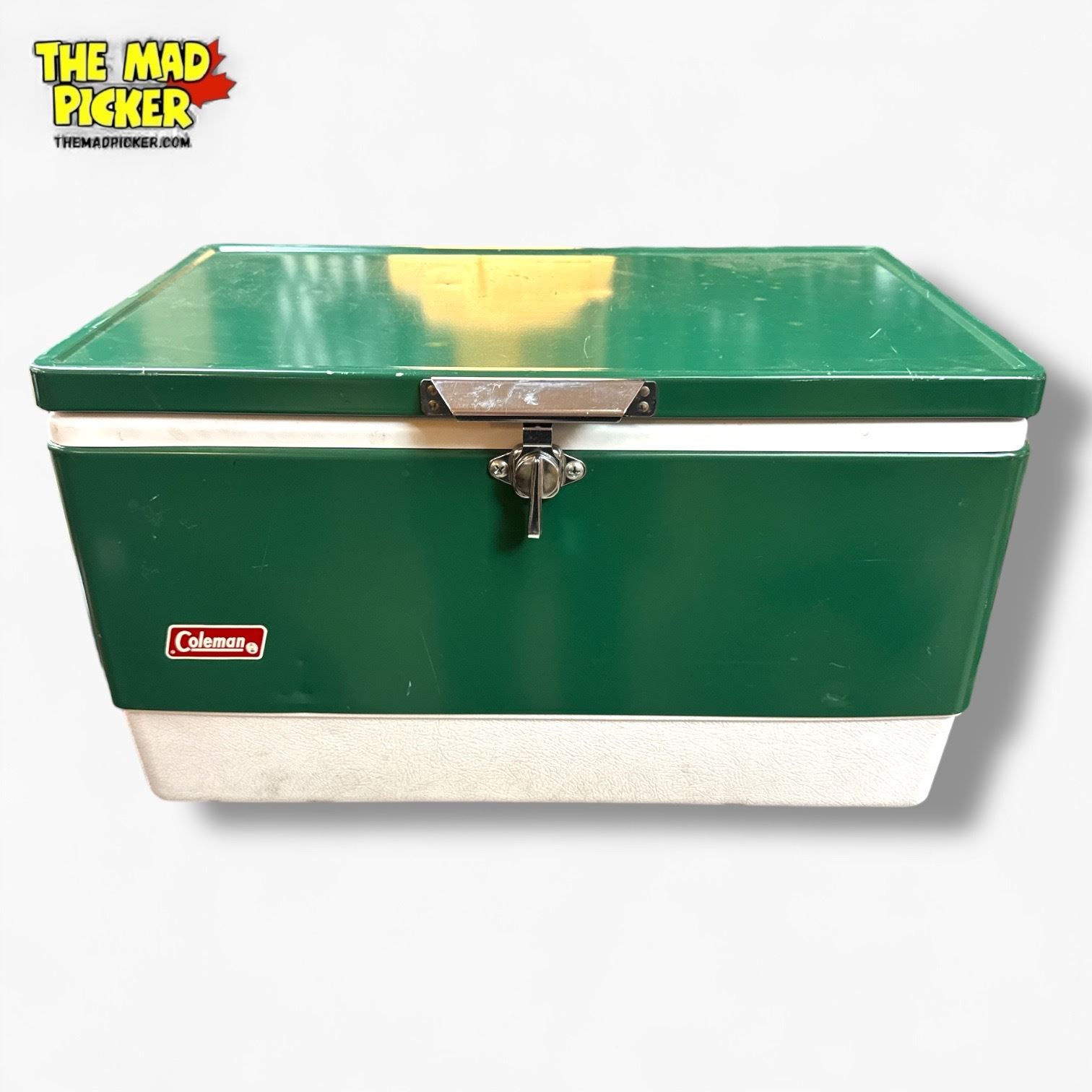 Coleman vintage 54-quart Steel Belted� cooler in green, introduced in 1954. Features a painted steel exterior, front latch, and side handles. Holds up to 85 beverage cans. Renowned for its durable construction and ability to keep ice for up to 4 days. Iconic design from the 1950s-1970s, ideal for outdoor use.