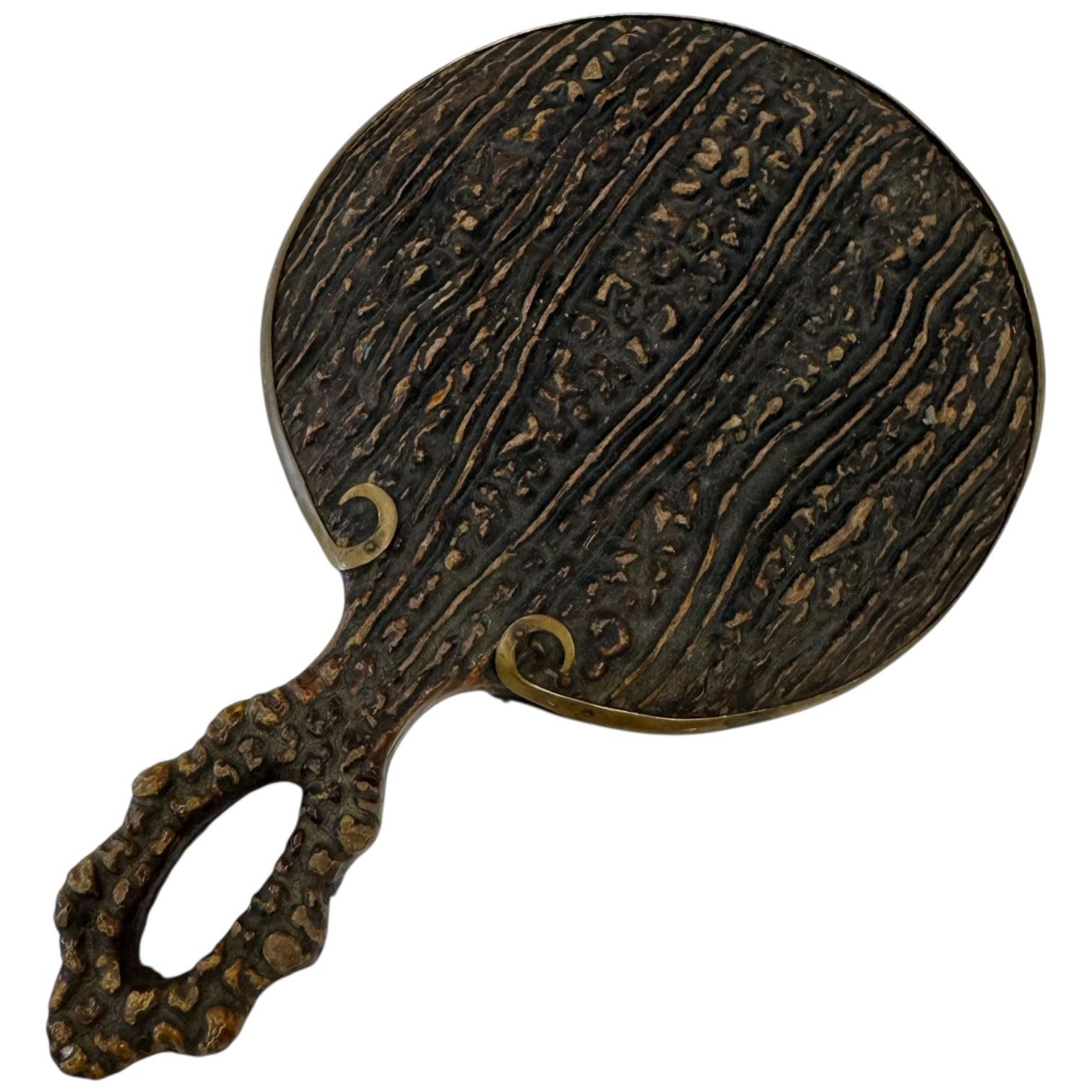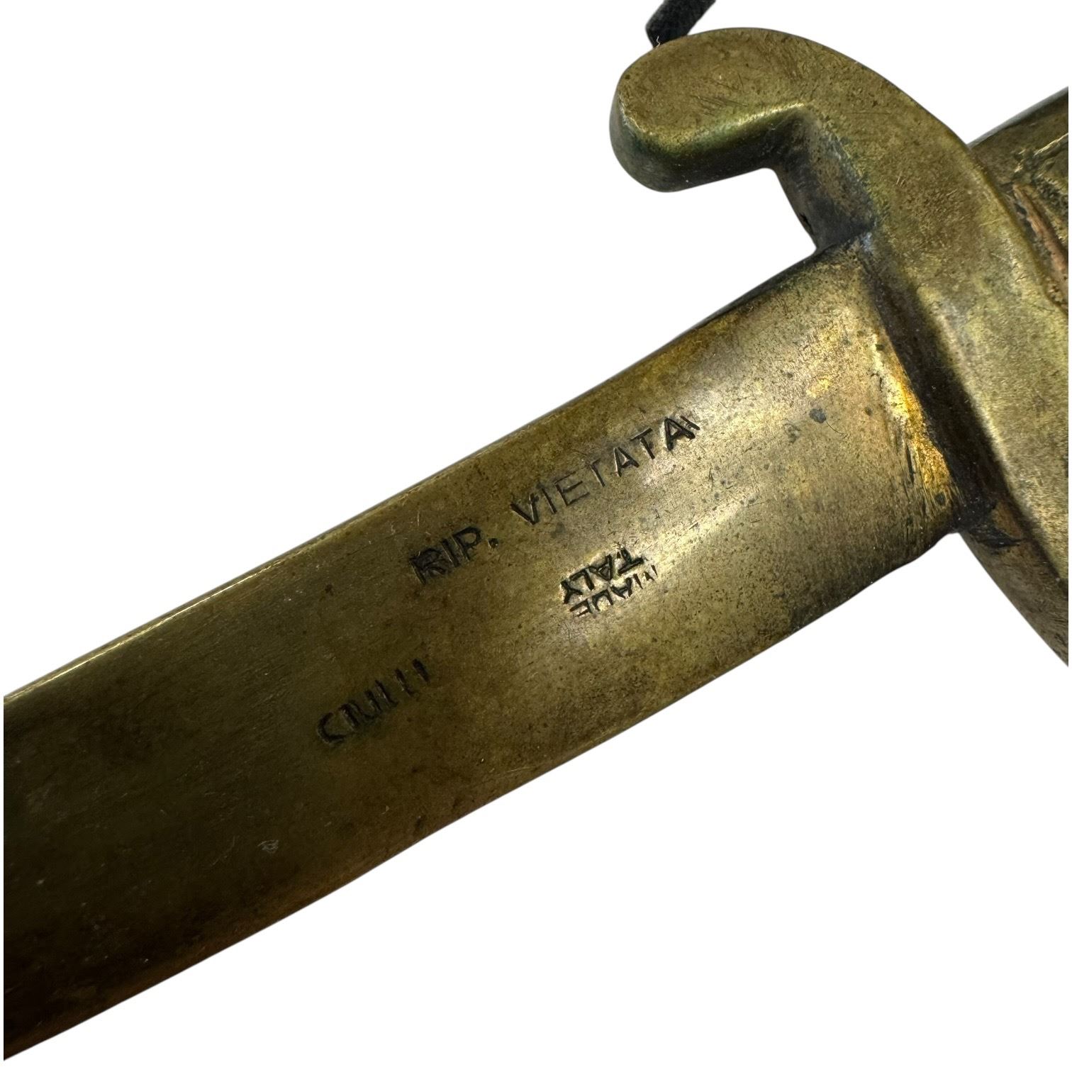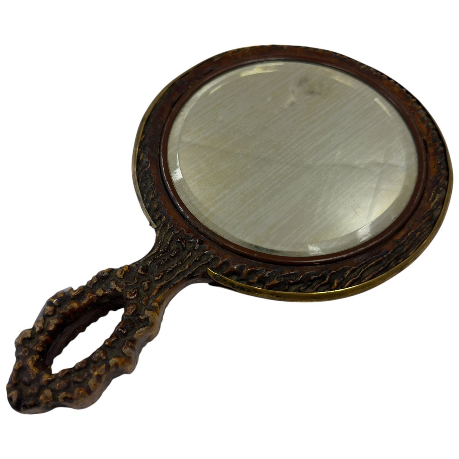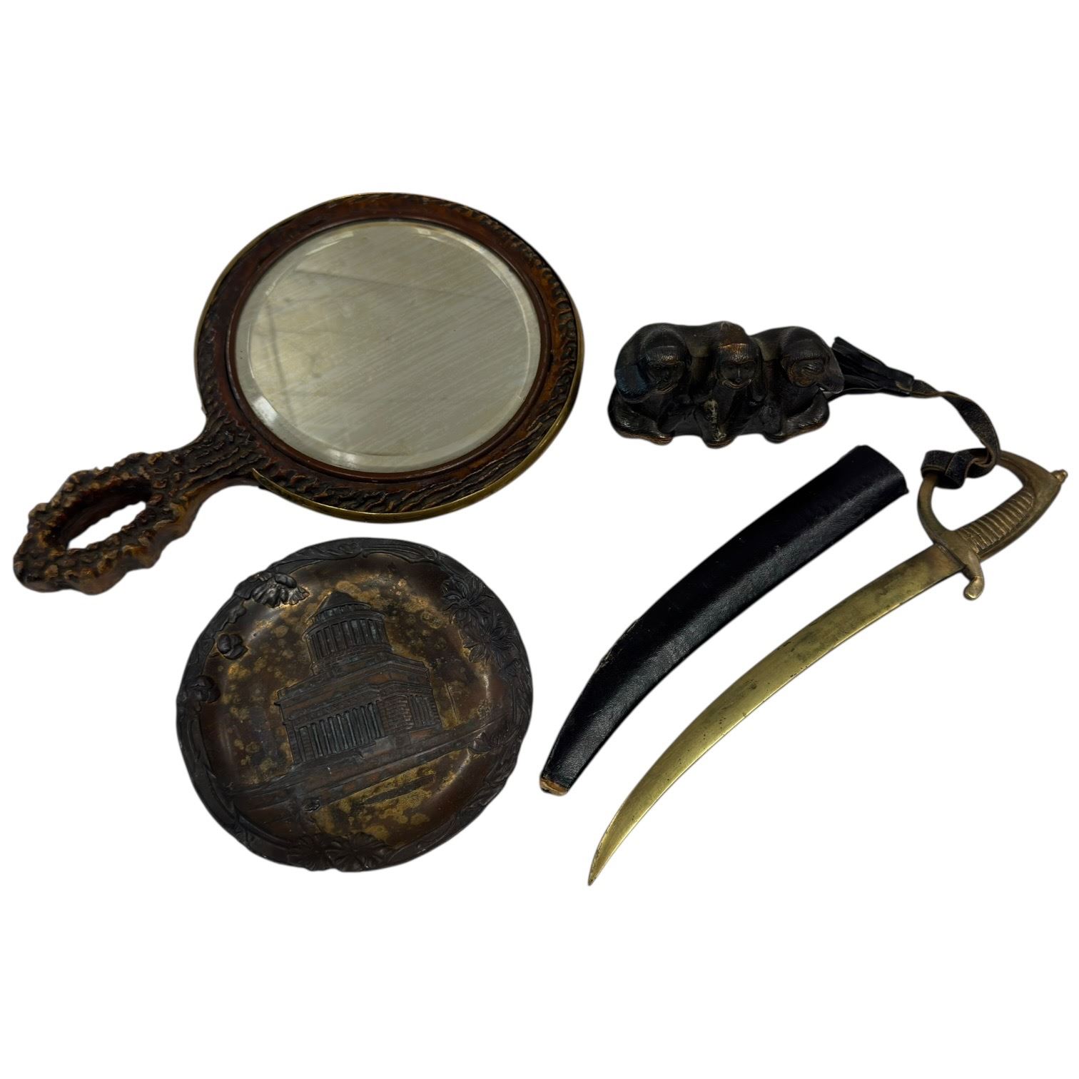 Lot of collectables including a faux stag backed mirror, Grant's Tomb souvenir ceramic ashtray, brass figurine of The Three Wise Monkeys, and a Vietta brass sabre measuring 9.5-Inch. Items are as pictured and showcase eclectic styles and materials.