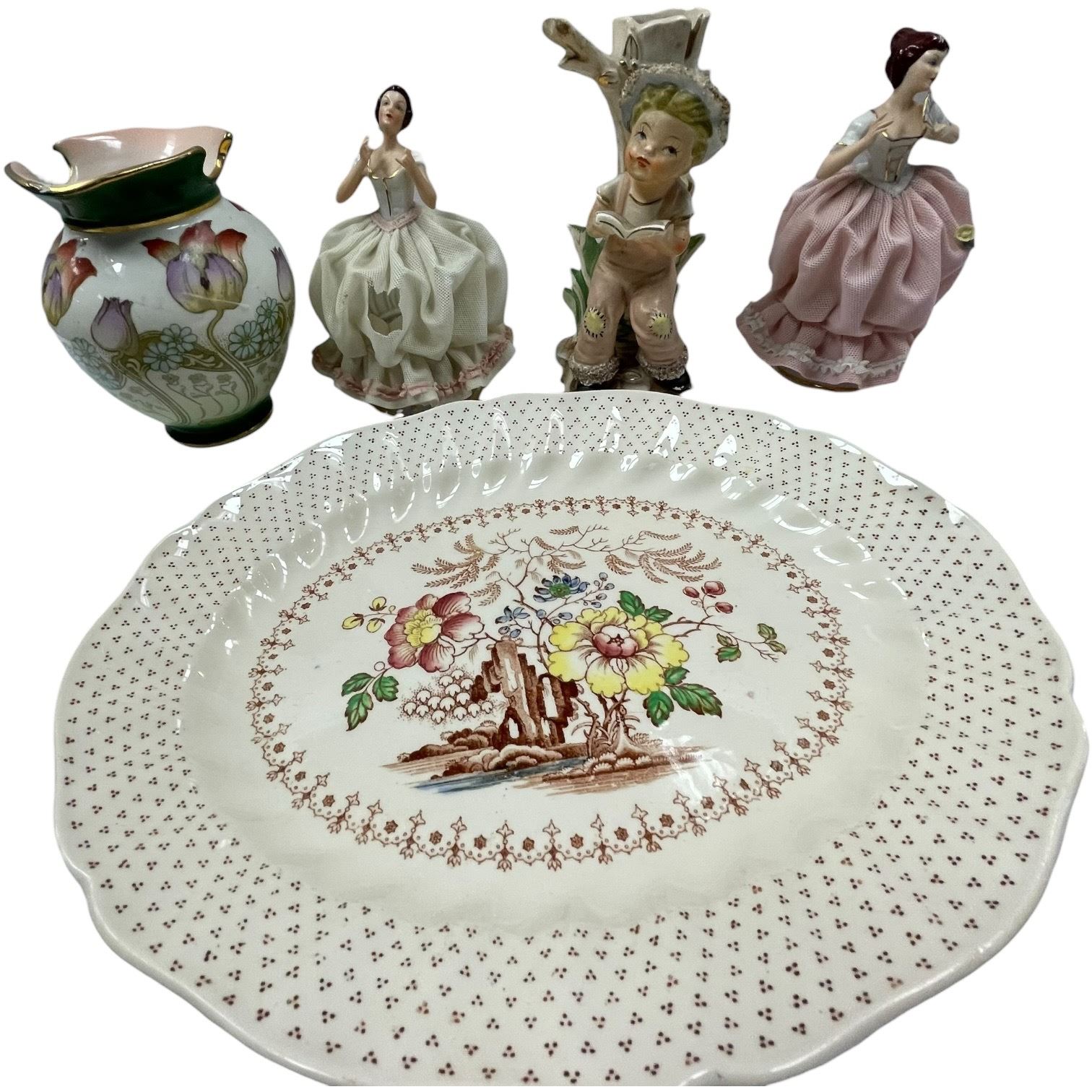 Assorted collectables lot including a crystal candy dish, Susie Cooper bone china, various figurines, dishes, and items by Beswick. Includes a mix of decorative and functional pieces. Item is as pictured.