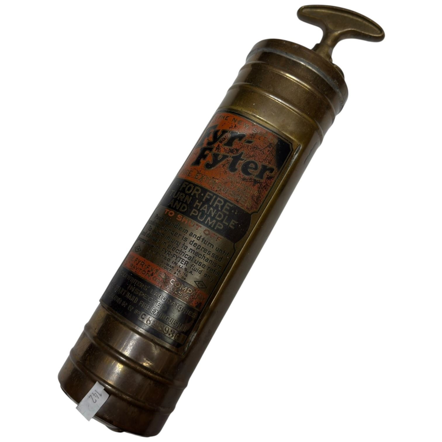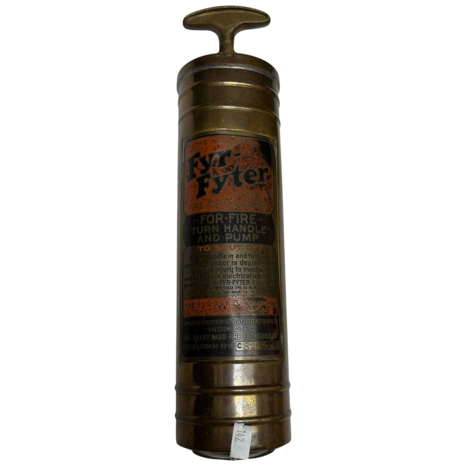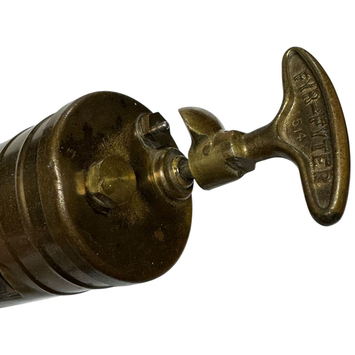 Collectible vintage Fyr-Fyter brass fire extinguisher likely from the 1920s-1940s. Manufactured by The Fyr-Fyter Company, Dayton, Ohio. Features a hand-pumped handle mechanism for liquid expulsion. Historically used in cars, trucks, and aircraft, especially during the WWII era. Measures 14-Inch long.