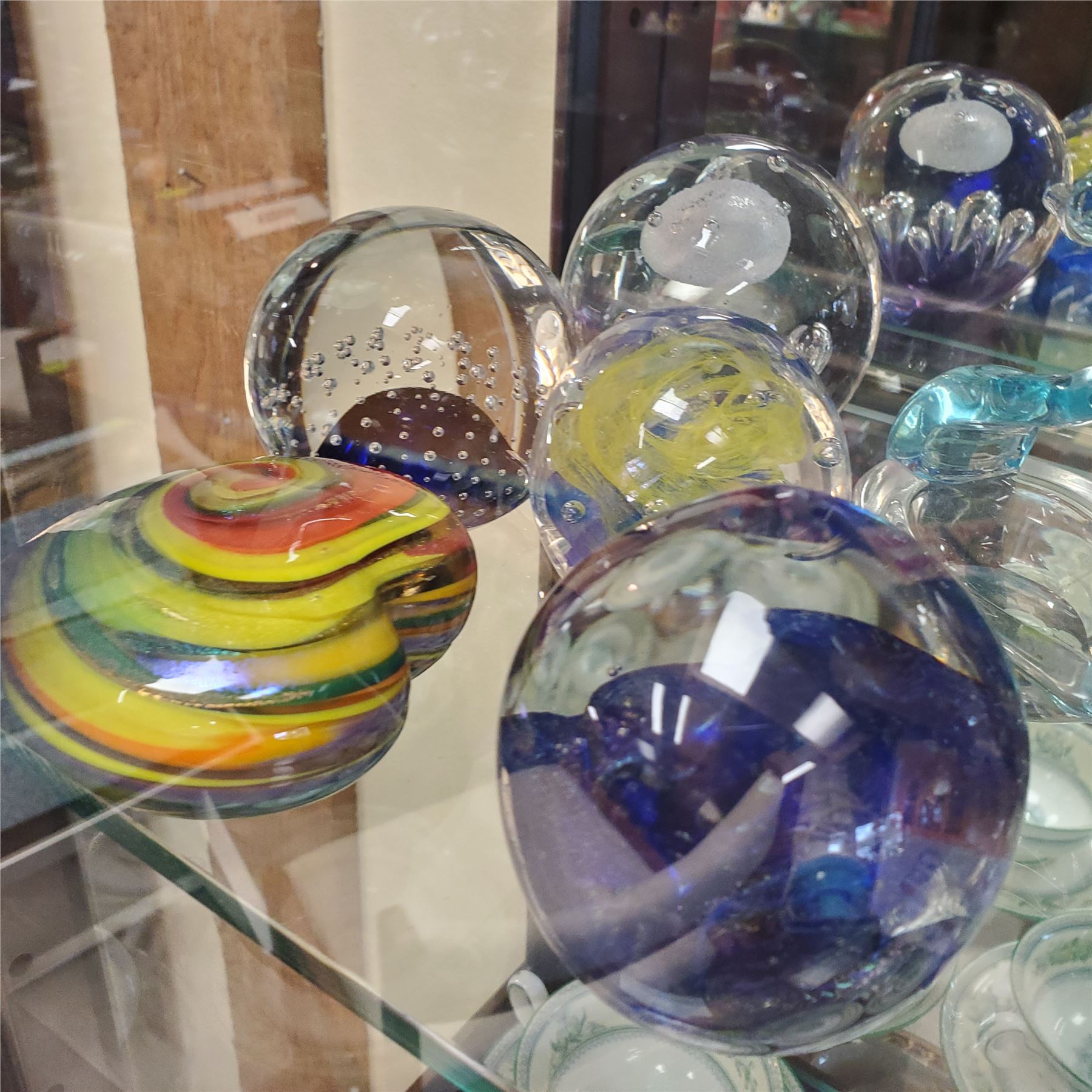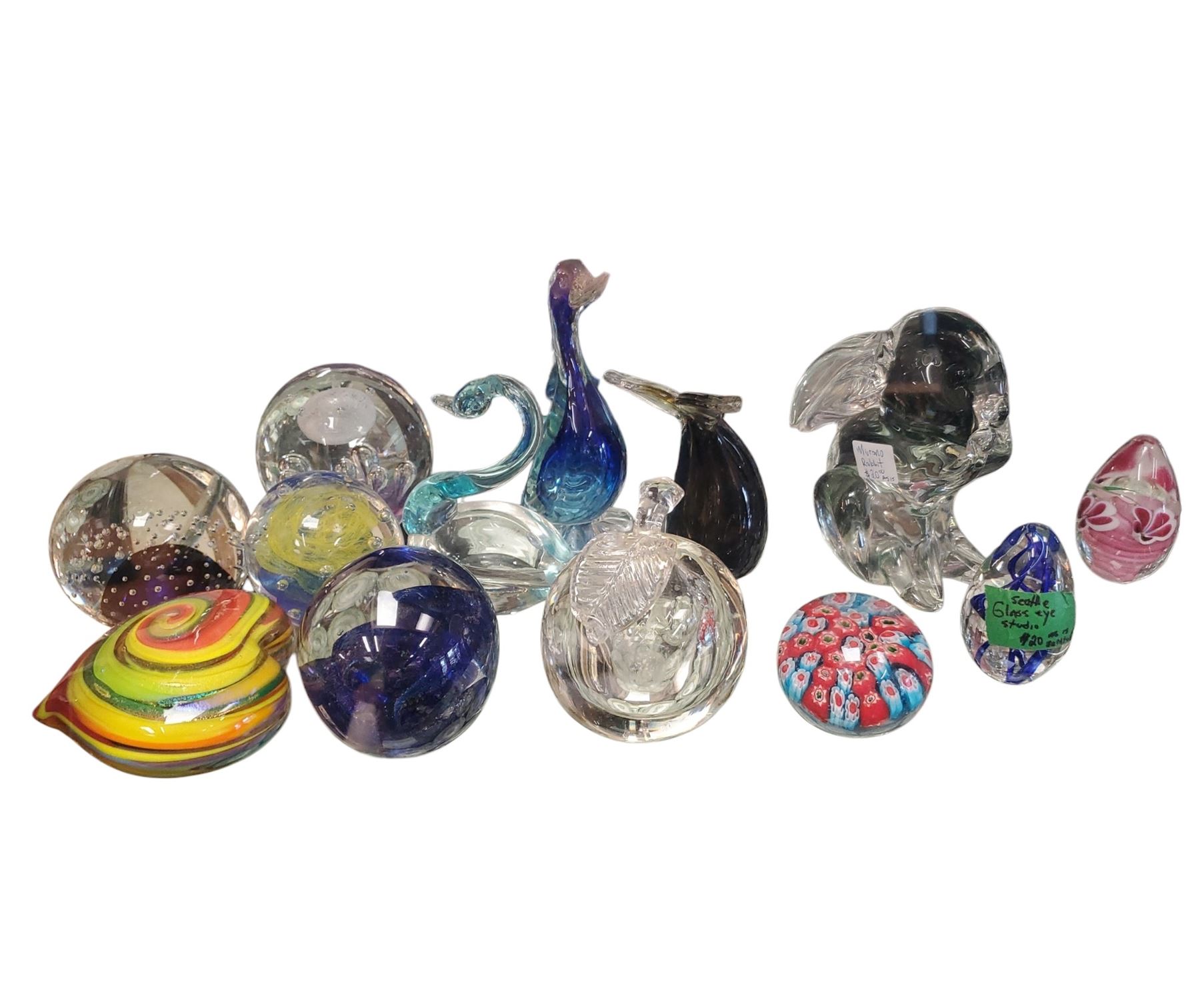 Collection of 13 art glass pieces from Arte Vargas, Mad Art, Bills, Murano, Millford & Glasseye Studio. Includes various forms and styles, with the tallest piece measuring 6-Inch. Known for handcrafted designs and vibrant colors. Item is as pictured.