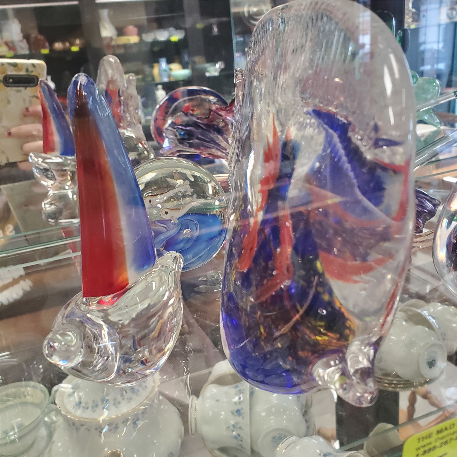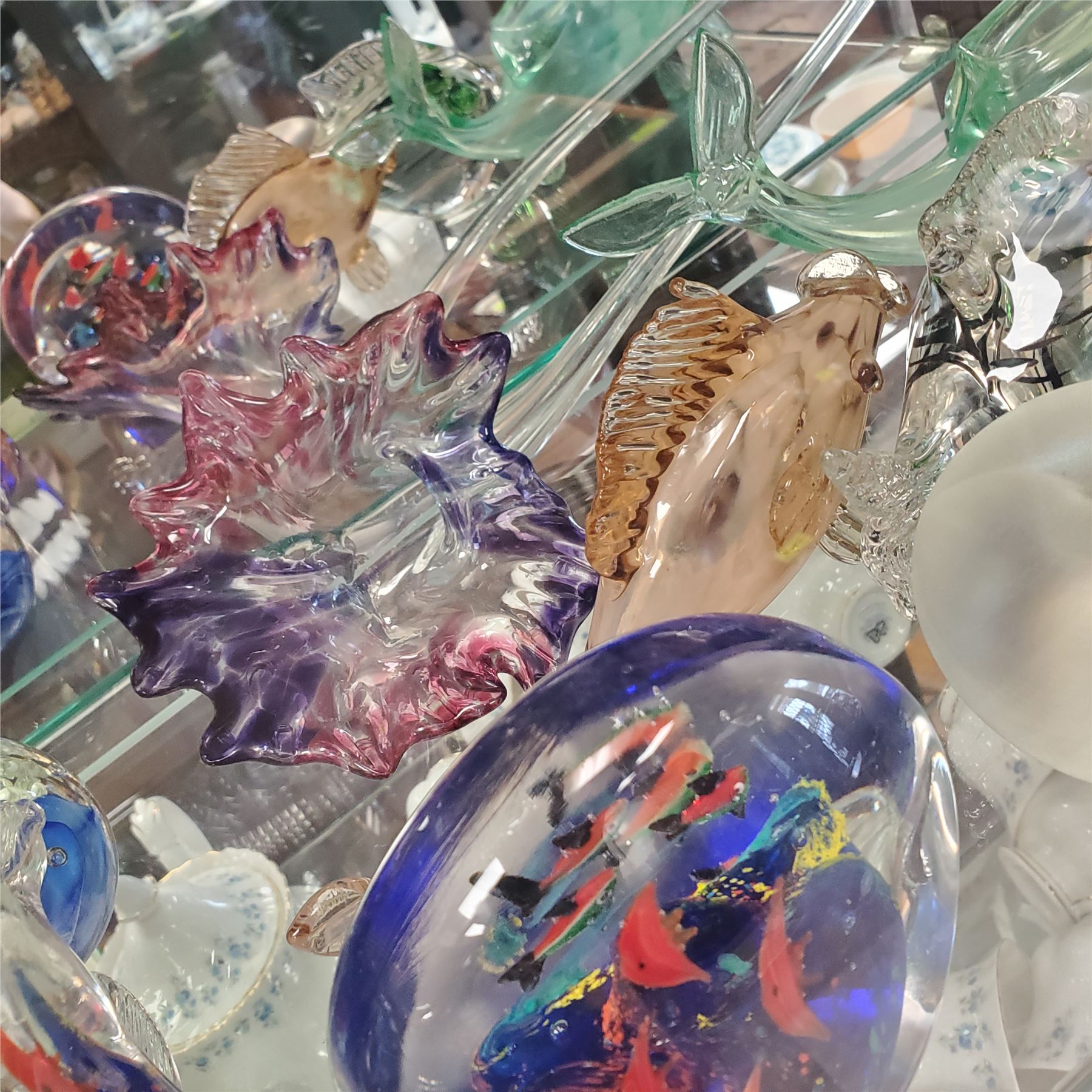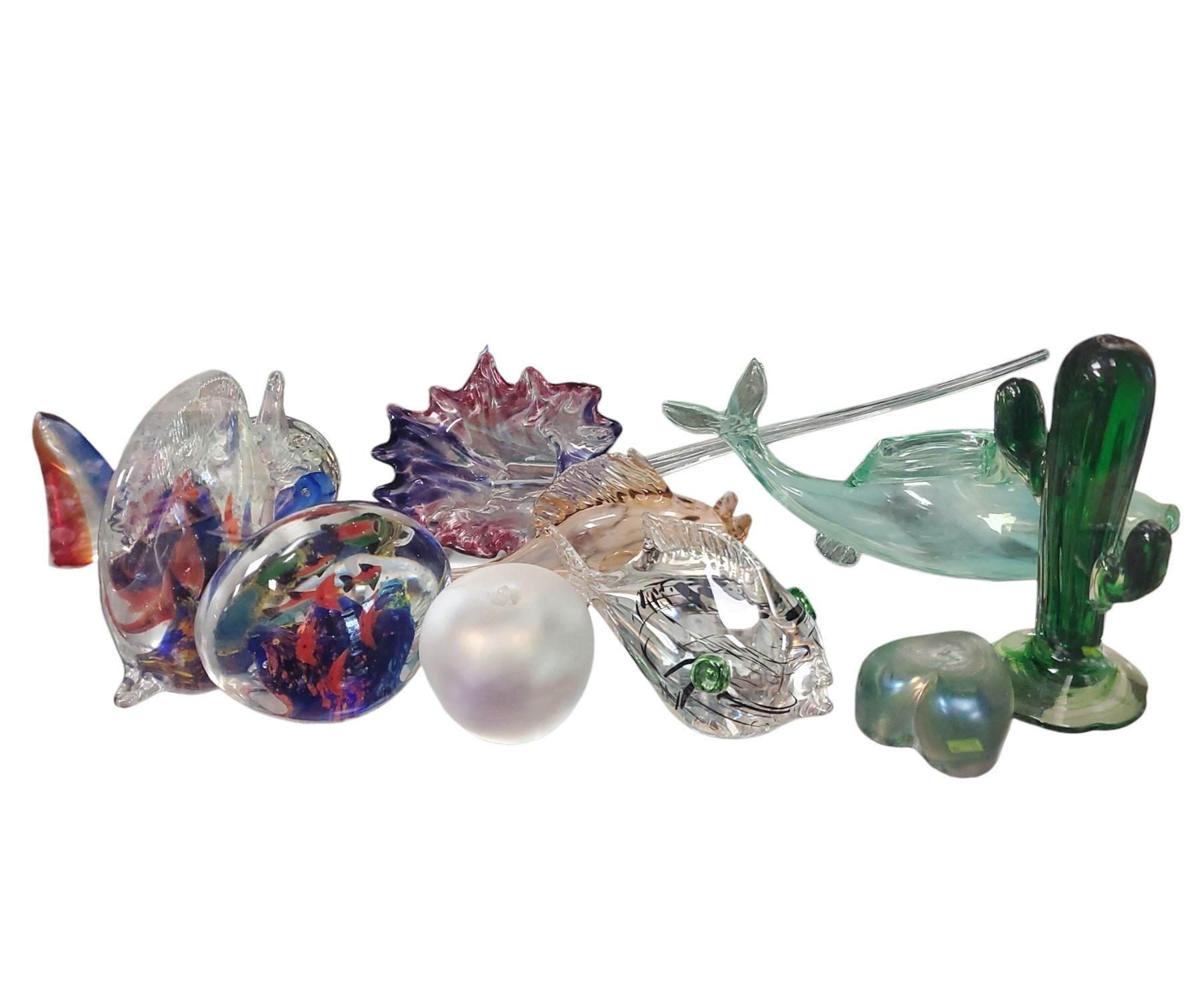 Lot of 10 art glass pieces featuring Arte Vargas, Swedish Glass, Murano & other makers. Includes various forms with the tallest piece measuring 6.25-Inch. Includes a mix of blown glass techniques and designs. Item is as pictured.