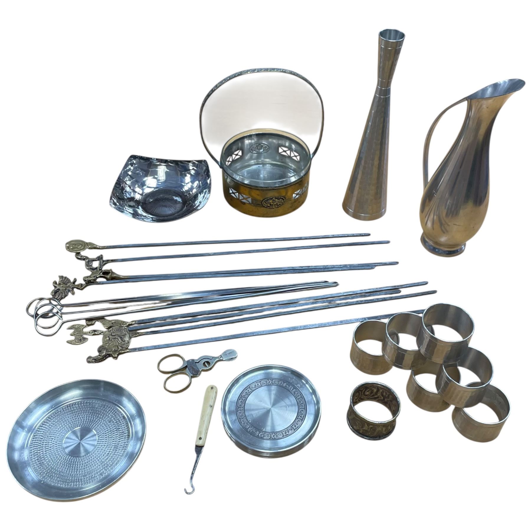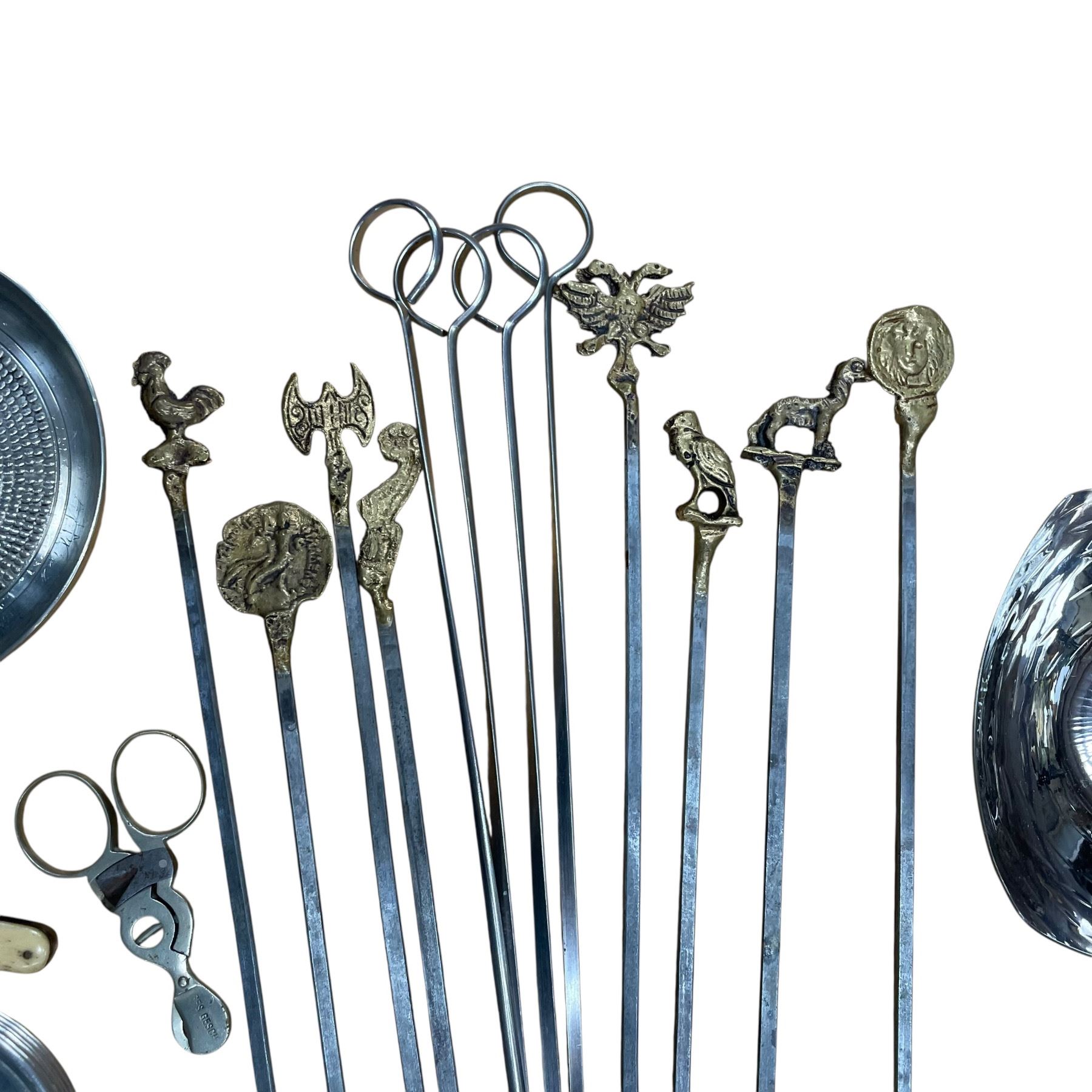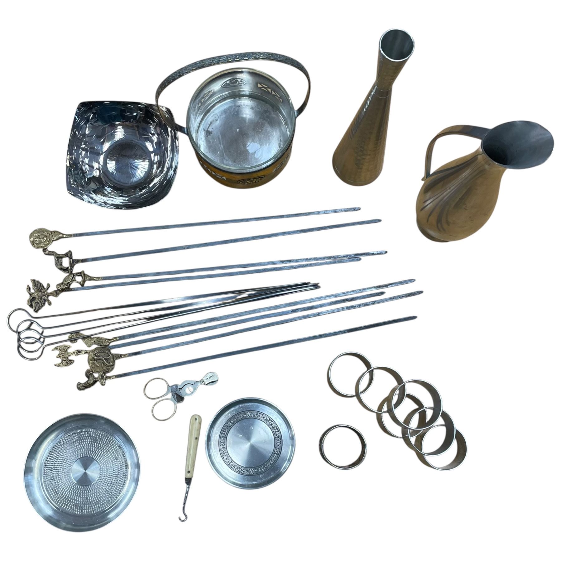 Collection includes various pewter items paired with brass topped skewers. Tallest pewter vase measures 8.25-Inch in height. Group showcases mixed metal craftsmanship. Item is as pictured.