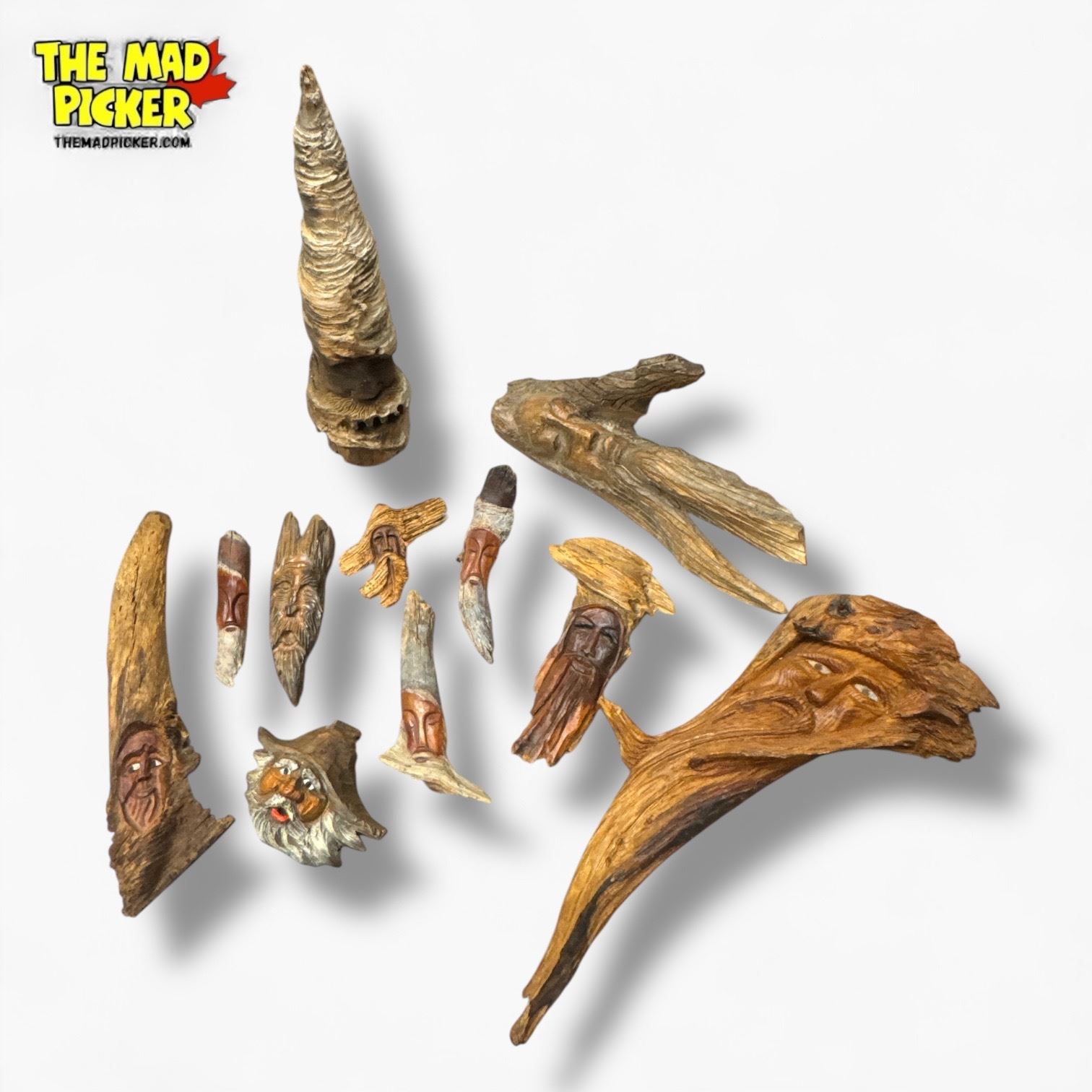 Collection of folk art carvings depicting old men with beards, crafted from natural driftwood. Unique, hand-carved pieces showcasing expressive faces. Likely created in the mid-20th century, origins unknown. Material retains natural grain and weathering typical of driftwood sculptures.