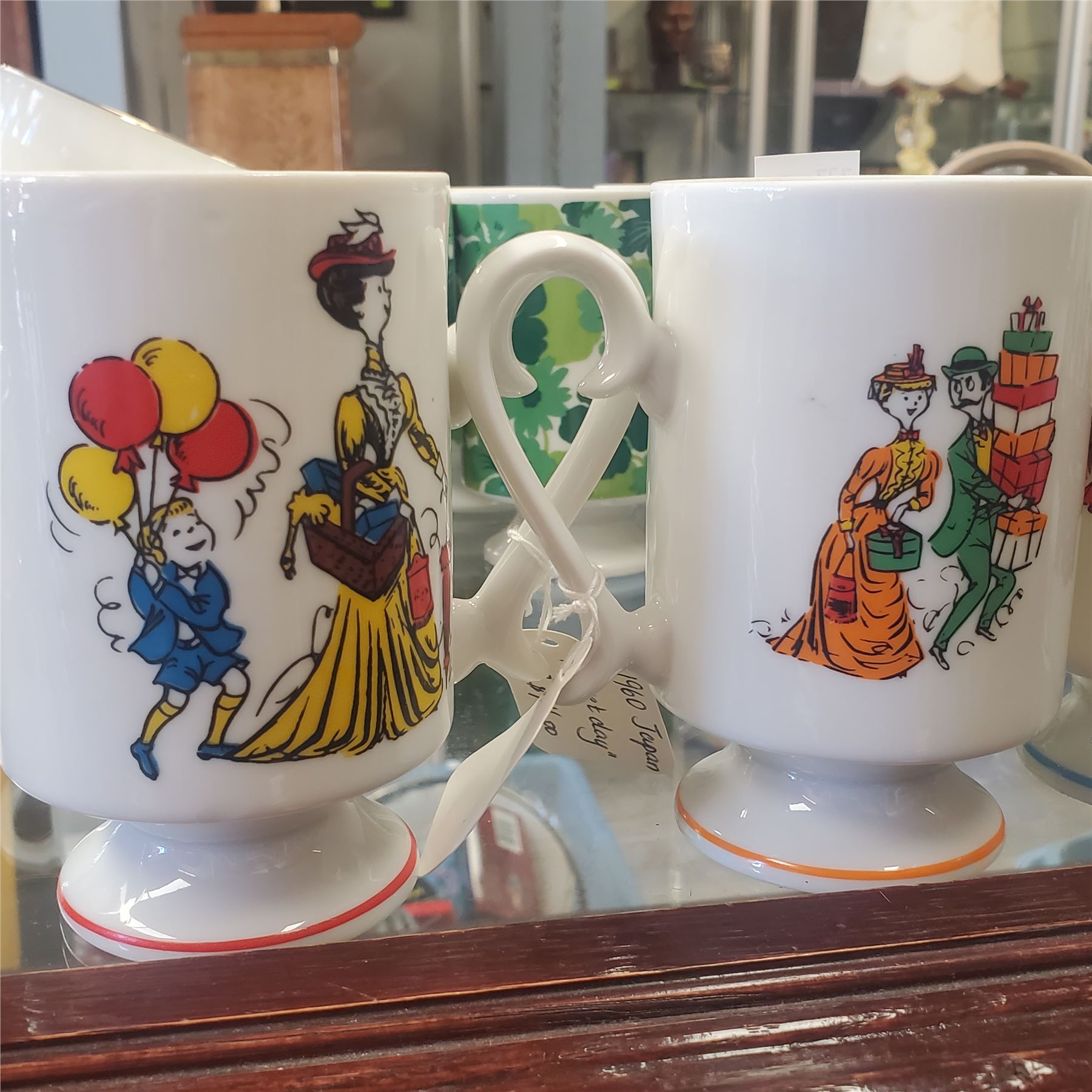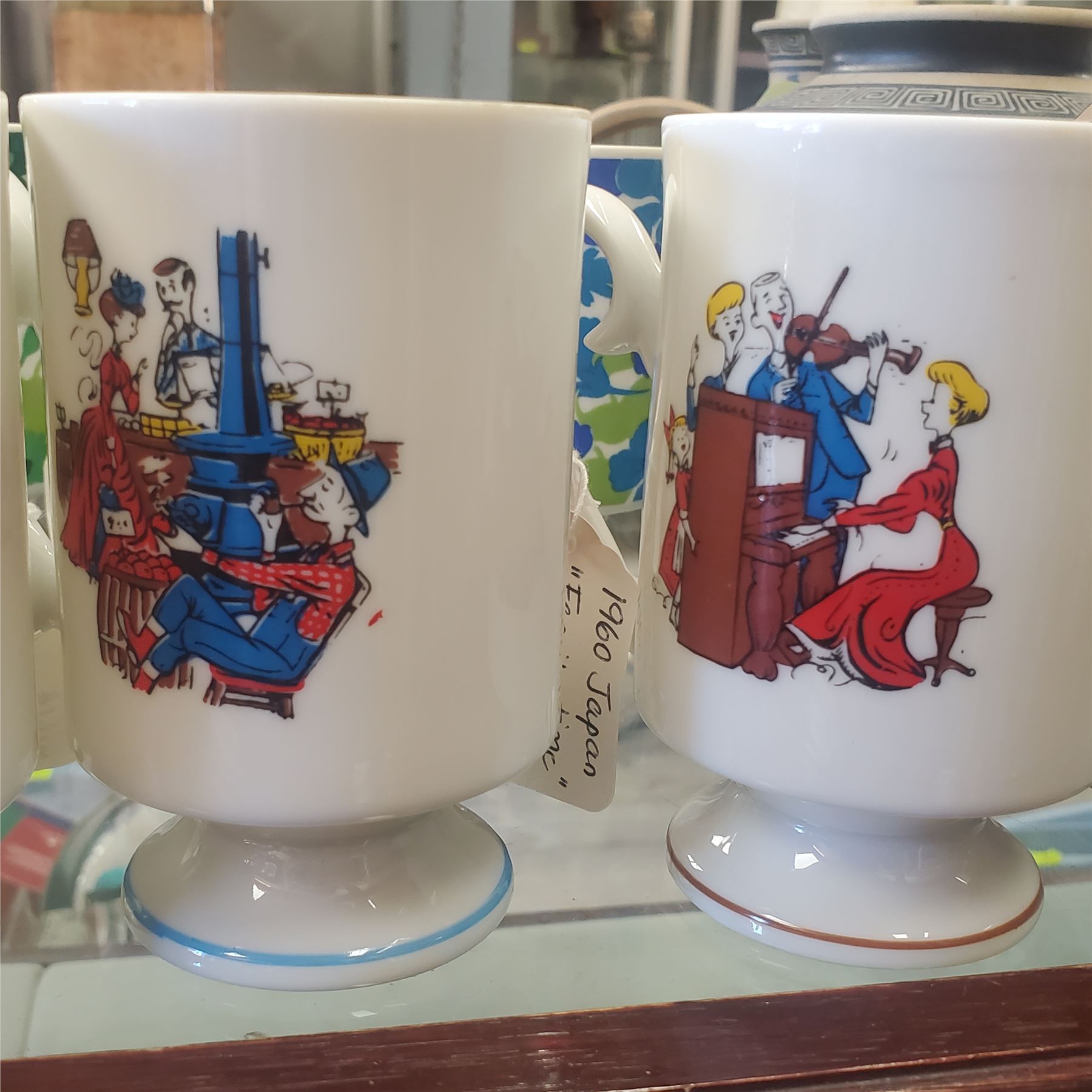 Collection of 11 vintage Japan mugs designed for hot drinks such as coffee or tea. Each mug features 'Family Time' motifs and was made in Japan. Items display vintage styling and are as pictured. Ideal for decorative use or functional purposes.
